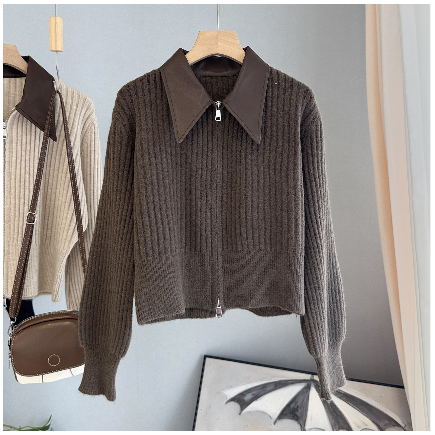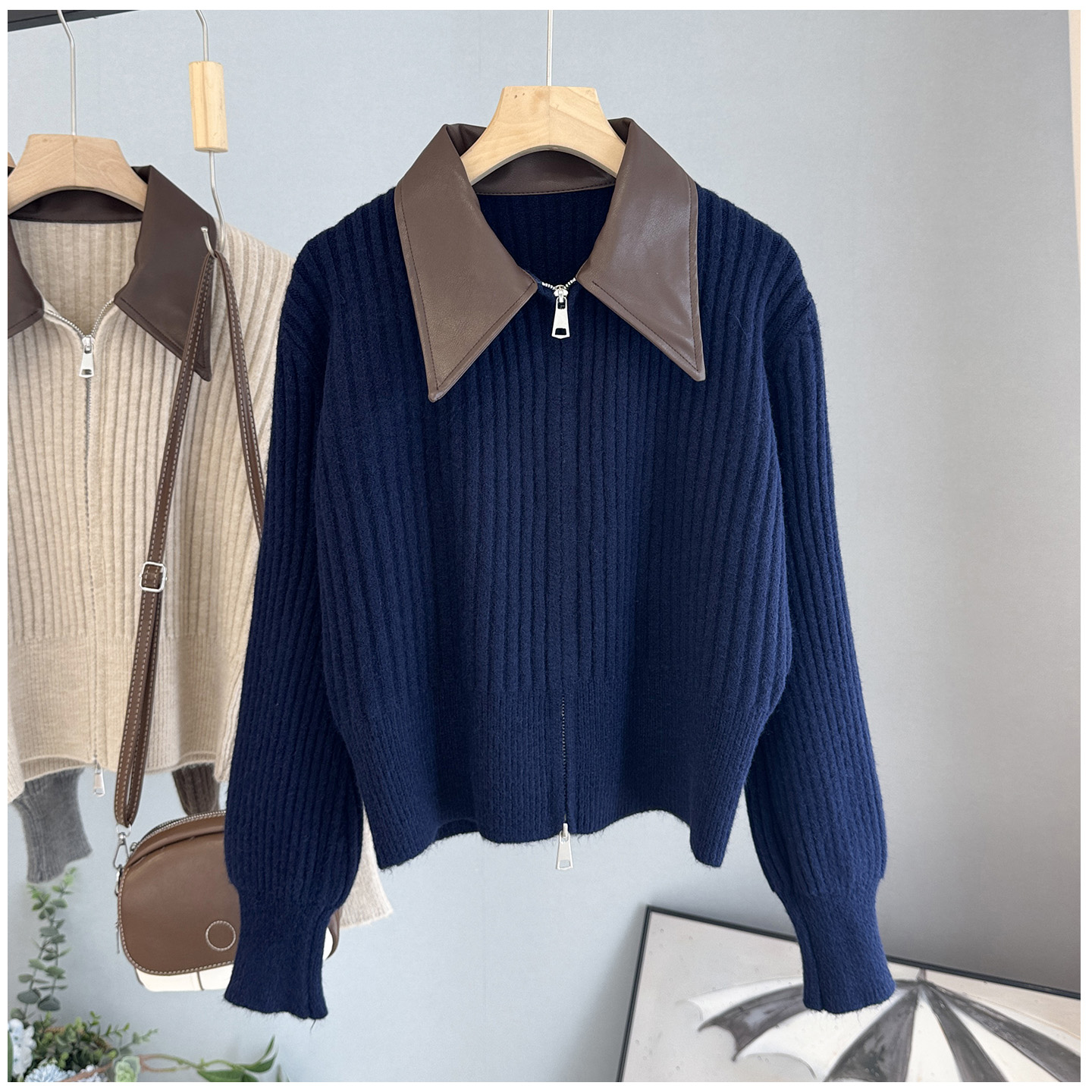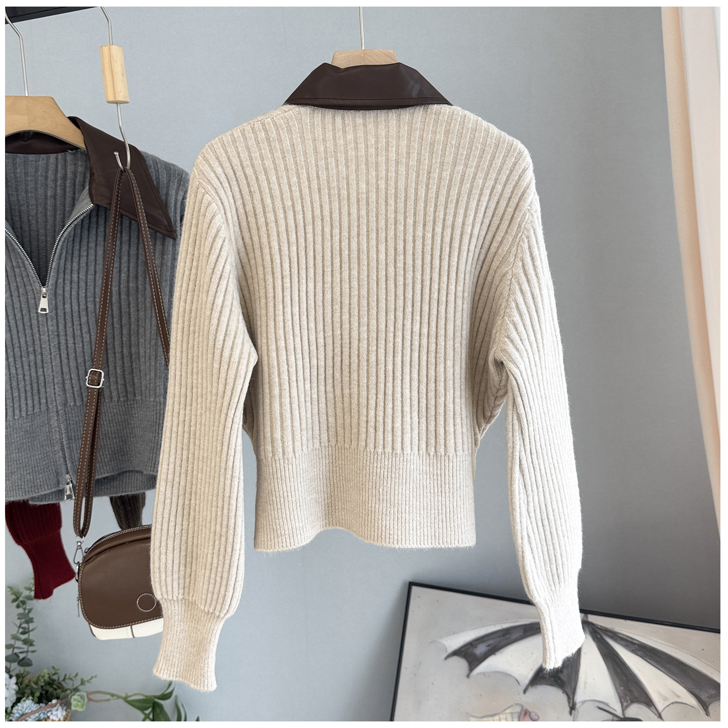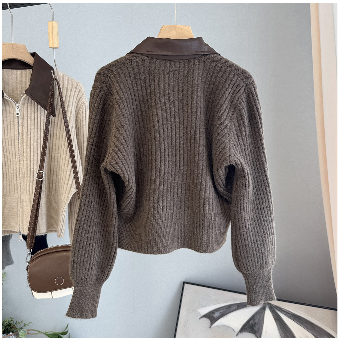 設計感拼接皮領毛衣外套女2025秋裝新款韓版修身顯瘦針織開衫上衣