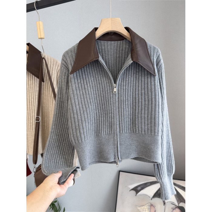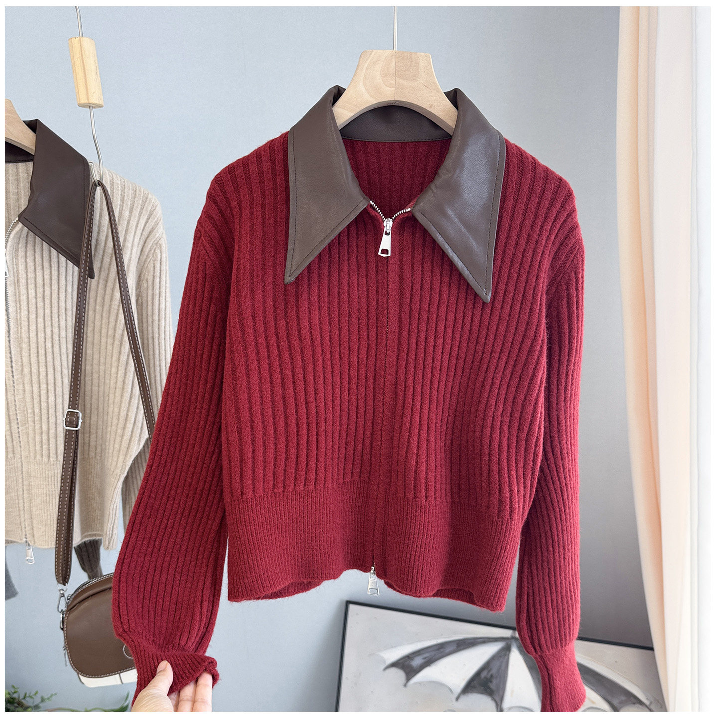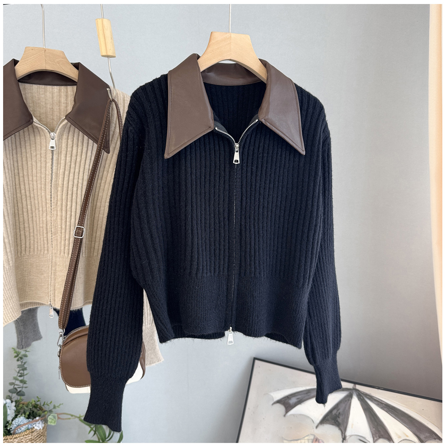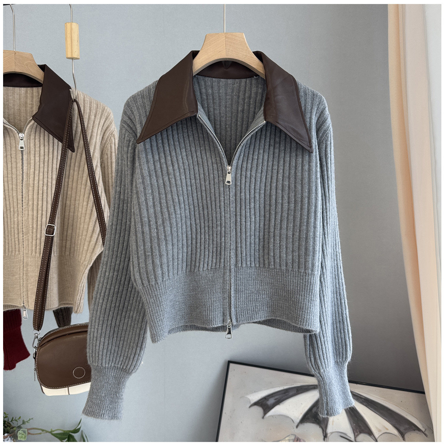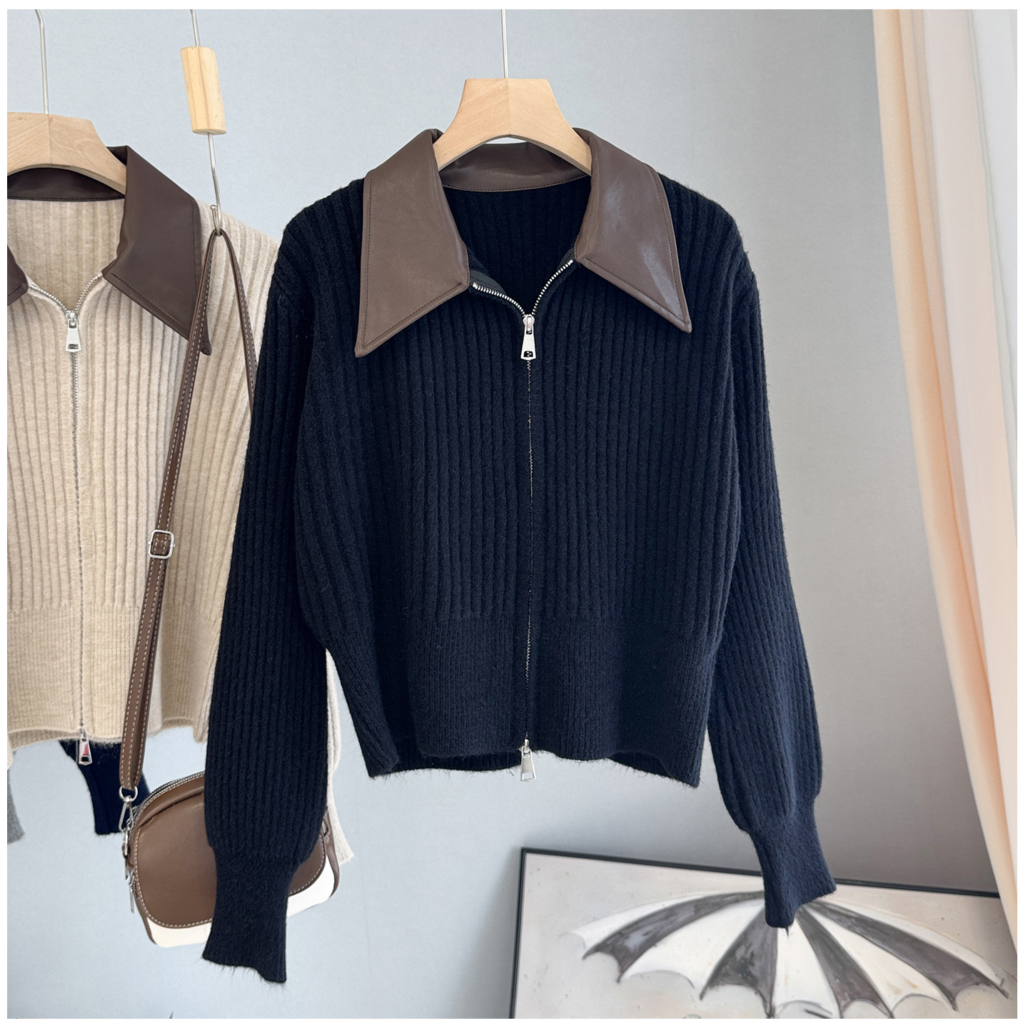 設計感拼接皮領毛衣外套女2025秋裝新款韓版修身顯瘦針織開衫上衣