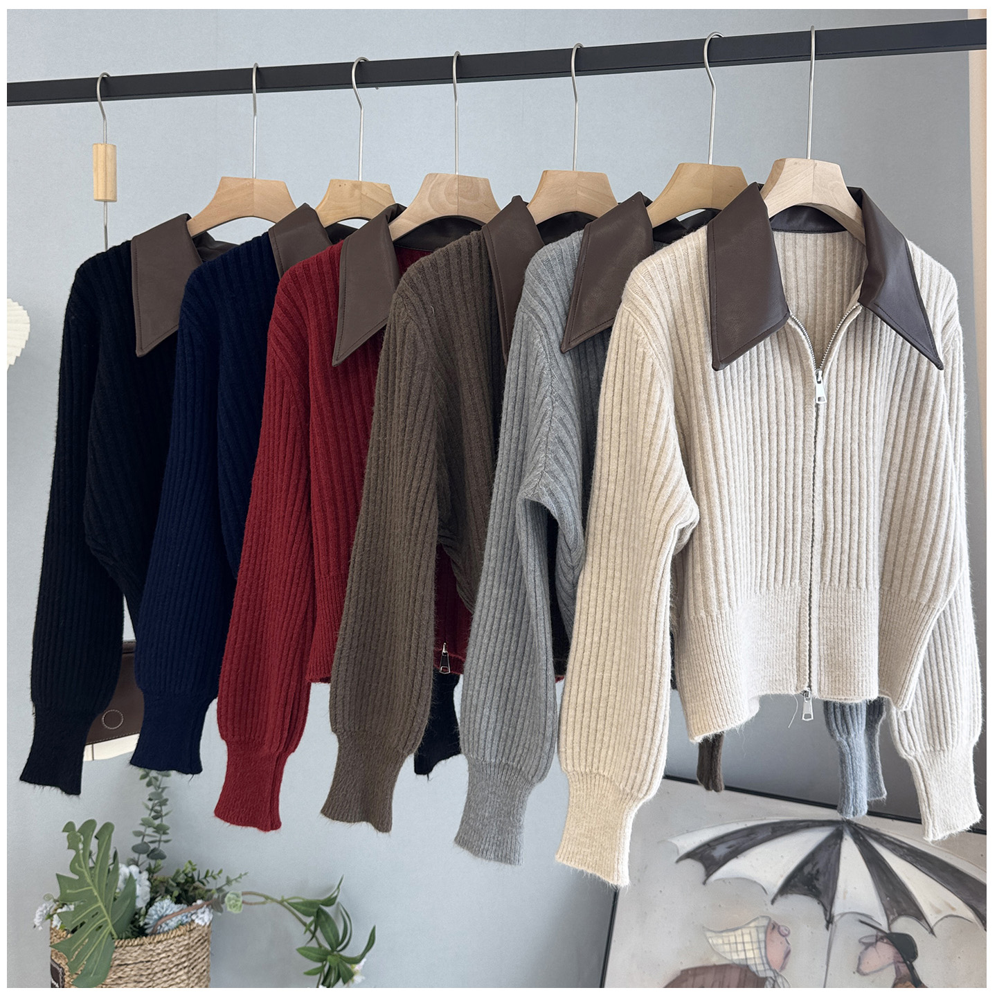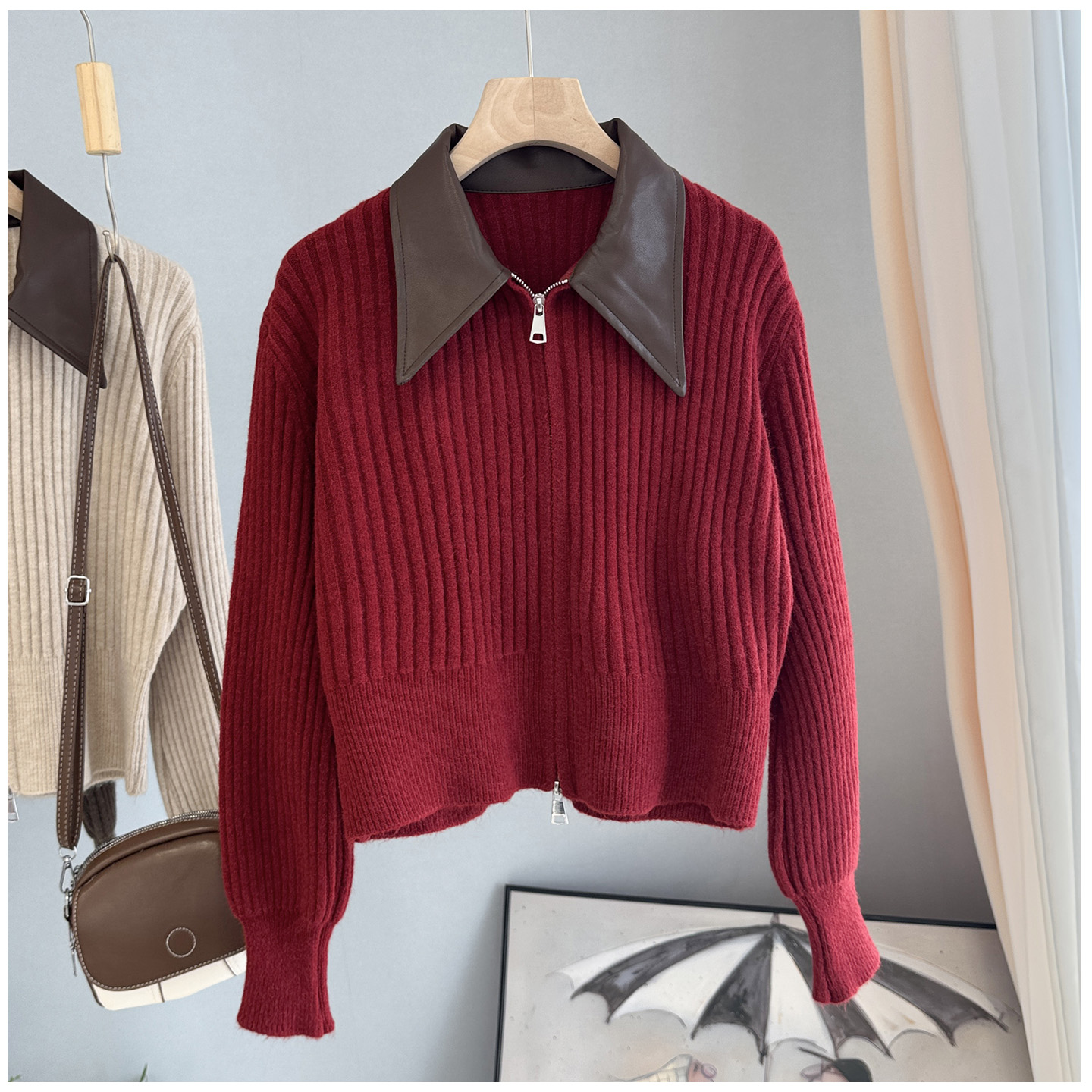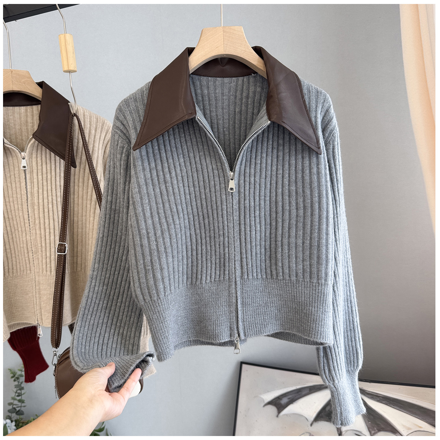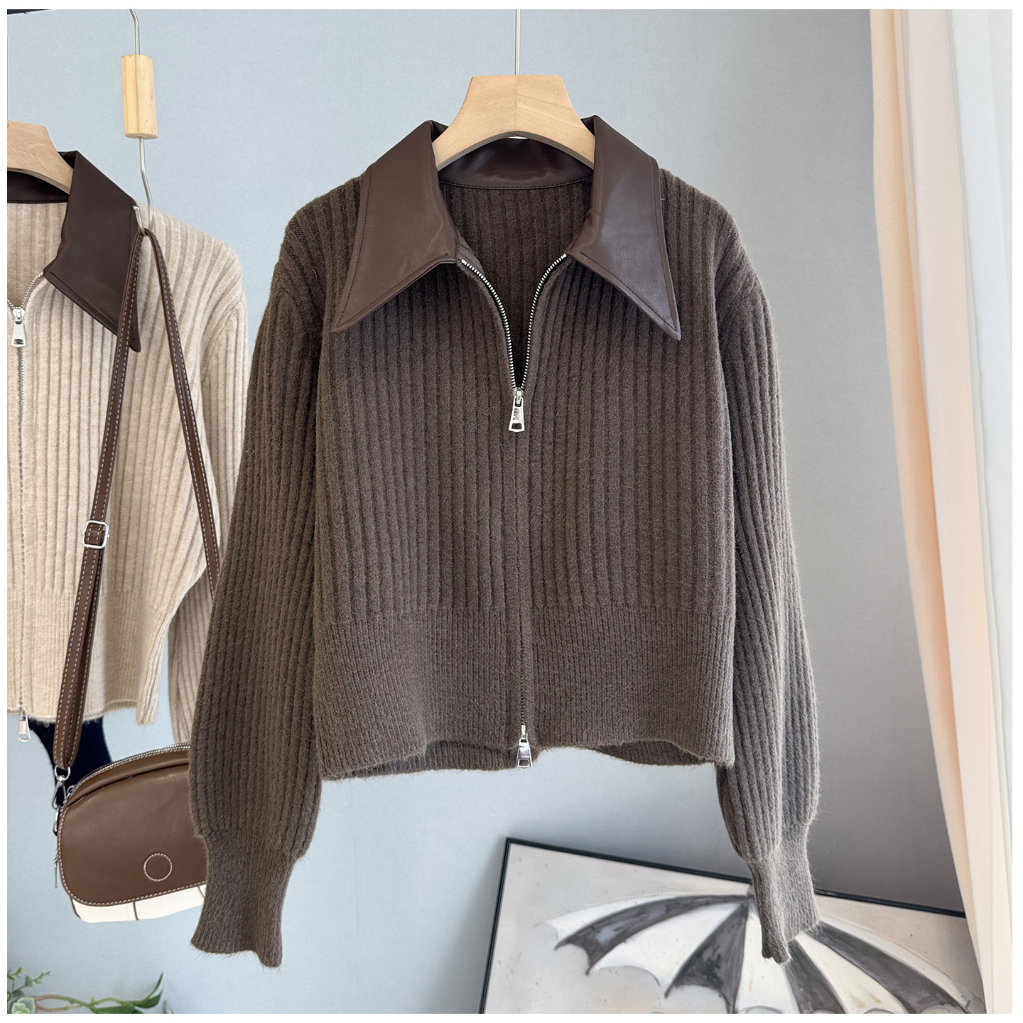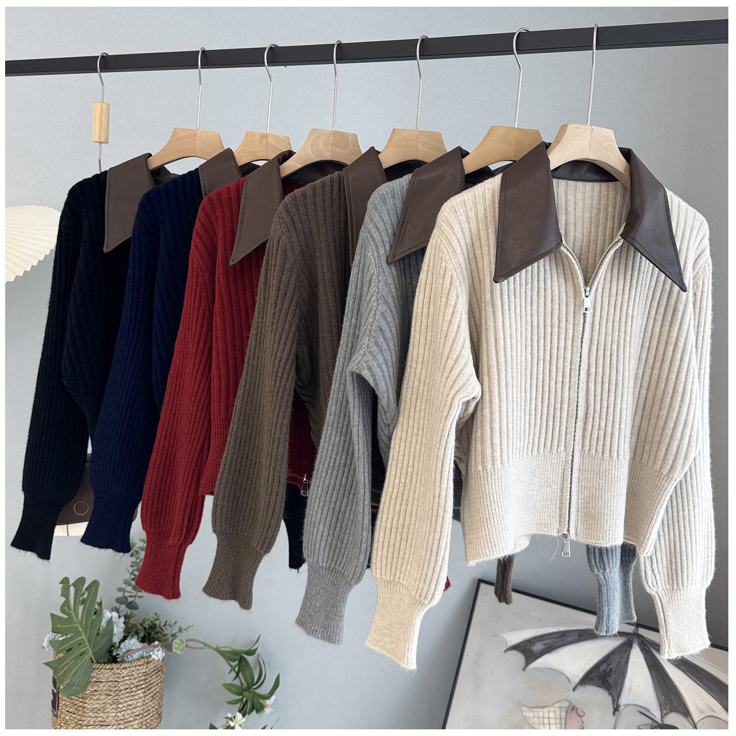 設計感拼接皮領毛衣外套女2025秋裝新款韓版修身顯瘦針織開衫上衣