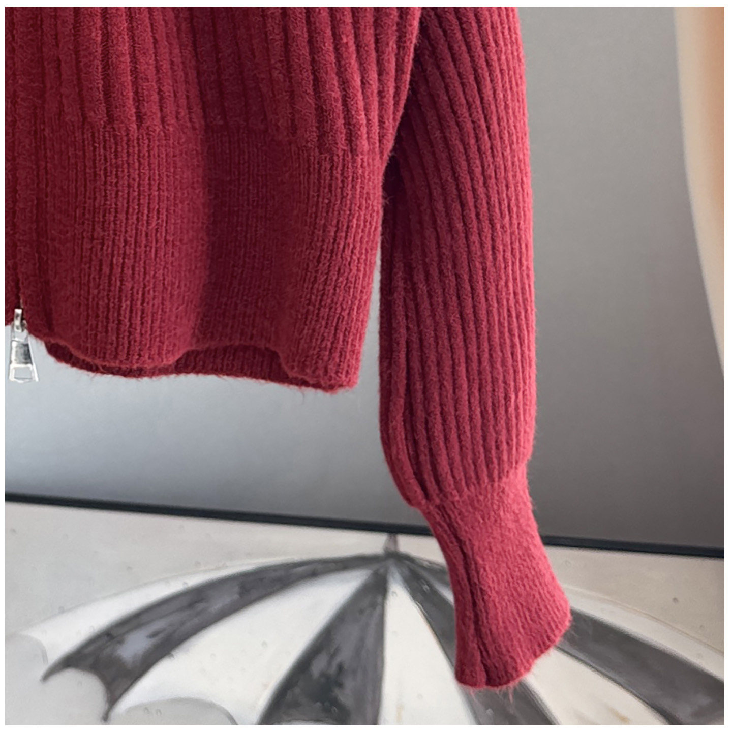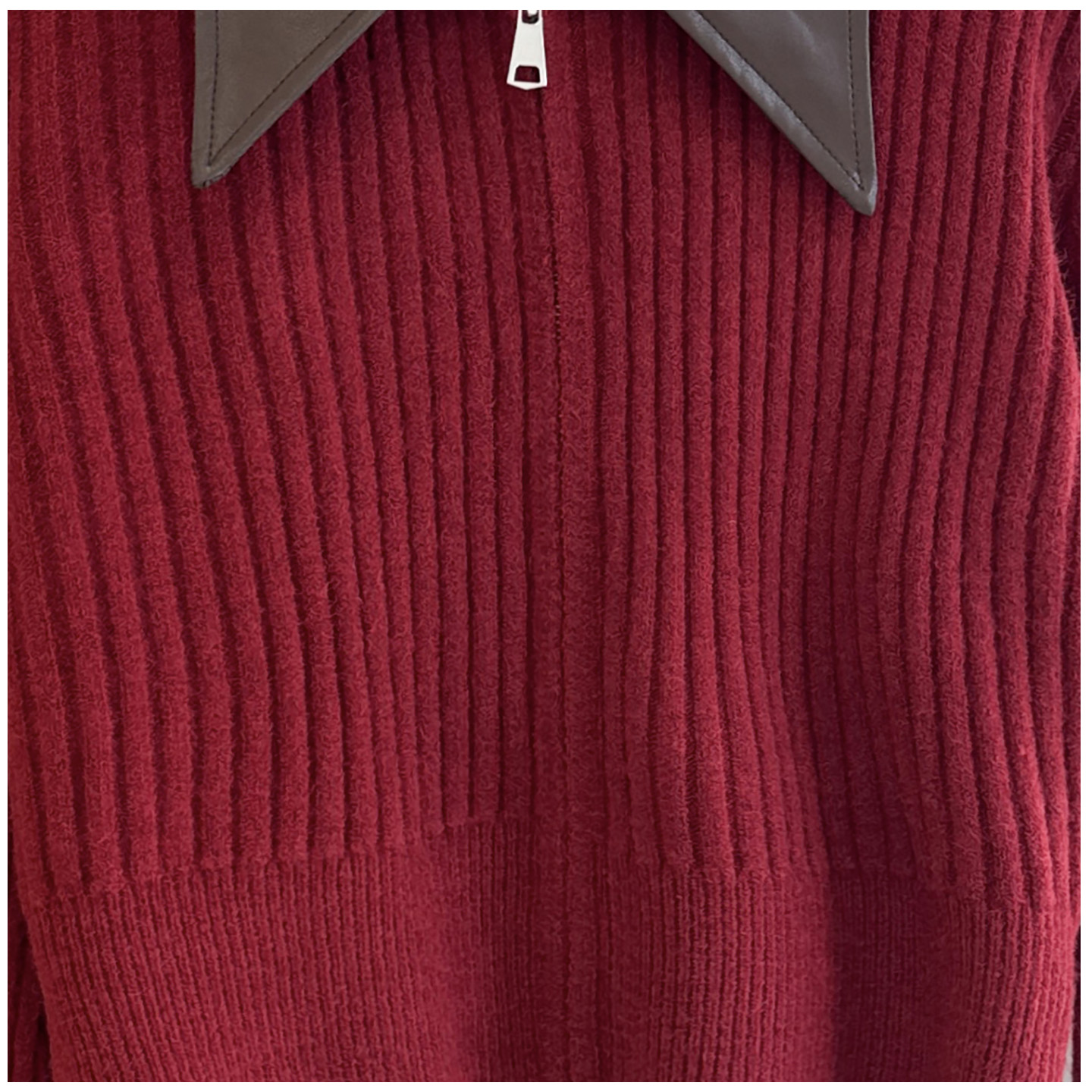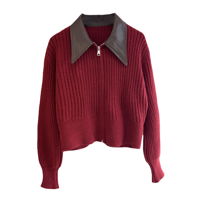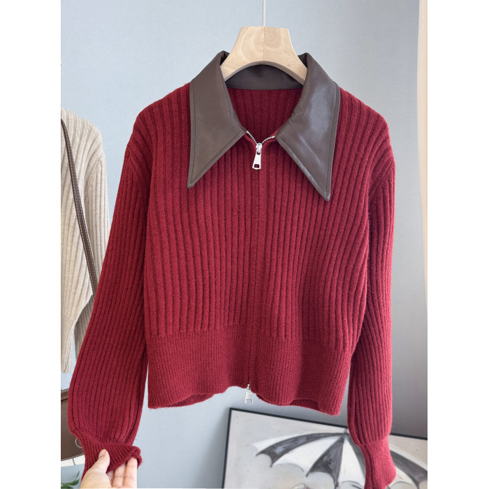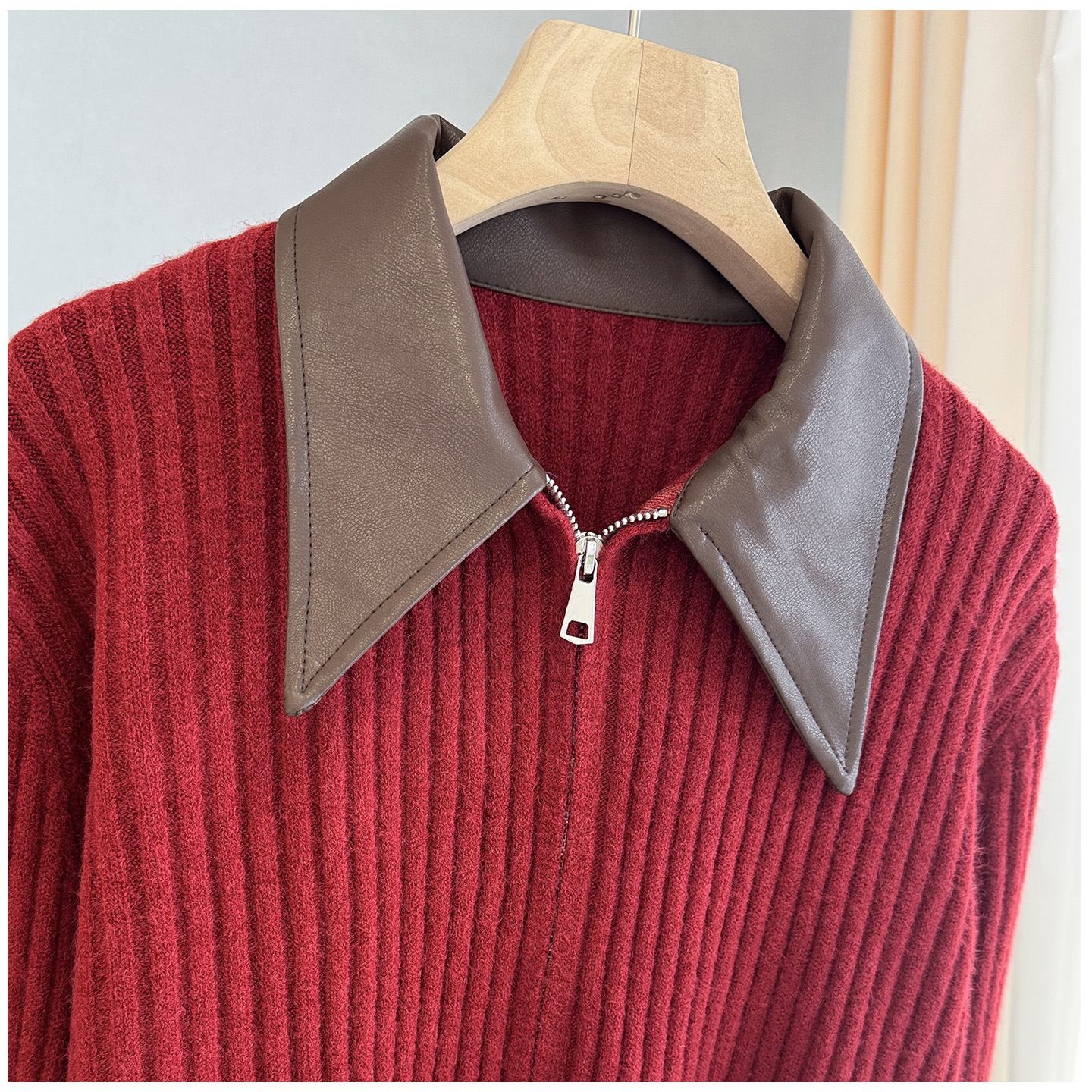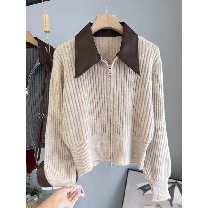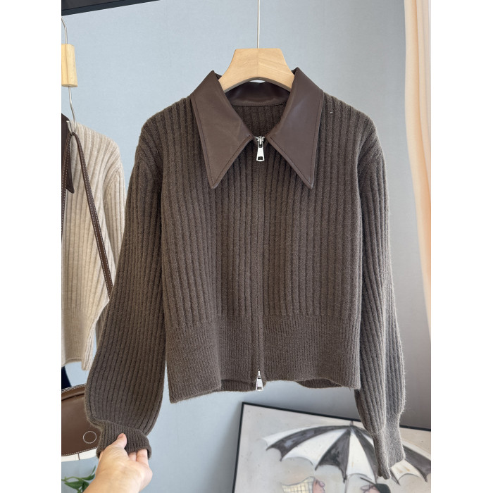 設計感拼接皮領毛衣外套女2025秋裝新款韓版修身顯瘦針織開衫上衣