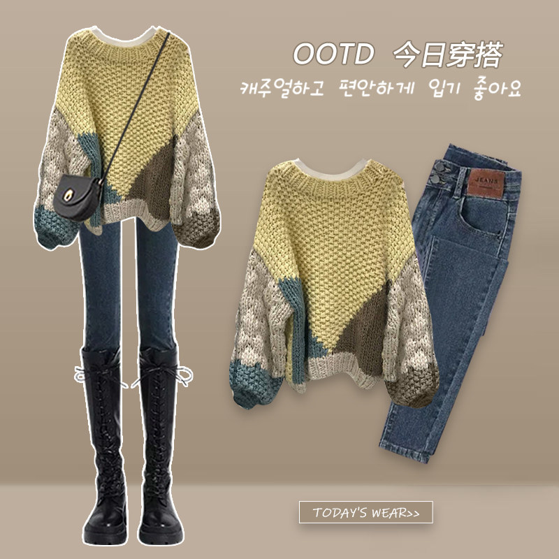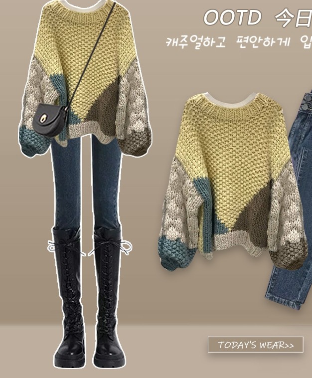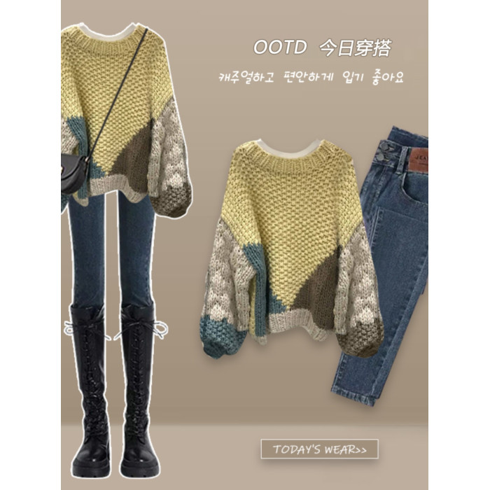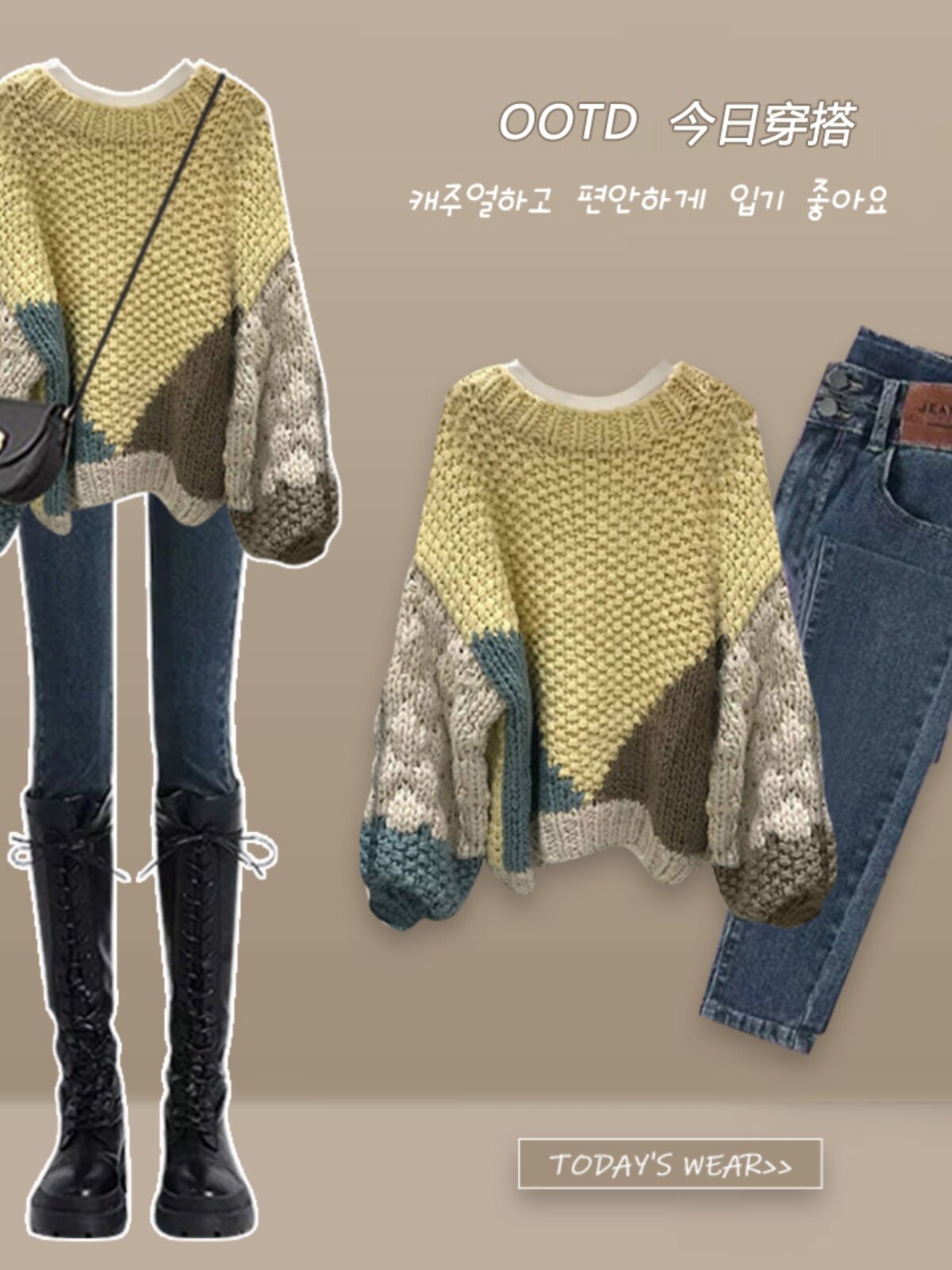 法式粗毛線慵嬾風加厚套頭針織上衣2025秋冬季新款撞色寬鬆毛衣女