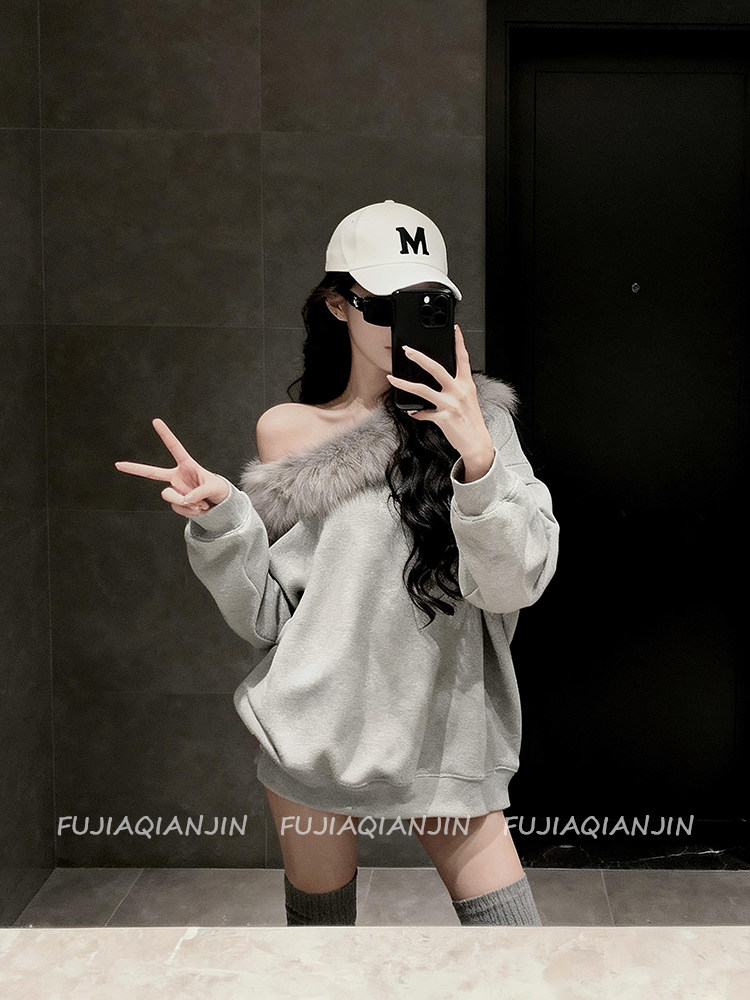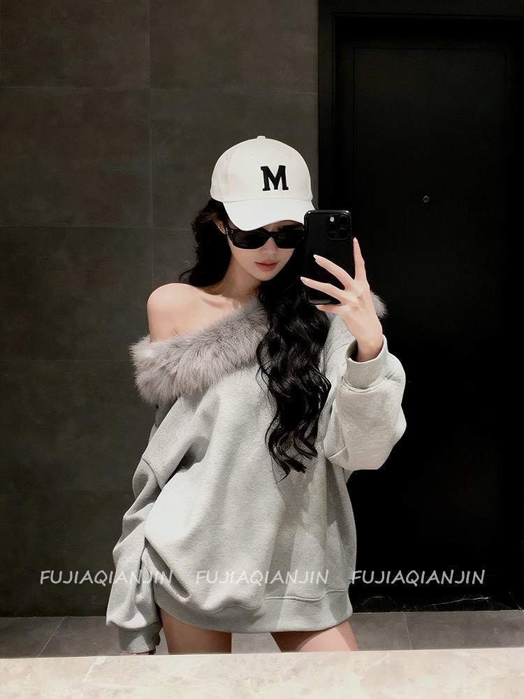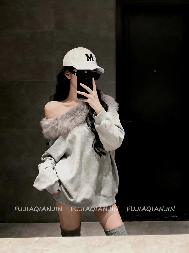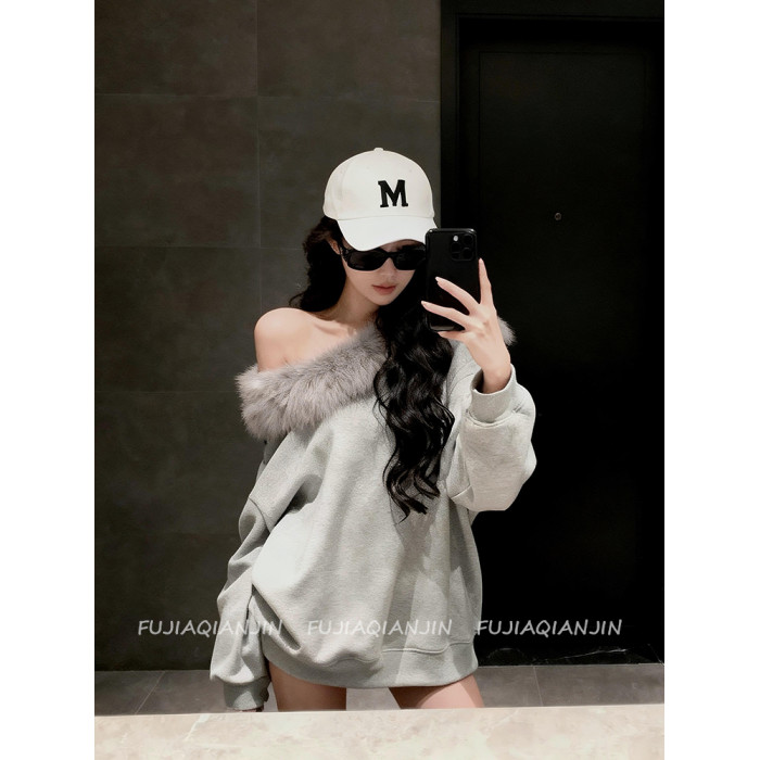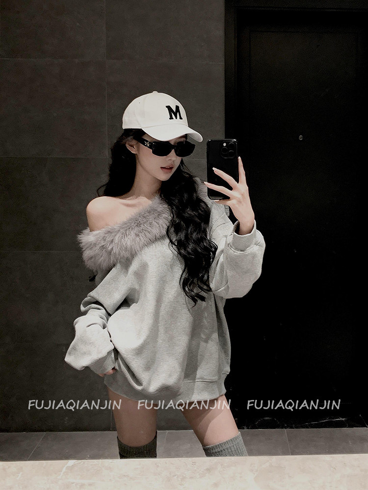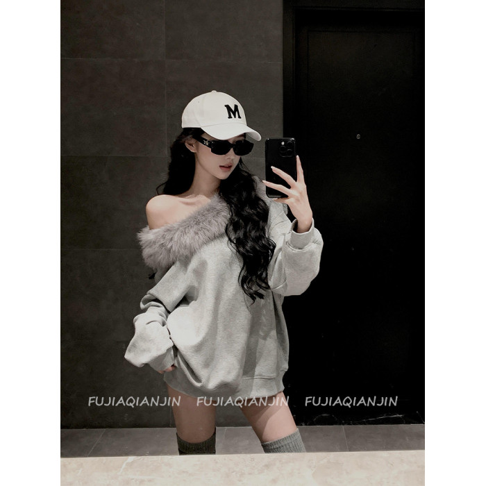美式斜肩毛毛領寬鬆衛衣女春季韓版慵懶風休閒上衣外套趙露思同款