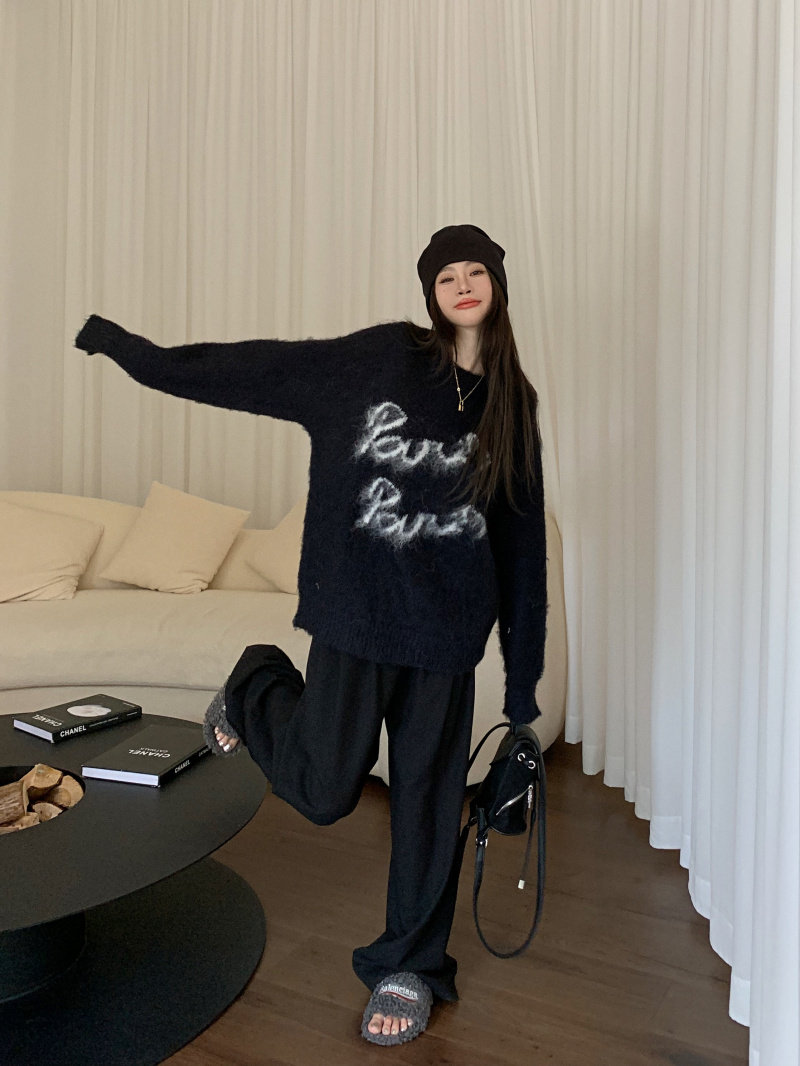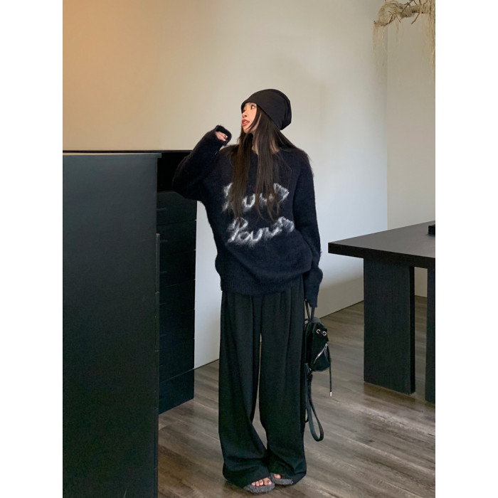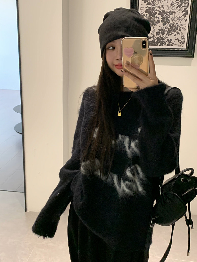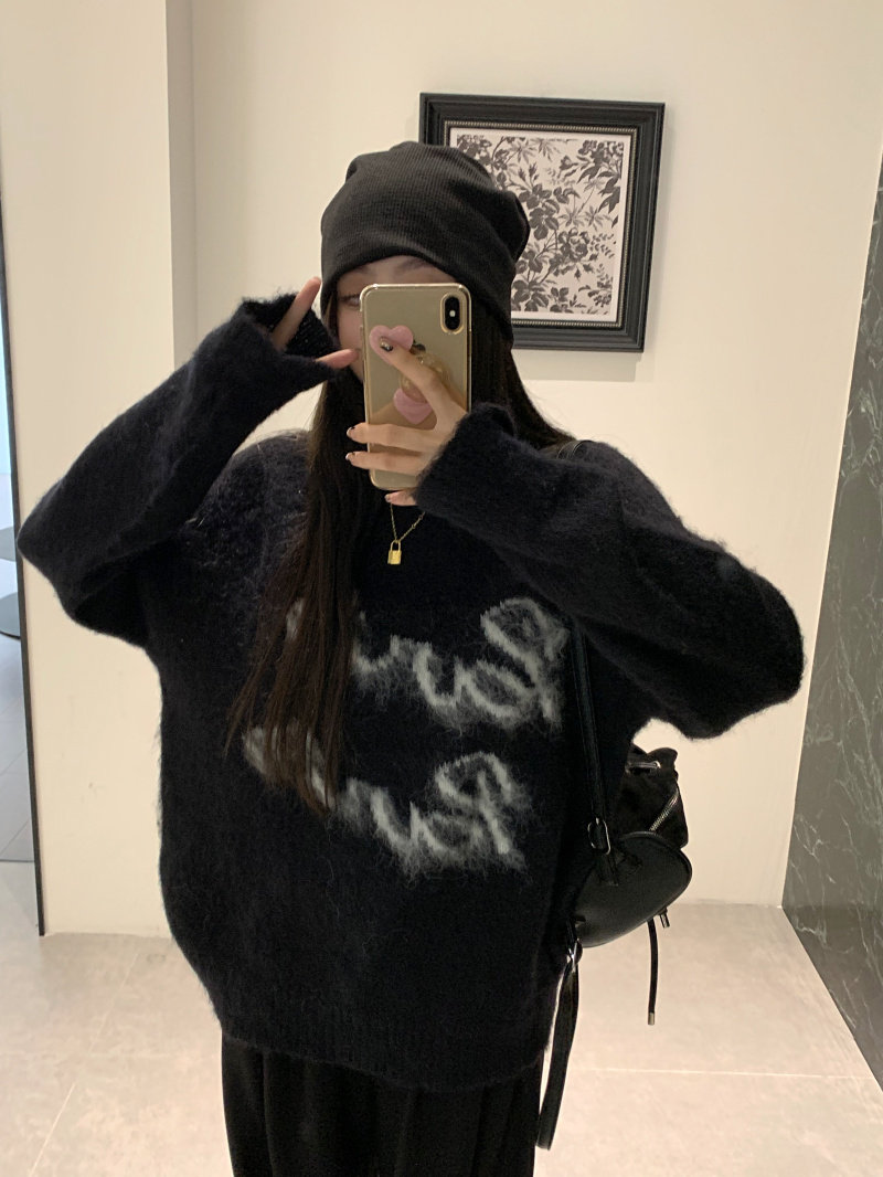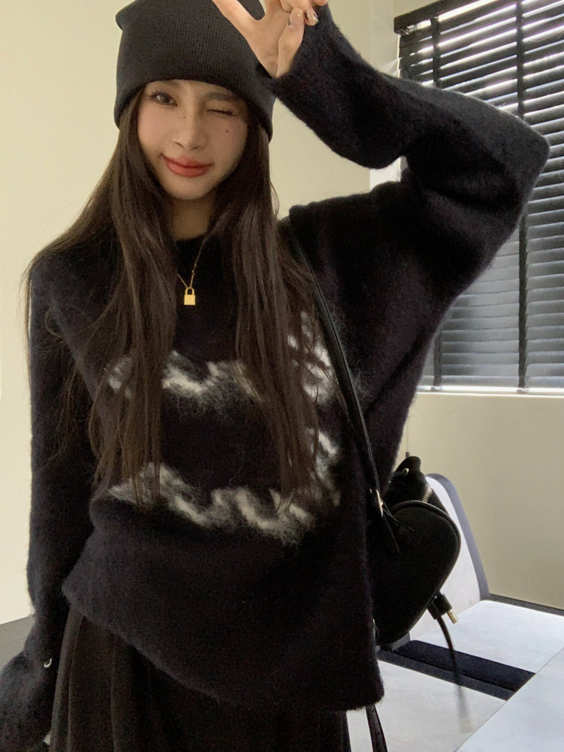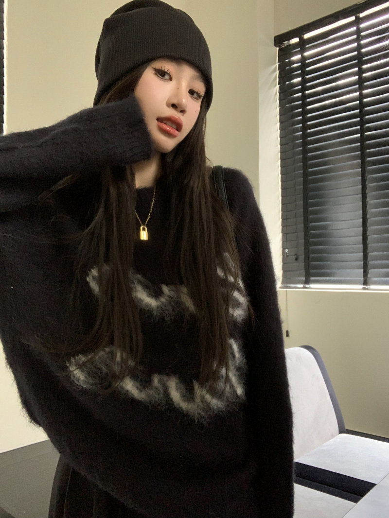 黑色圓領套頭毛衣女款2025新款冬季加厚軟糯寬鬆韓系慵懶針織上衣
