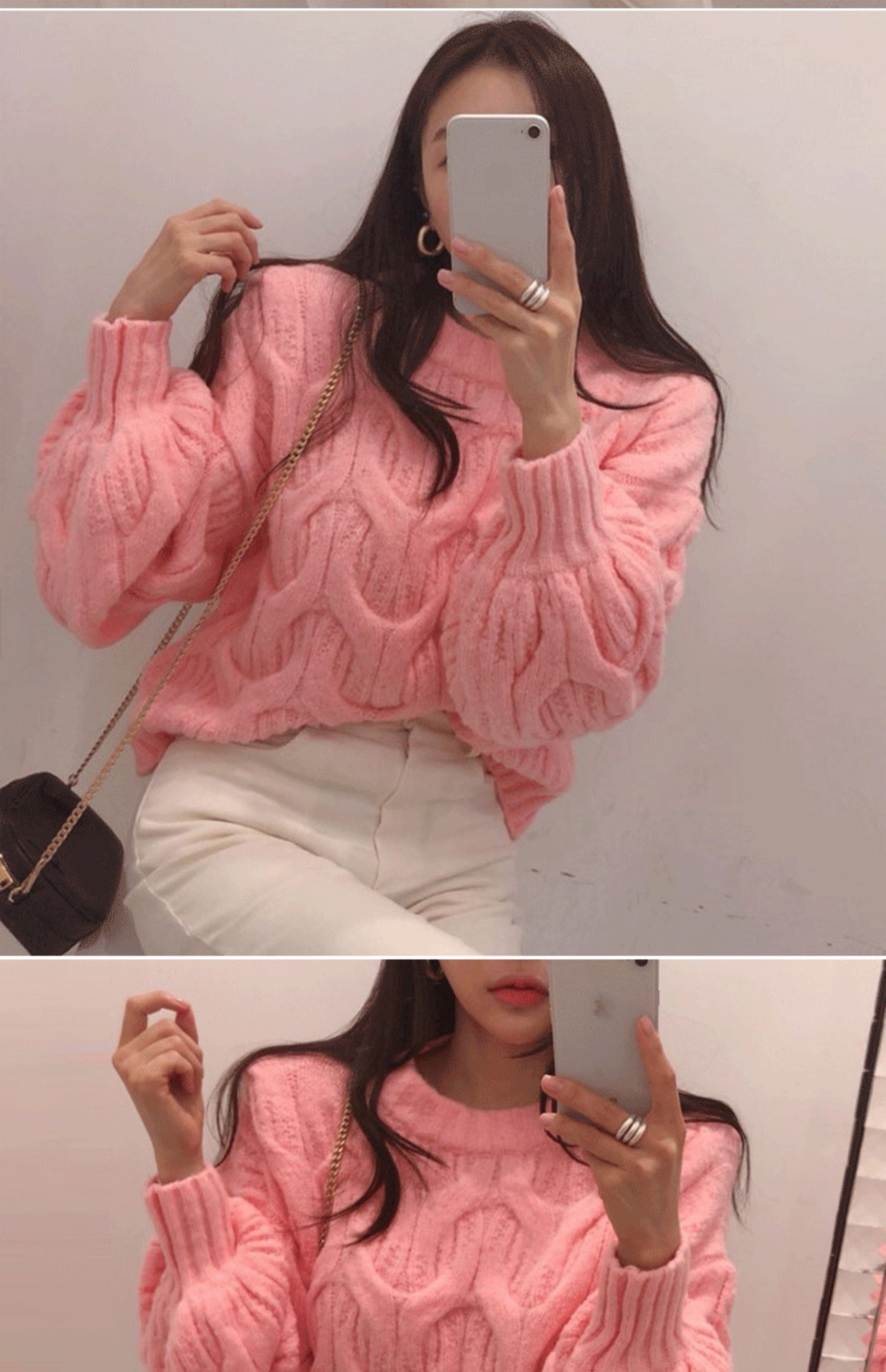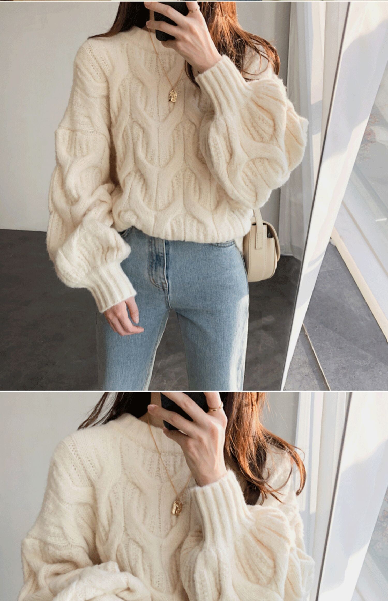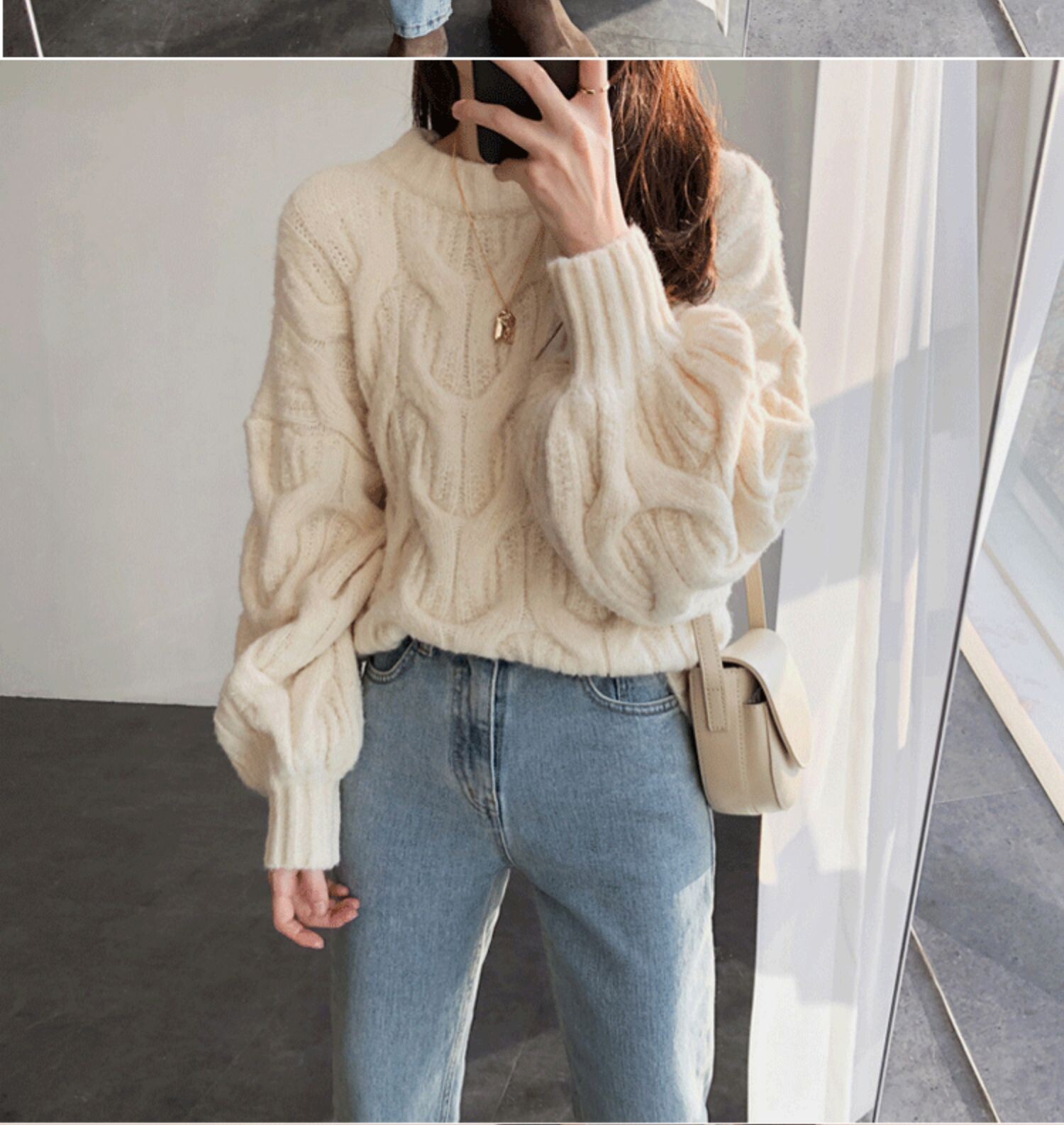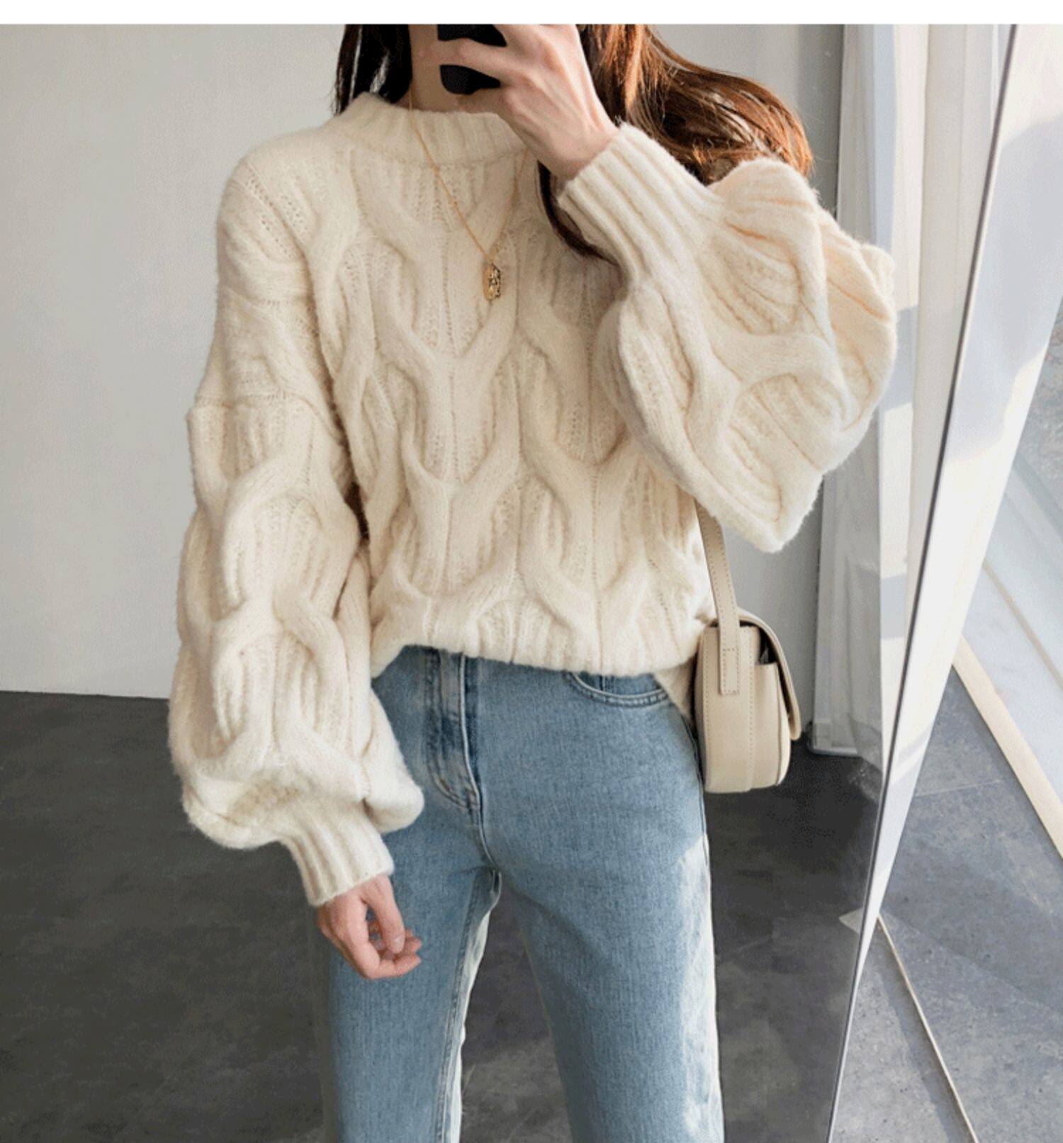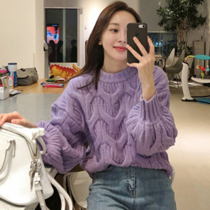 白色短款麻花毛衣女燈籠袖慵嬾風秋冬新款韓版寬鬆加厚套頭針織衫