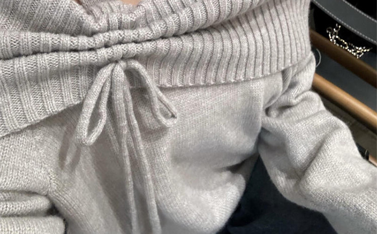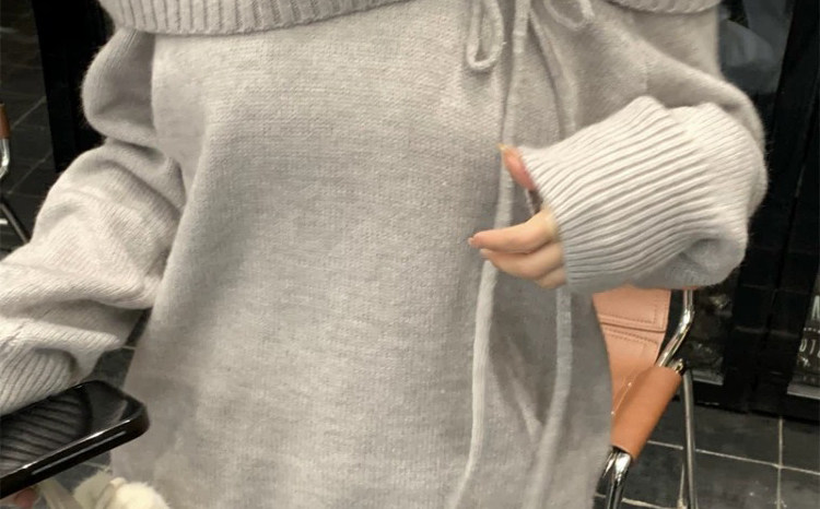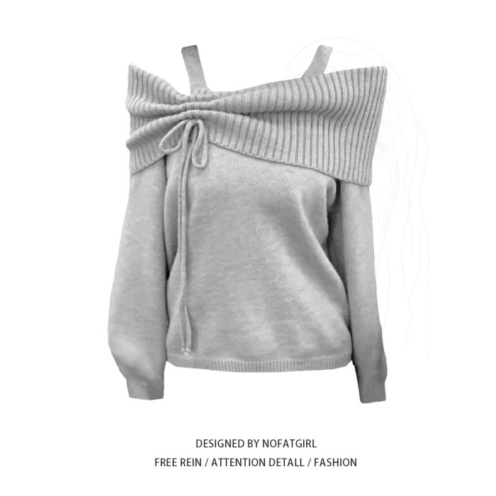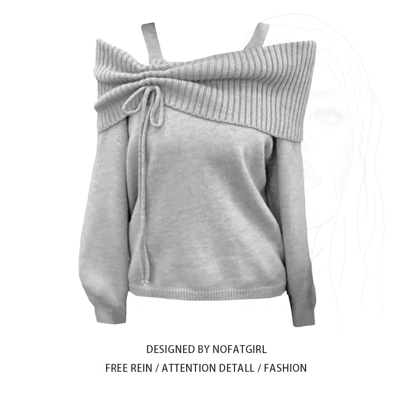 大碼胖MM灰色一字領針織毛衣女秋季新款休閒百搭設計感露肩上衣潮