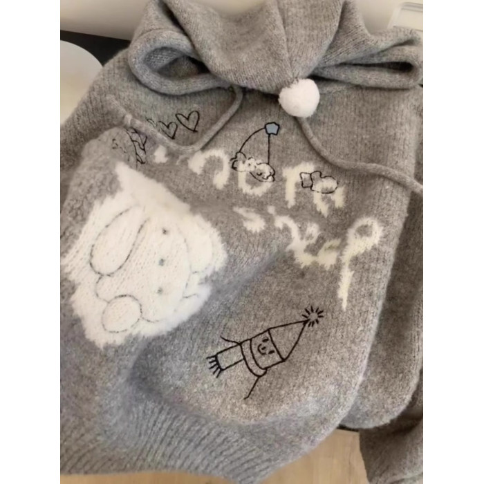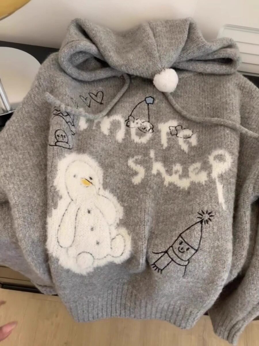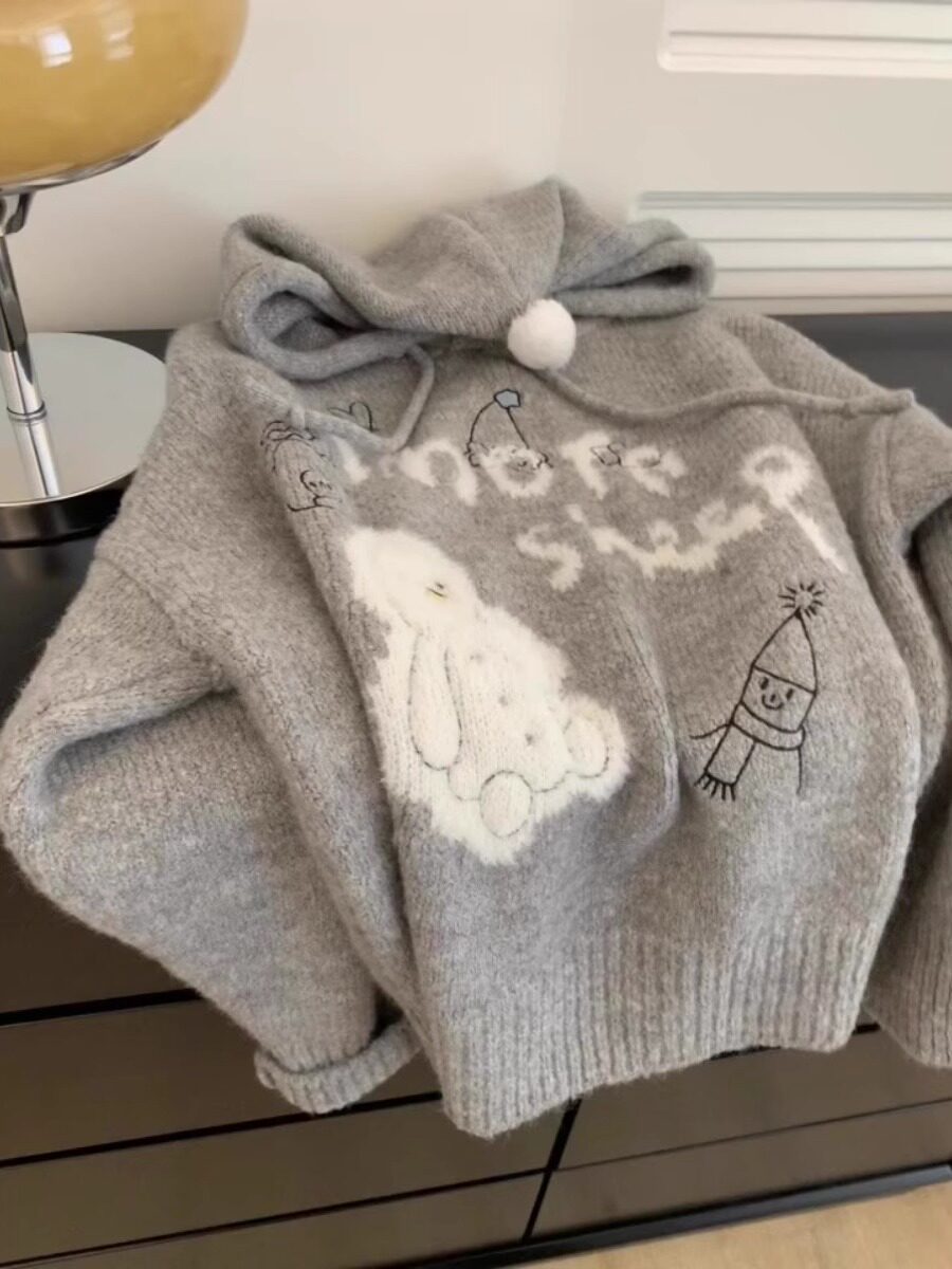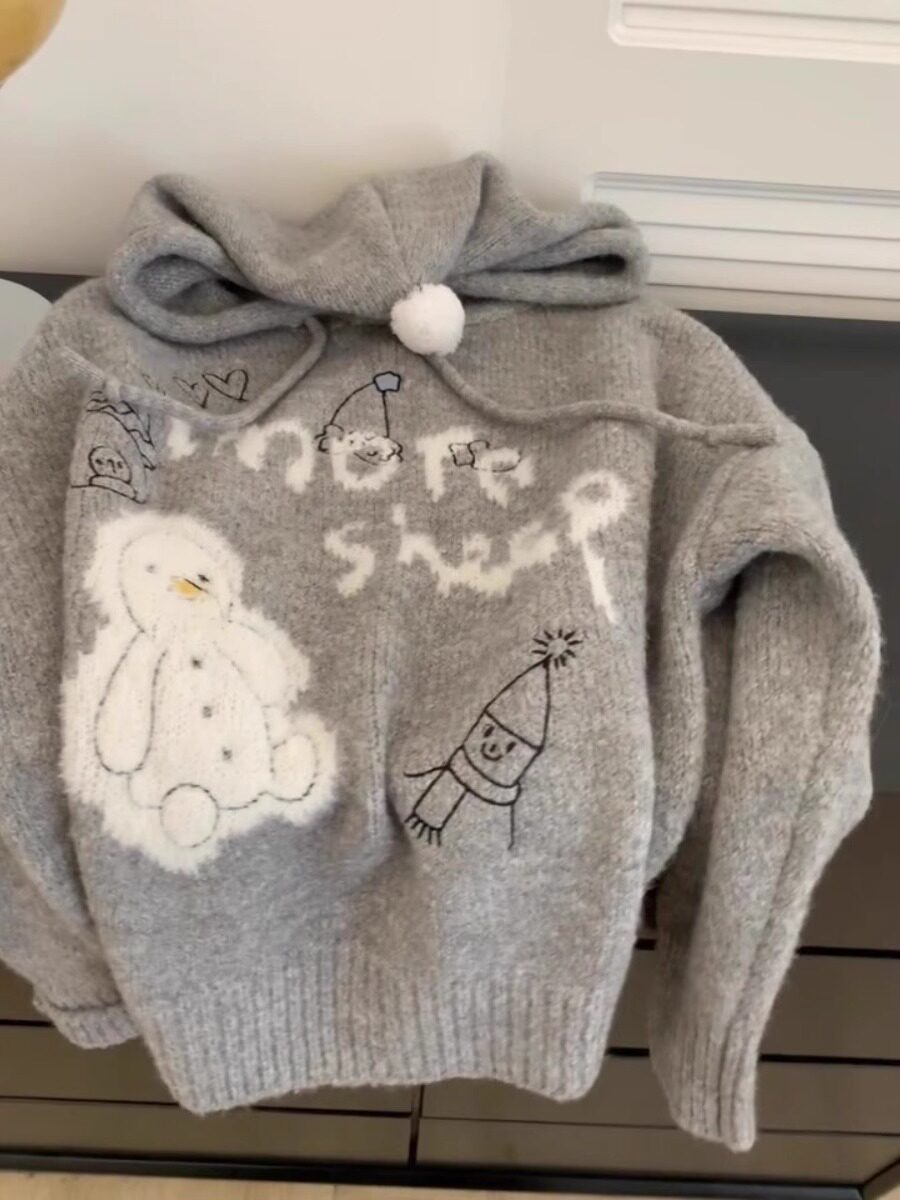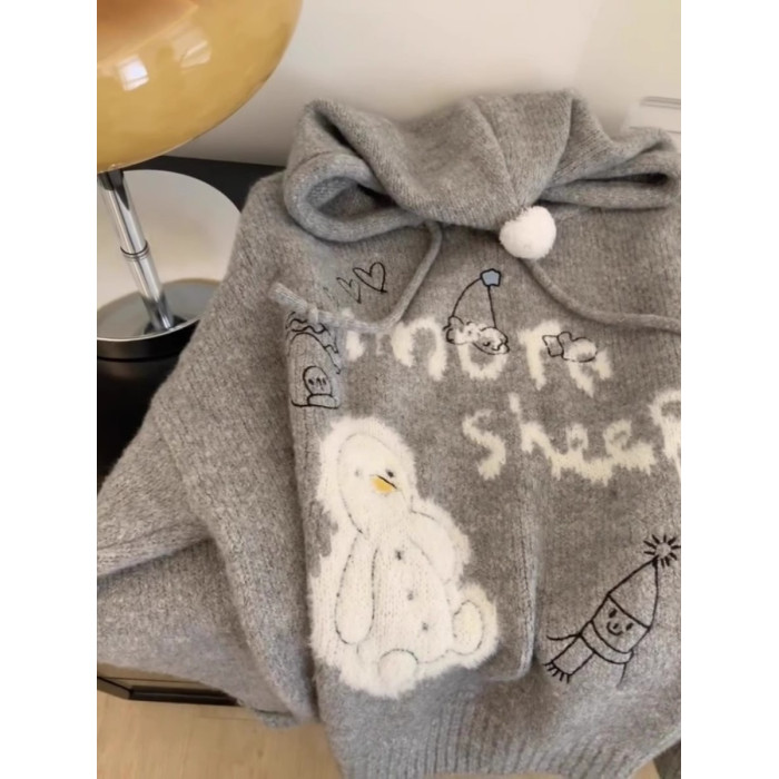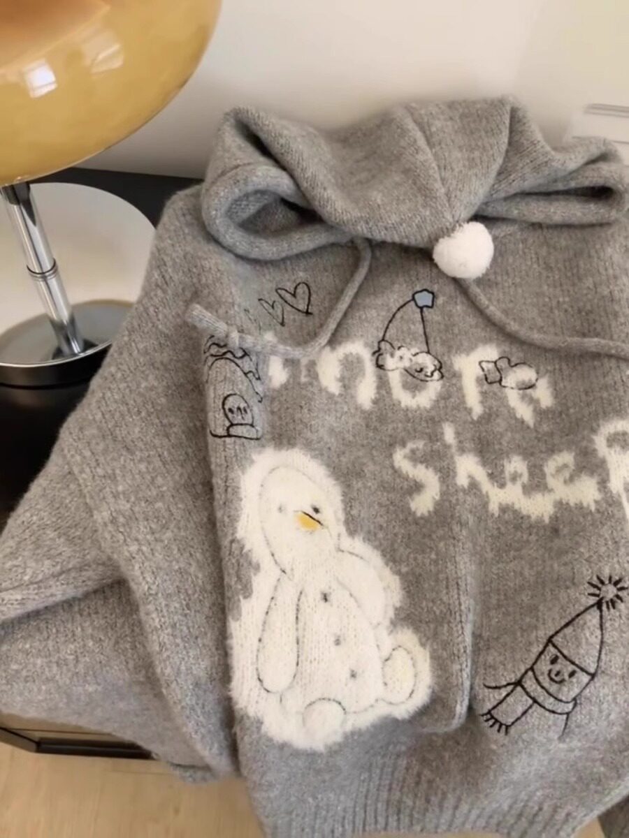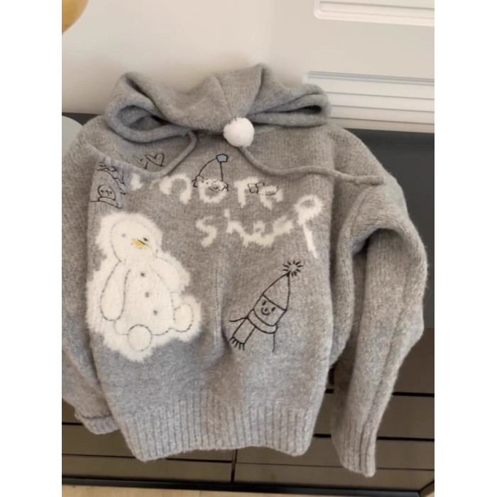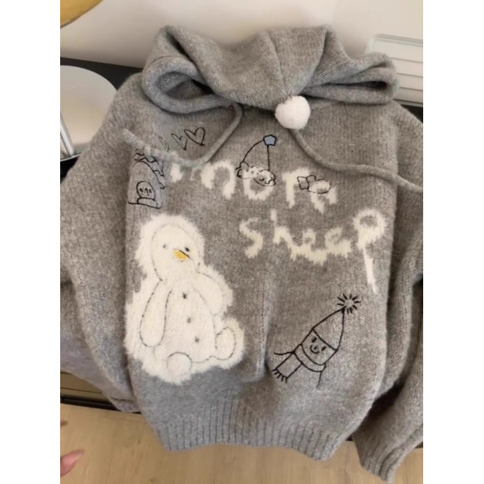 慵懶風灰色卡通連帽毛衣女外套秋冬新款韓版寬松加厚針織內搭衛衣