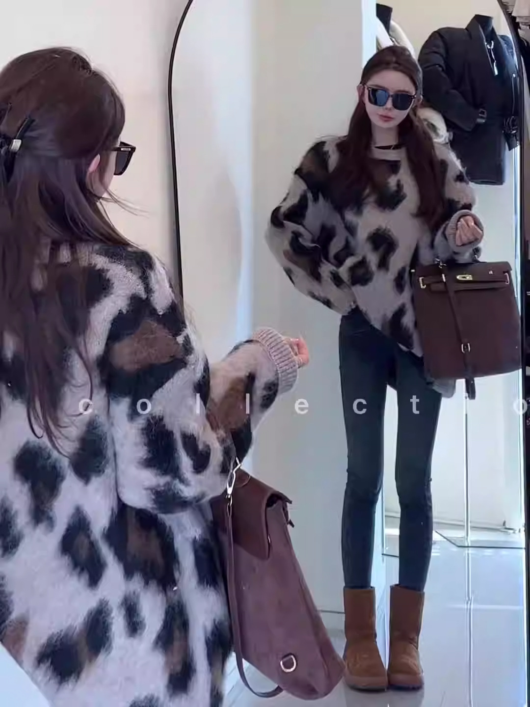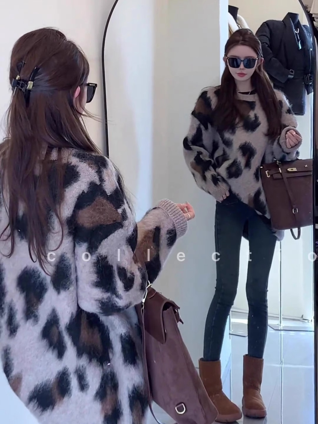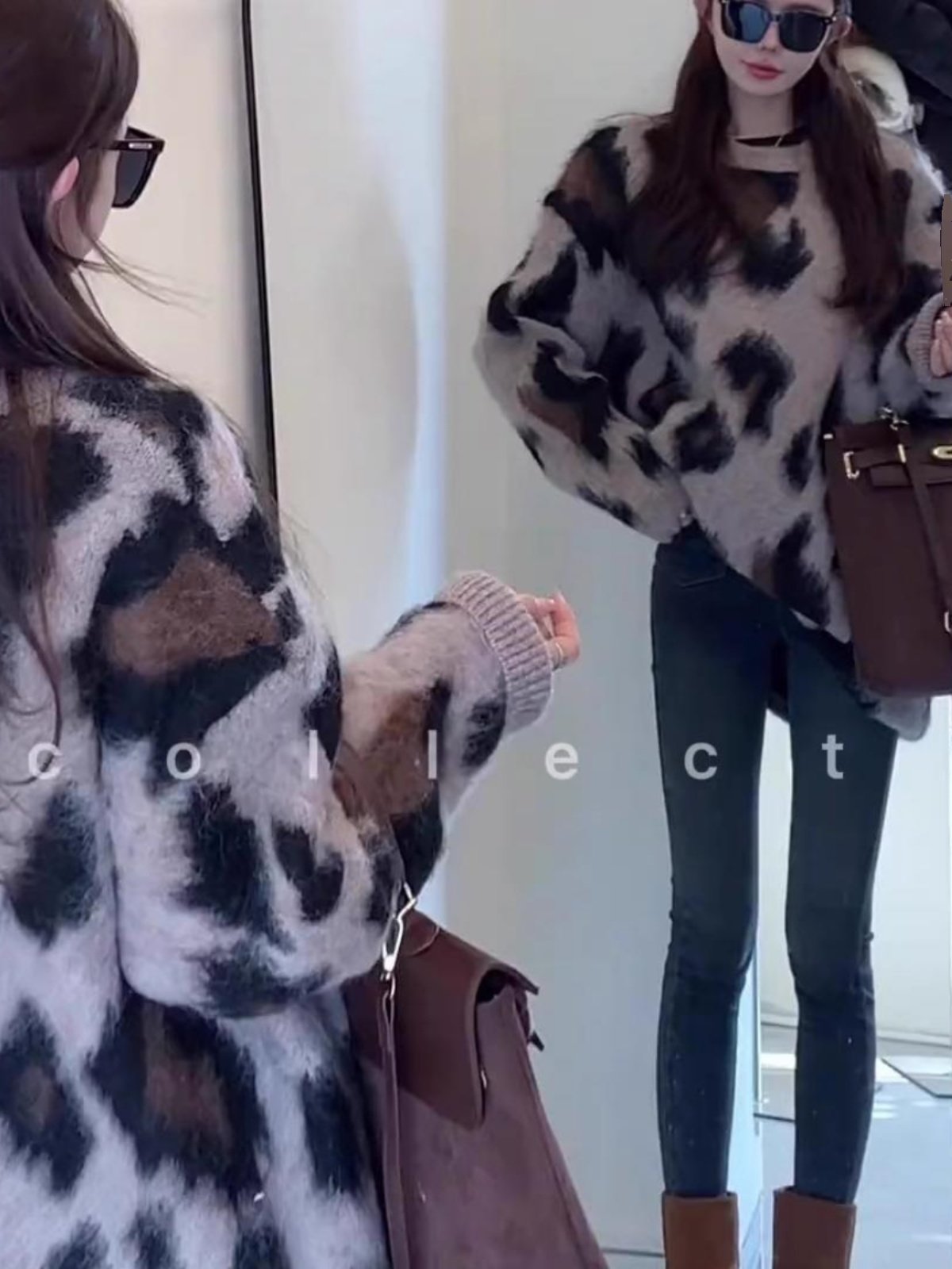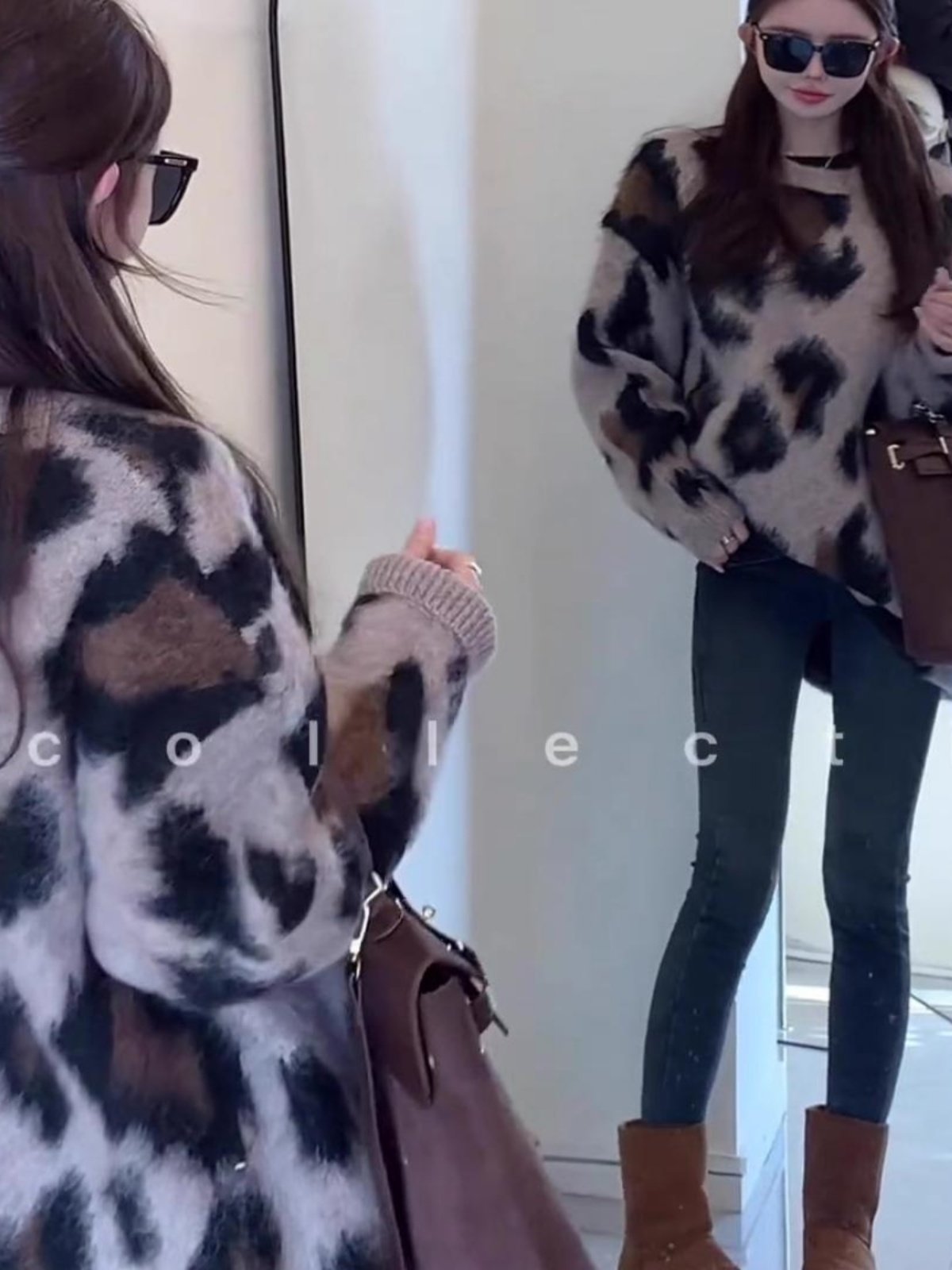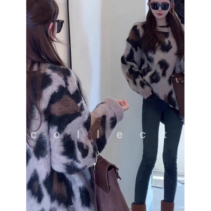 復古慵嬾風圓領套頭針織打底衫秋冬軟糯中長款時尚保暖豹紋毛衣女