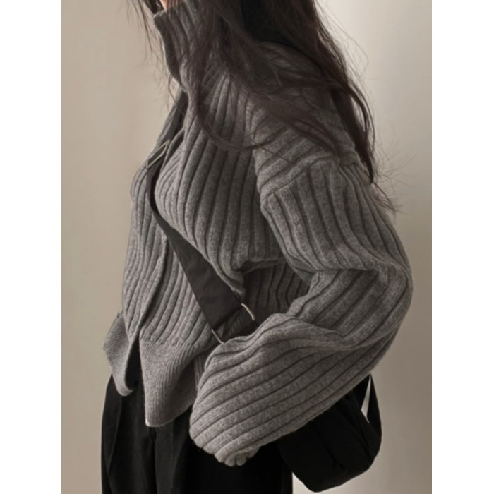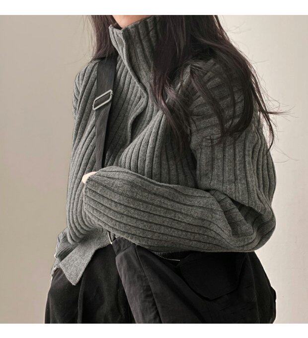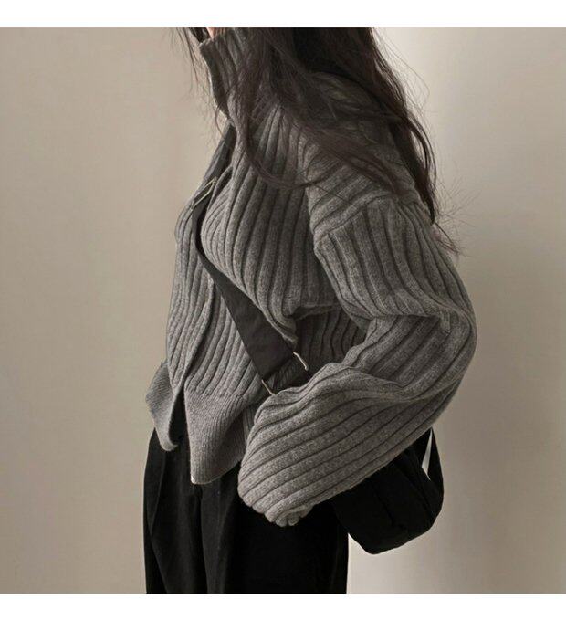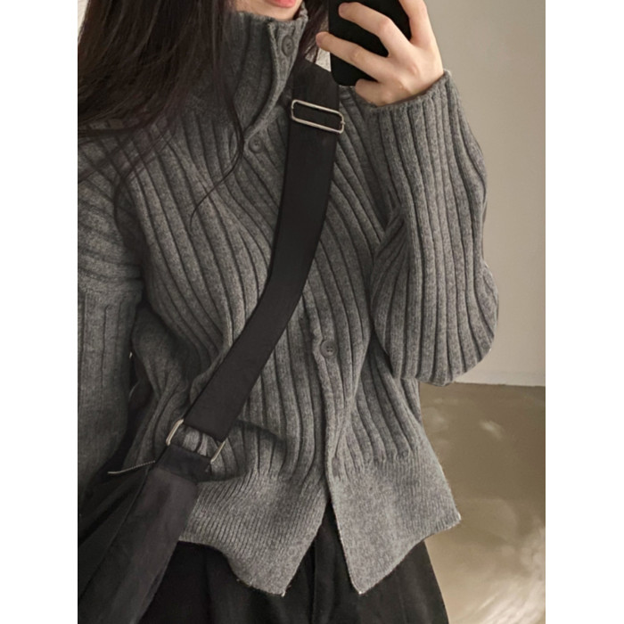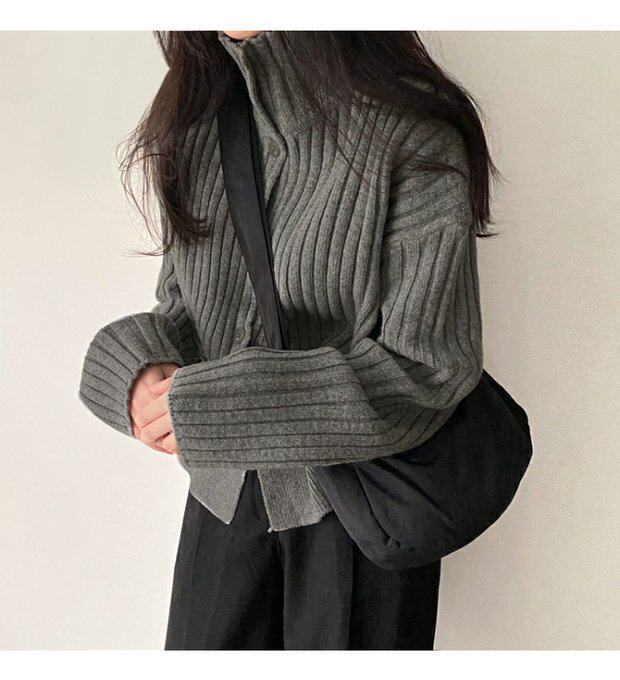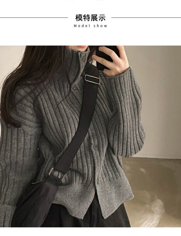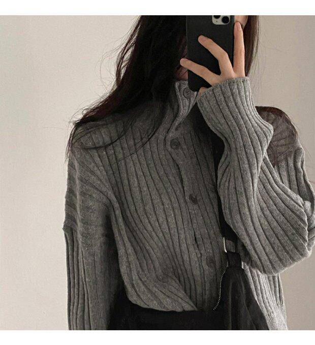 韓國chic秋冬復古單排釦高領保暖毛衣外套坑條顯瘦長袖針織開衫女