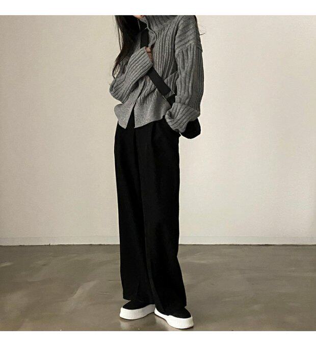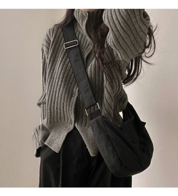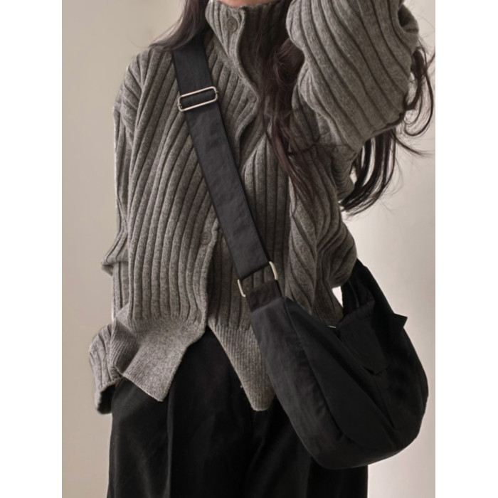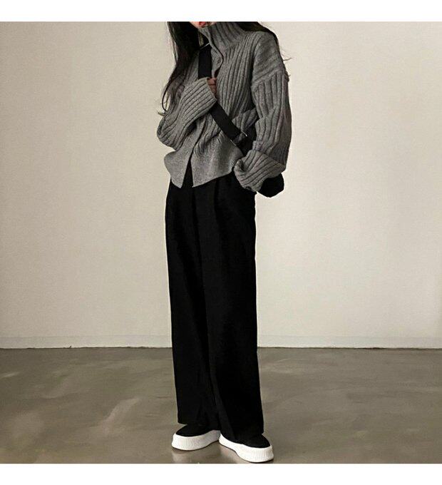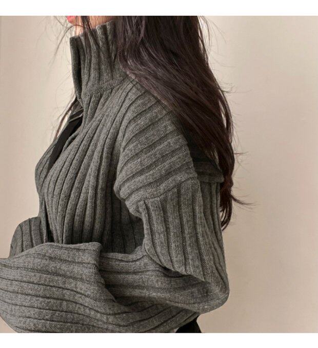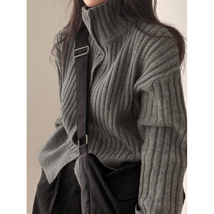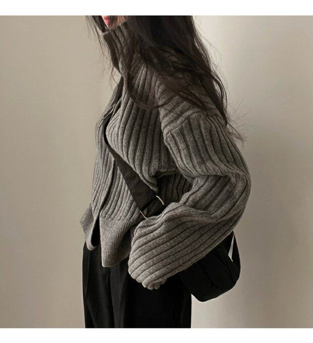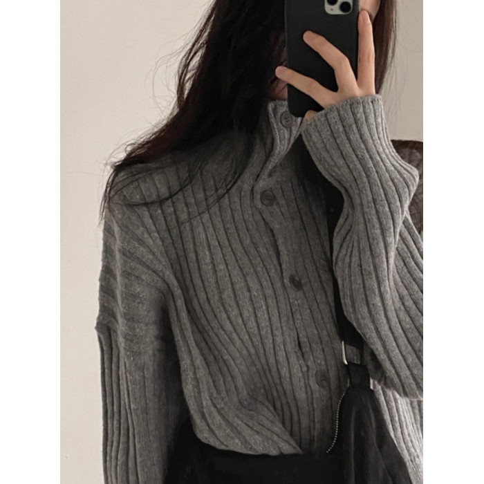 韓國chic秋冬復古單排釦高領保暖毛衣外套坑條顯瘦長袖針織開衫女