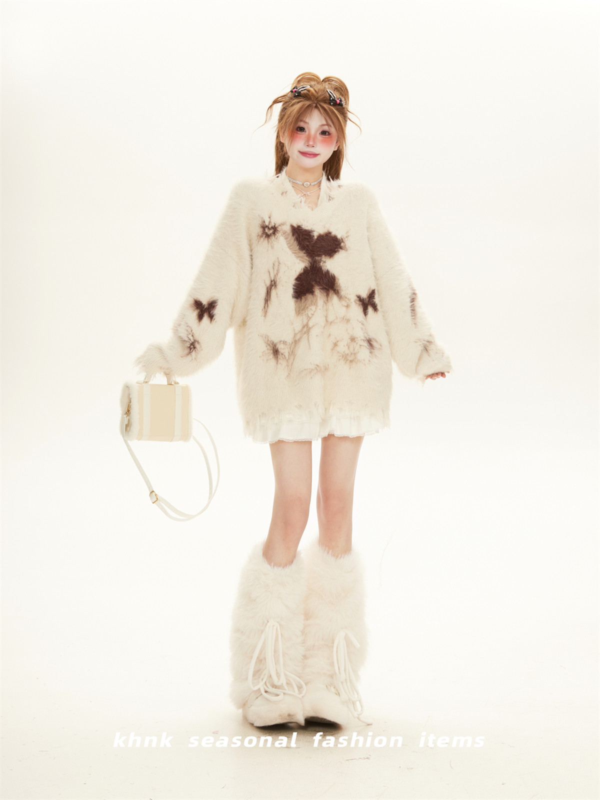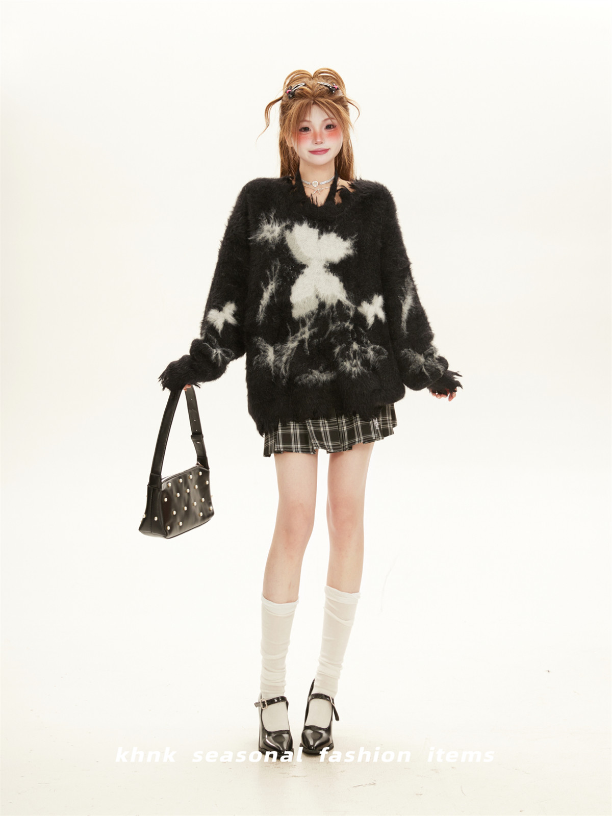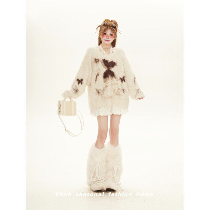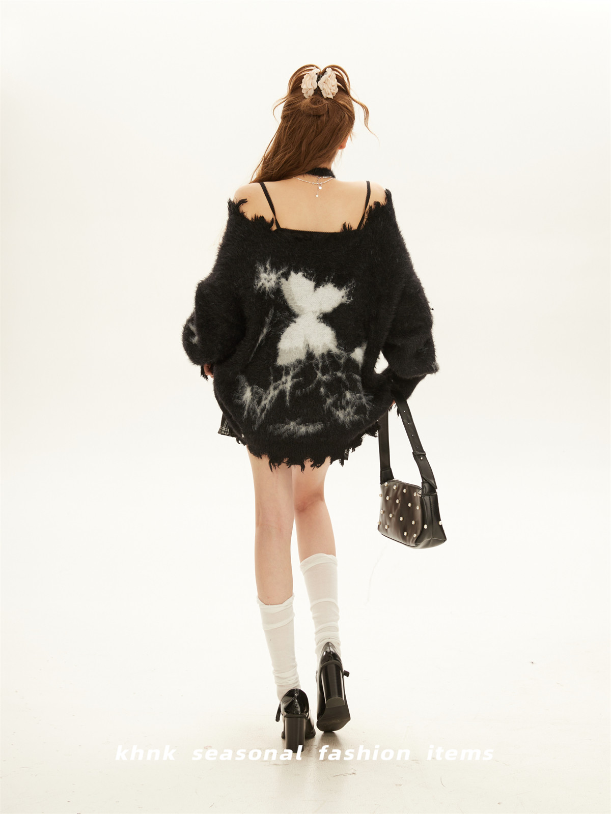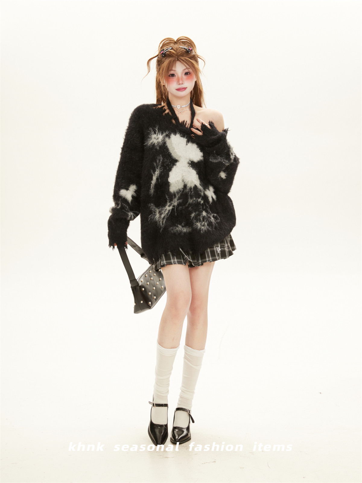 2025新款軟糯寬鬆掛脖漏肩v領毛衣女秋冬季針織上衣嬭huhu慵嬾風