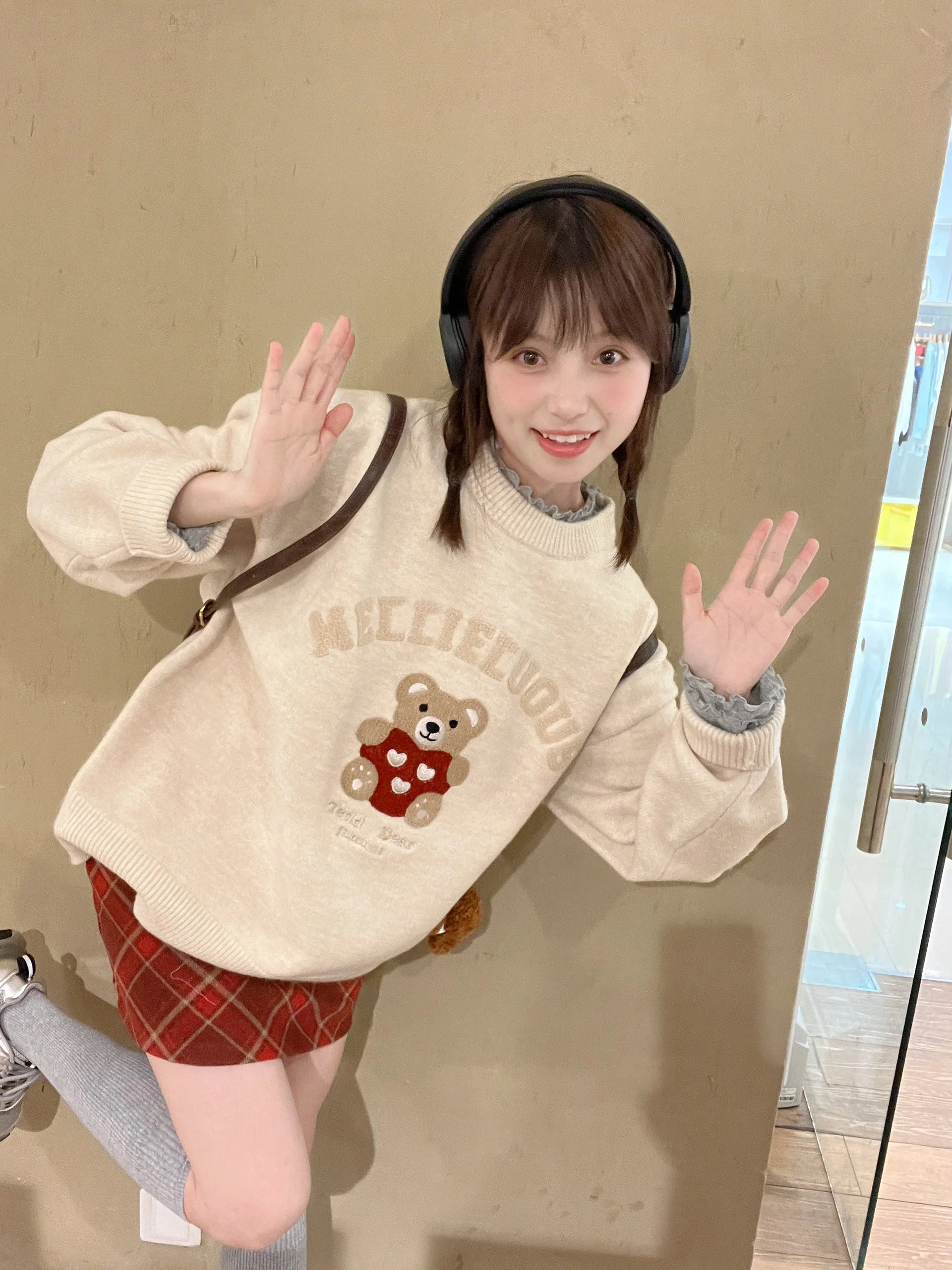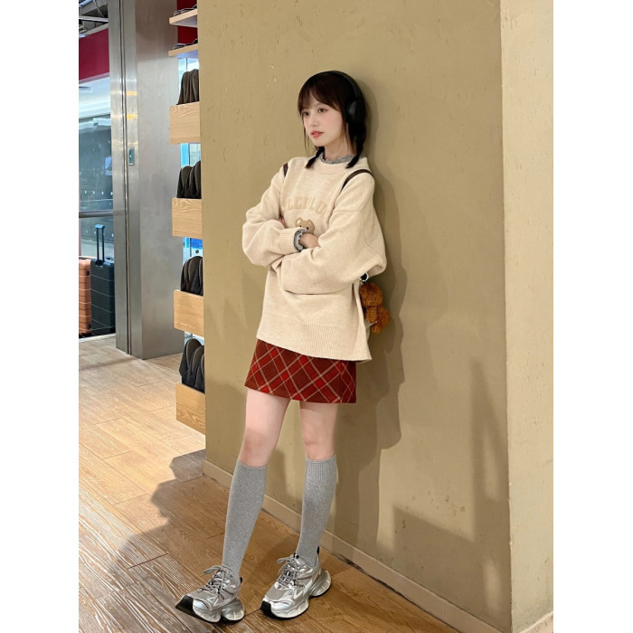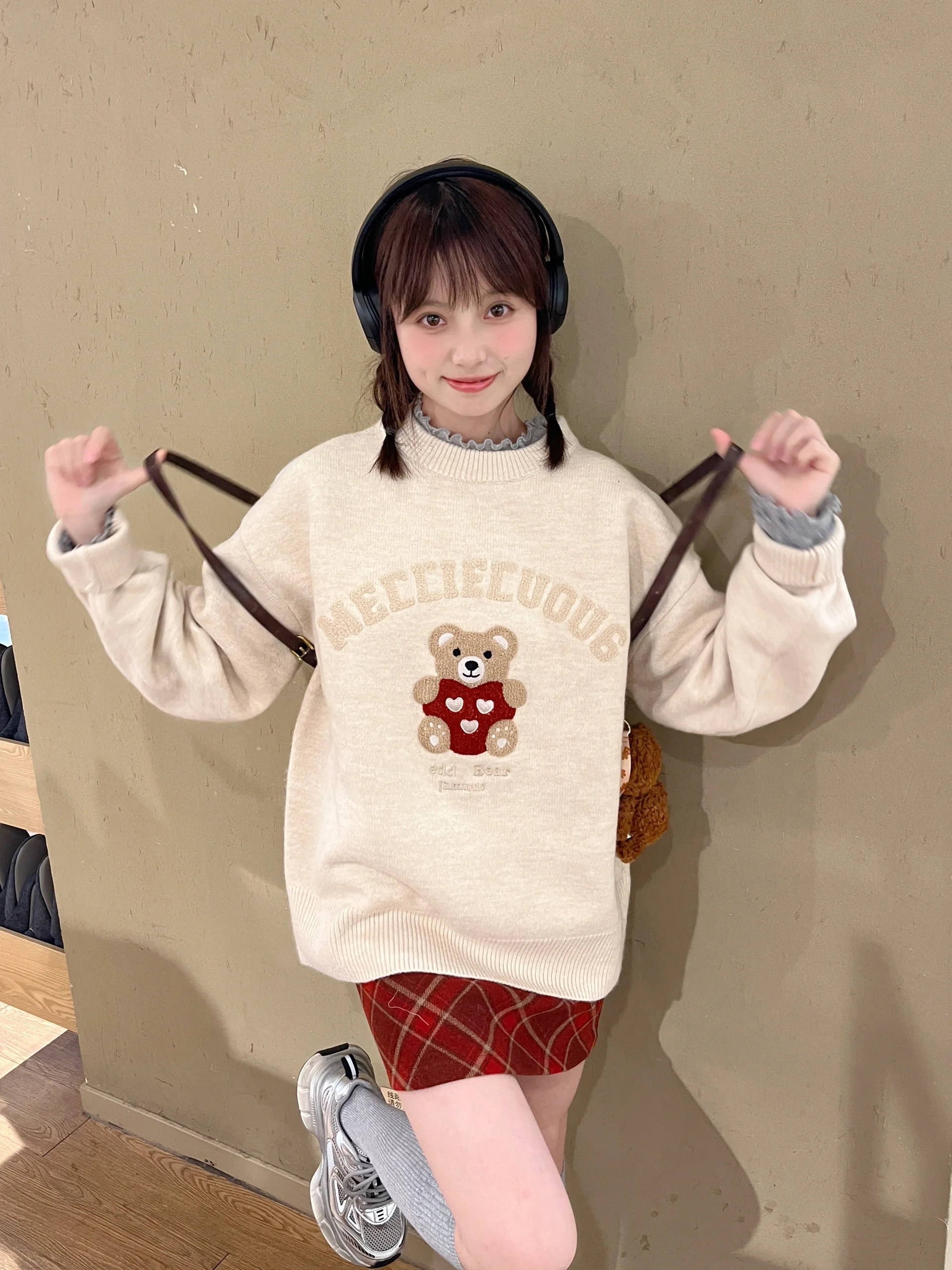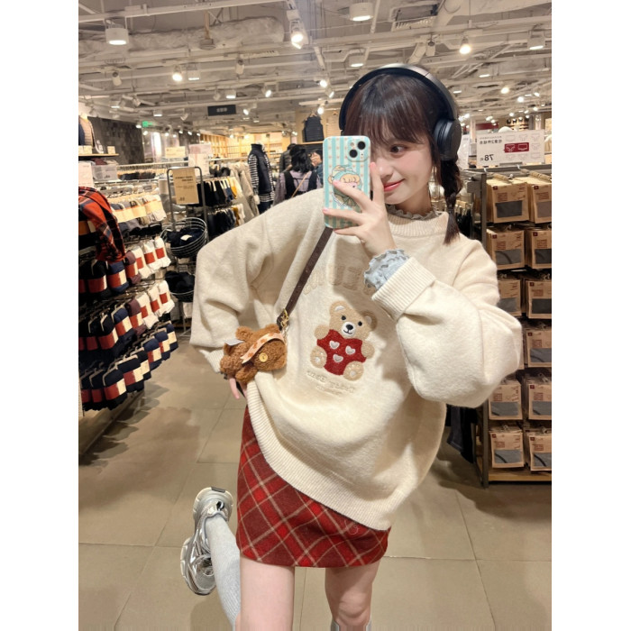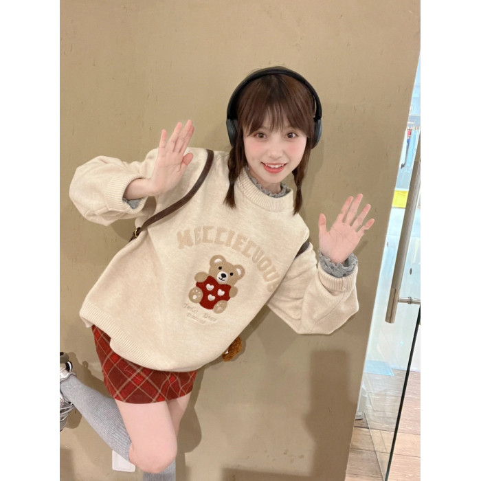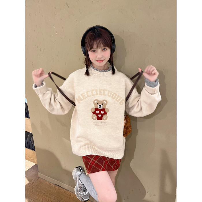 秋冬復古毛巾綉小熊套頭毛衣女寬鬆慵嬾風重磅圓領針織打底衫上衣
