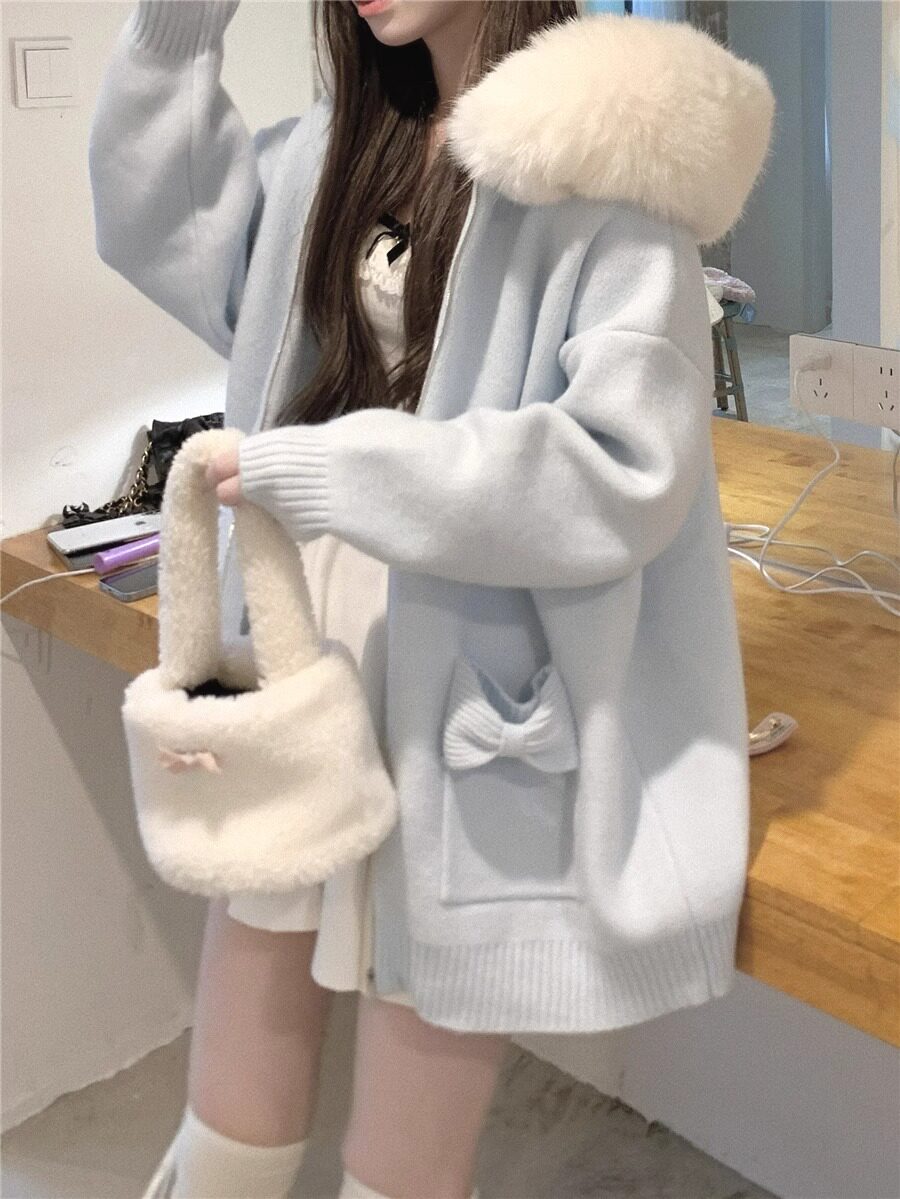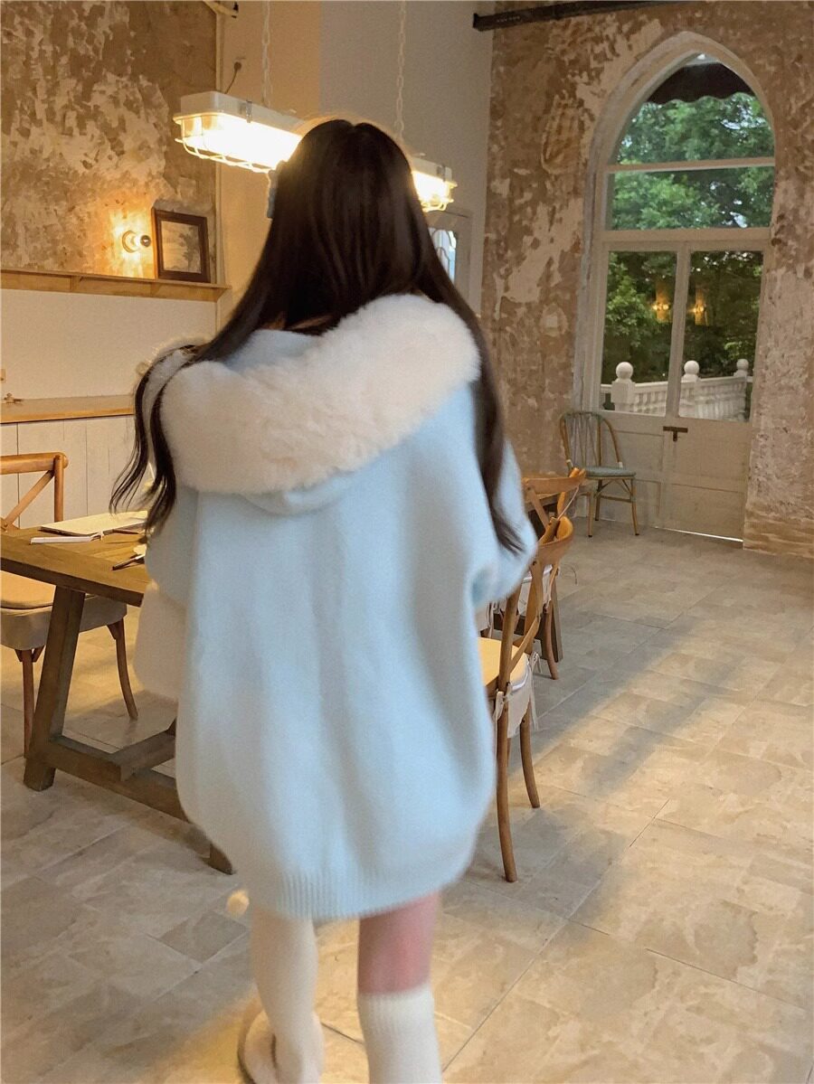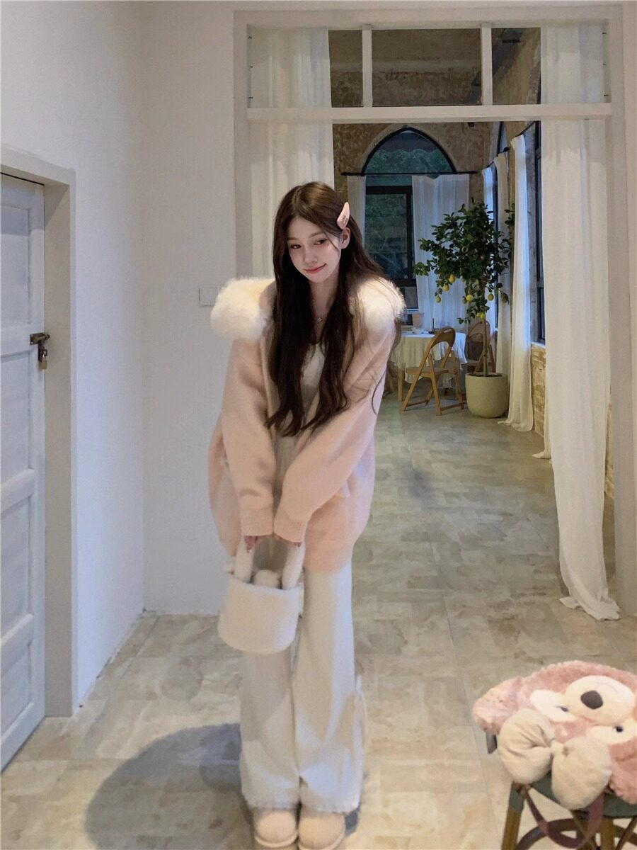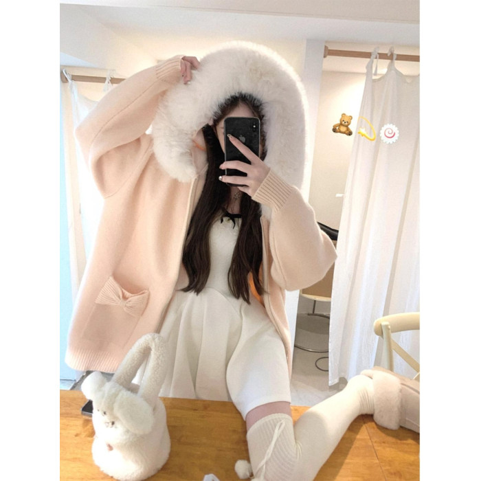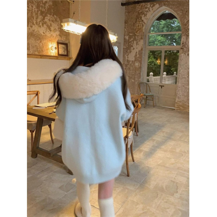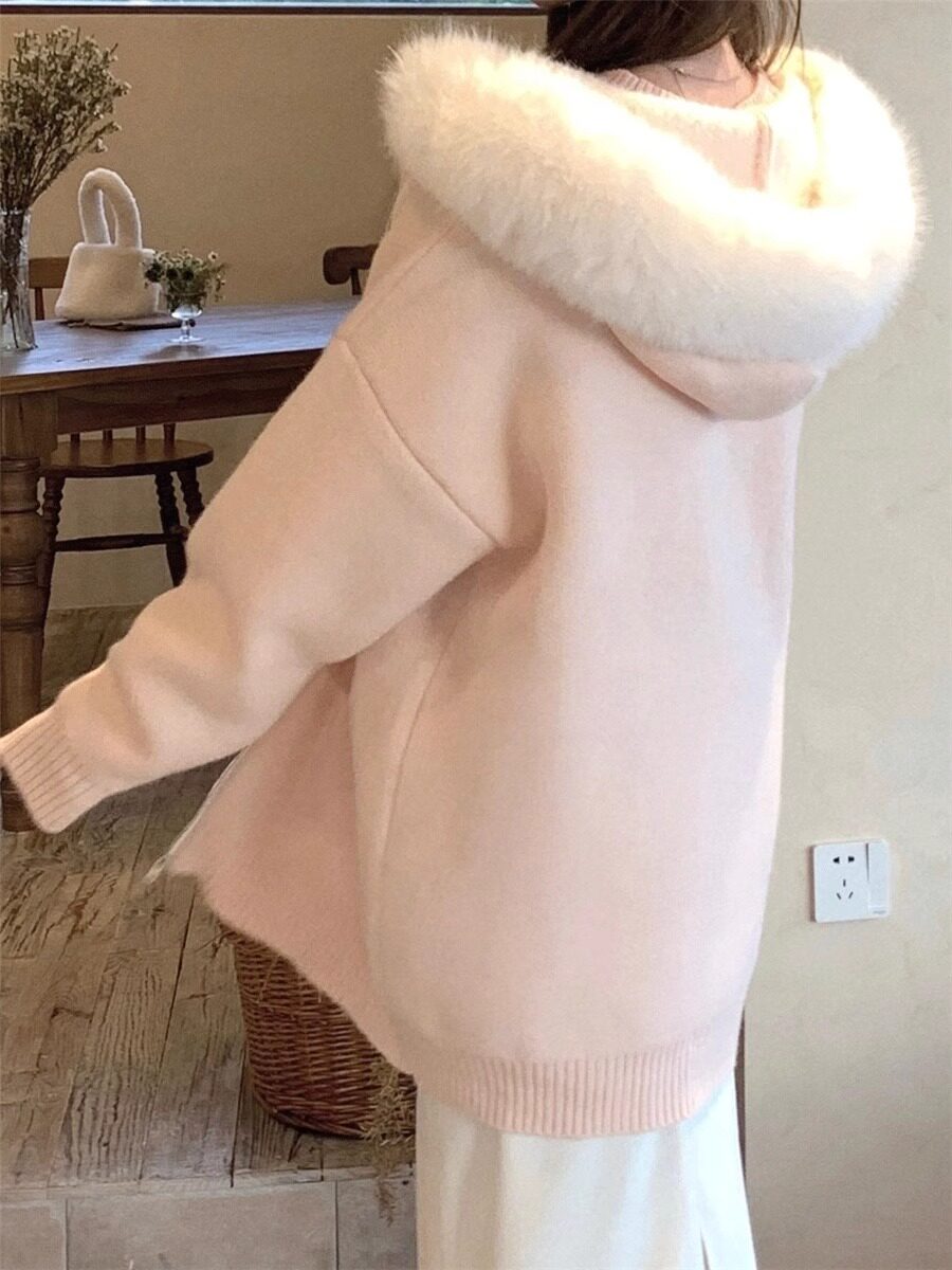 2025新款大毛領連帽毛衣針織開衫外套慵懶風超好看寬松加厚秋冬款