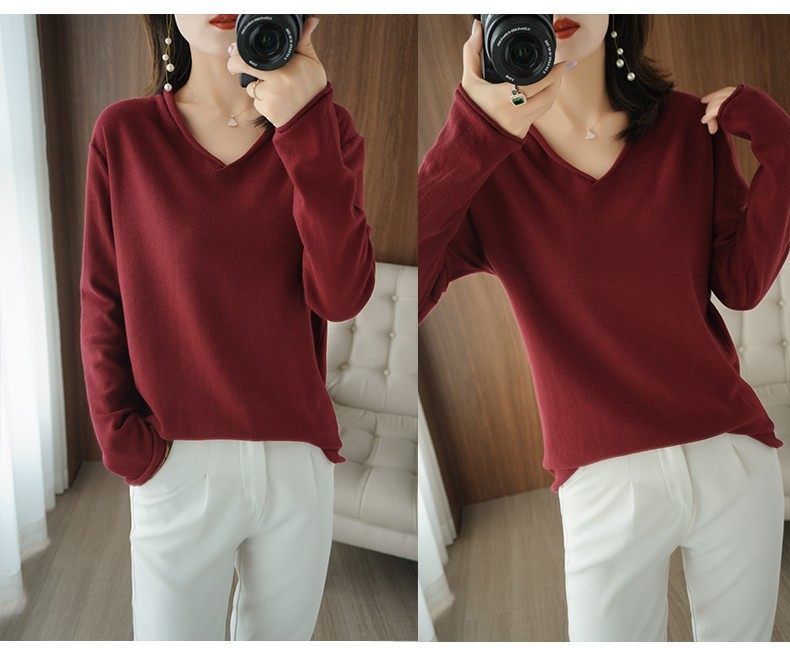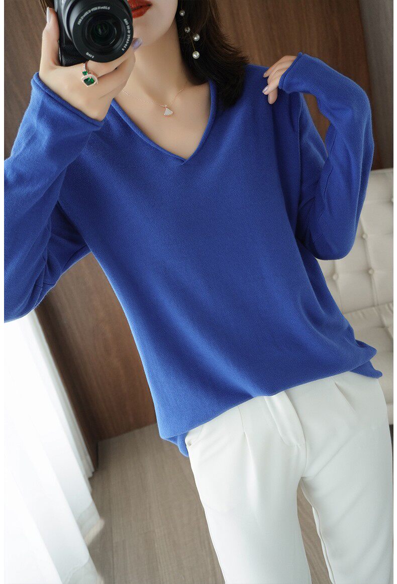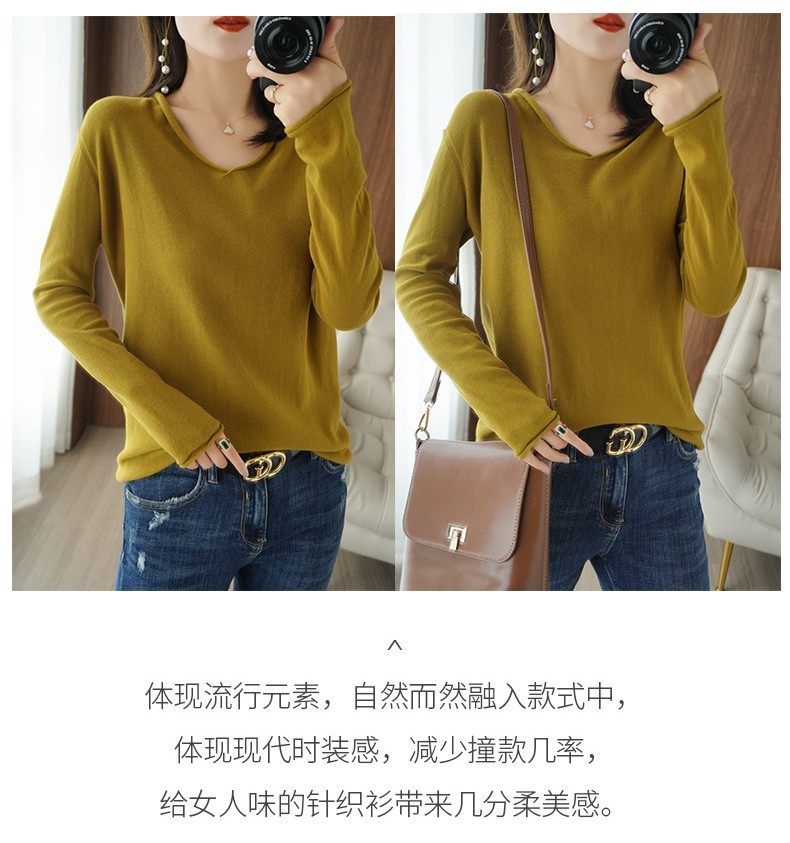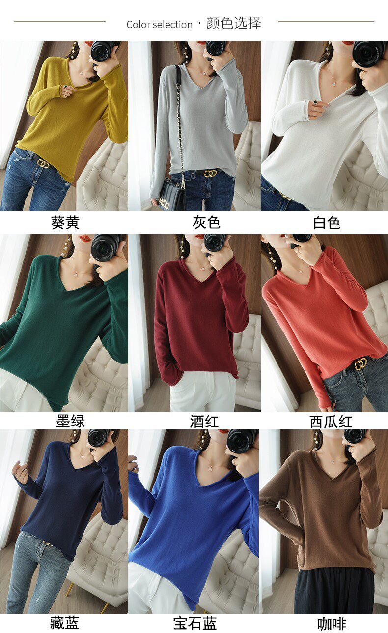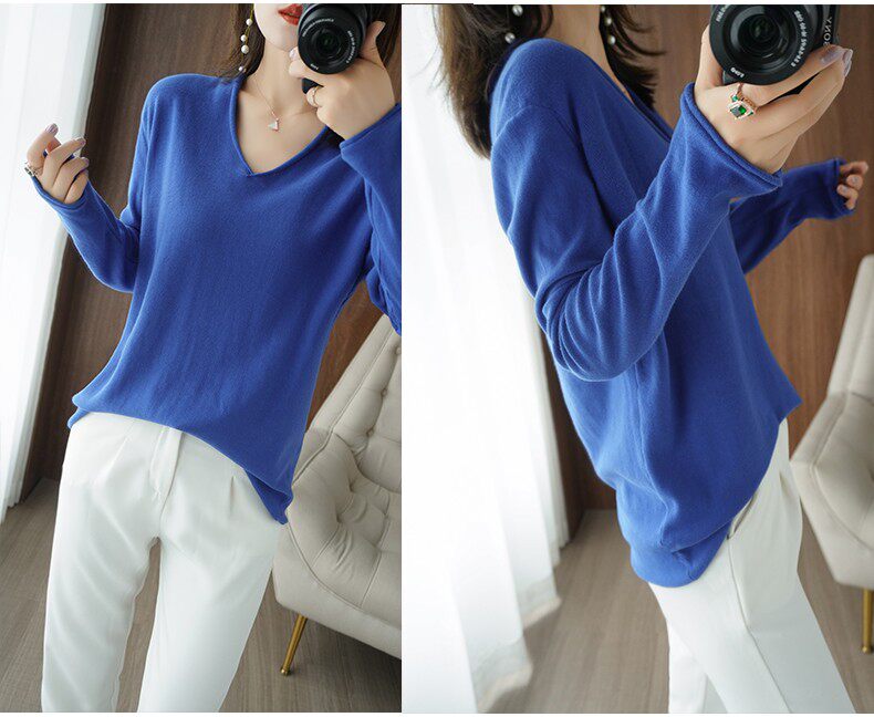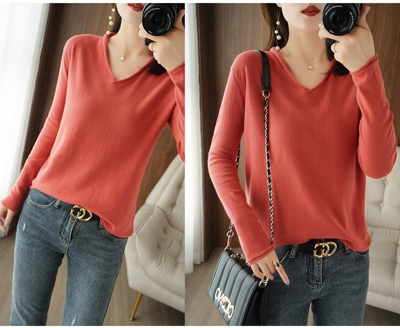 100%純棉秋季新款V領毛衣女卷邊連帽半帽針織衫外穿大碼寬鬆護頸