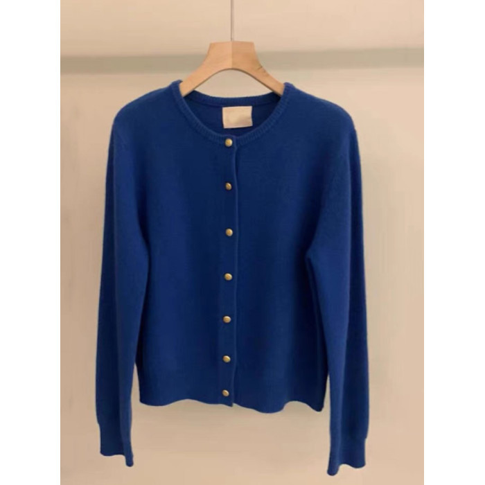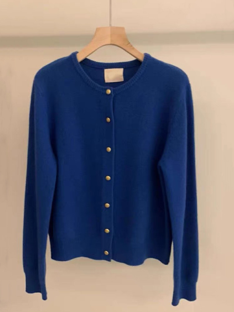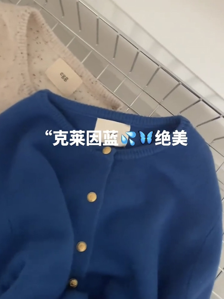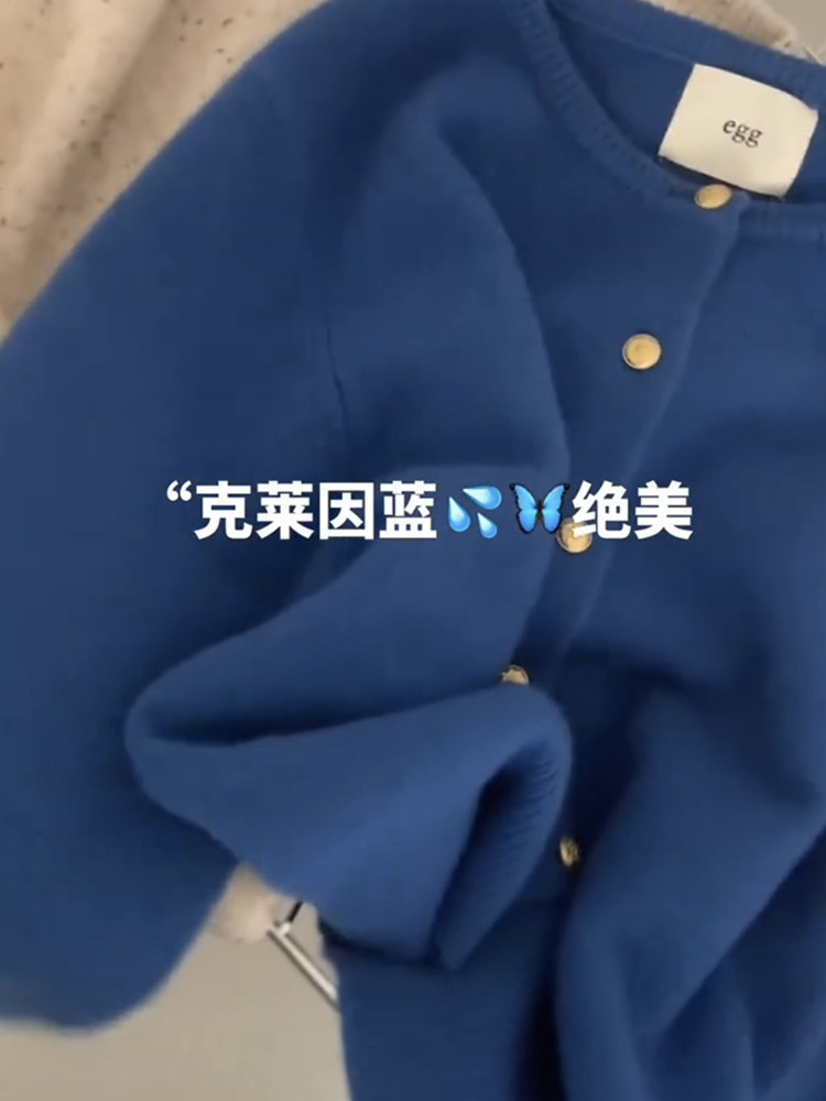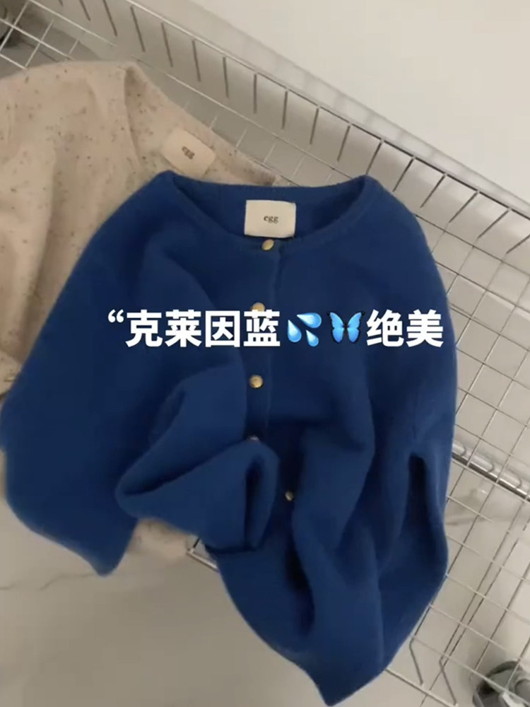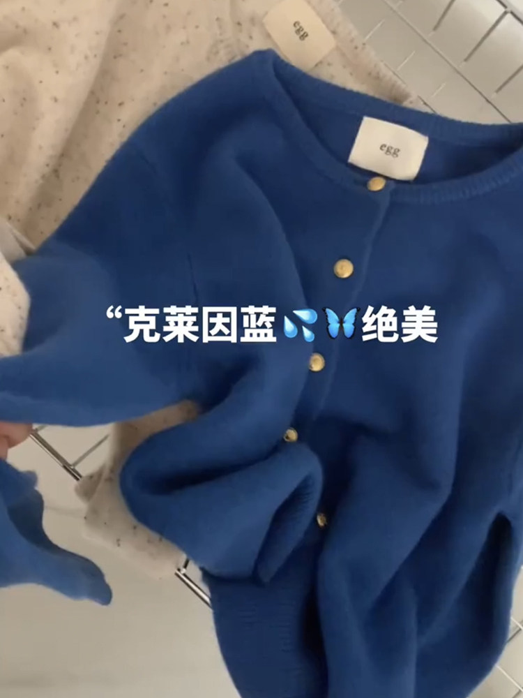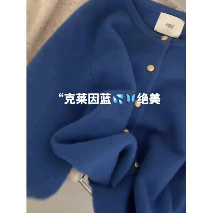 慵懶風大碼寬松毛衣女秋冬韓系克萊因藍色小金釦羊毛針織開衫外套