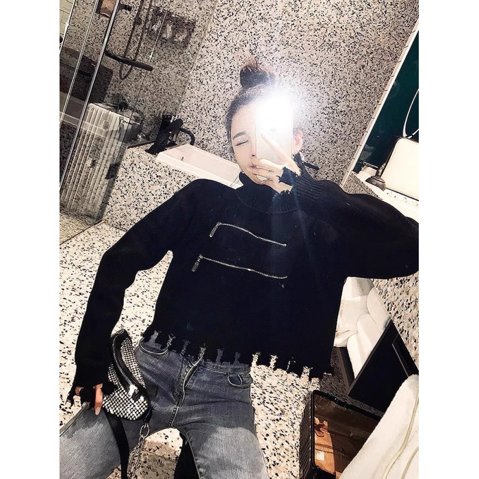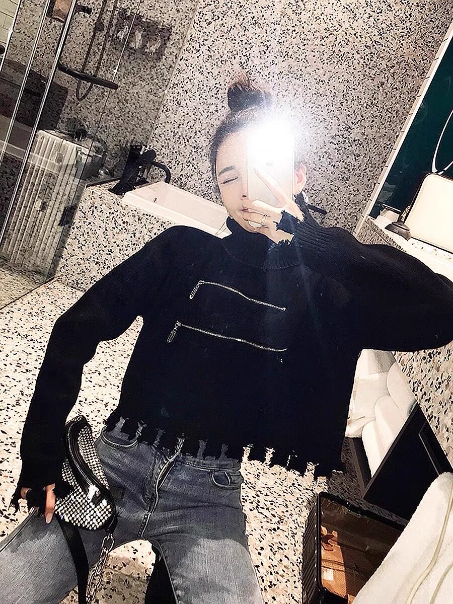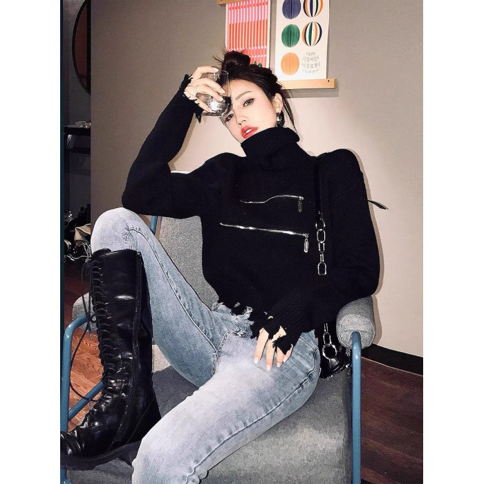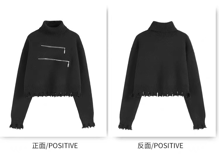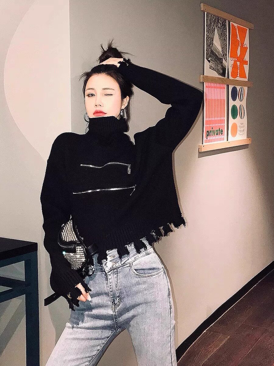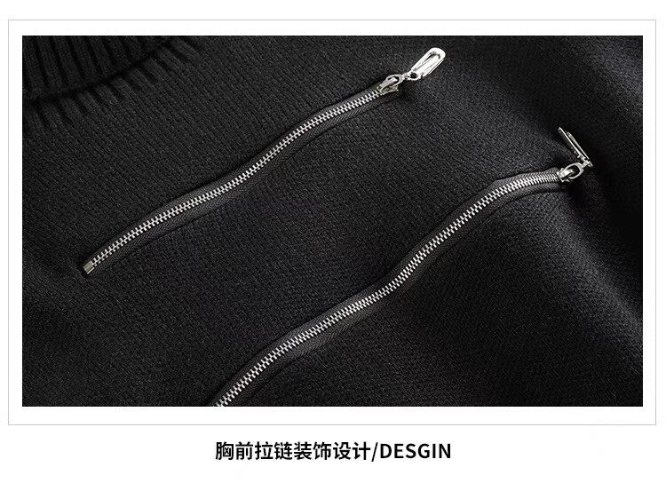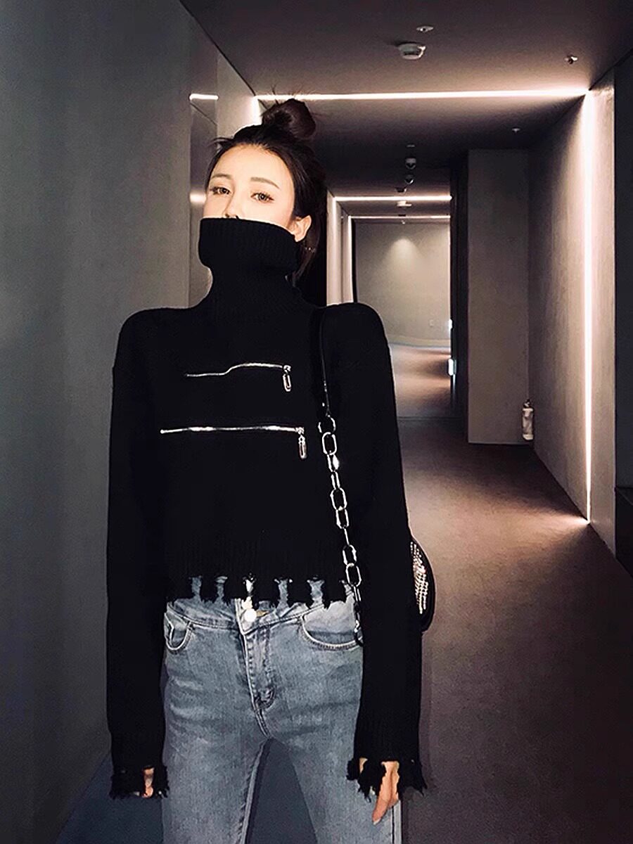 高領短款外穿毛衣女2023秋冬新款拉鍊小衆設計感寬松針織打底上衣