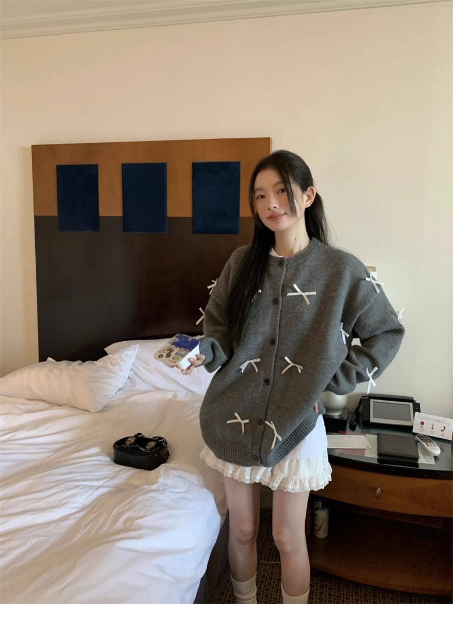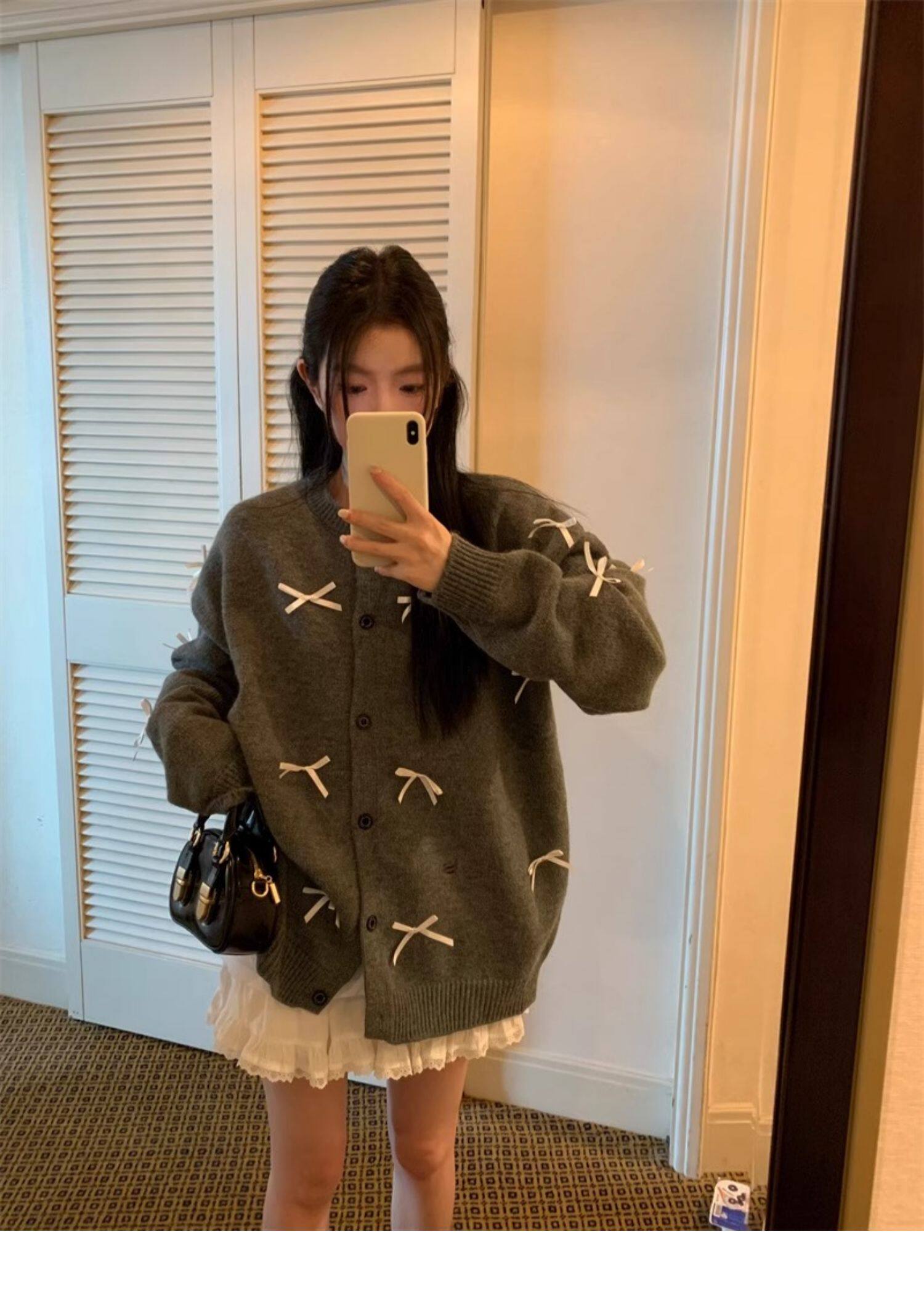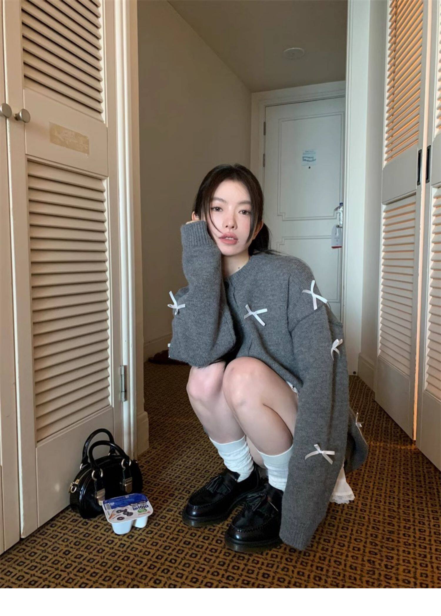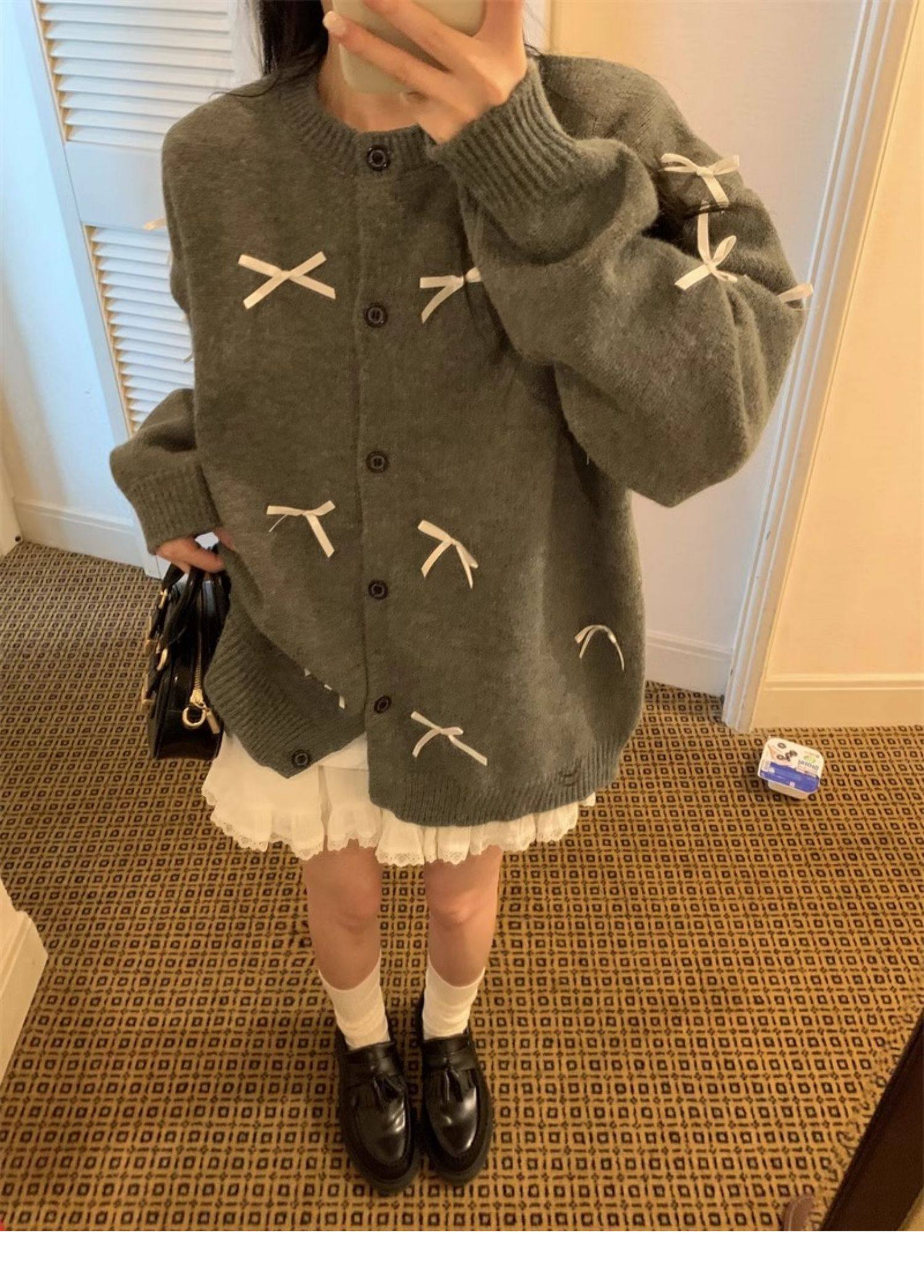 miu系蝴蝶結圓領毛衣外套女秋冬寬松慵懶風復古高知加厚針織開衫