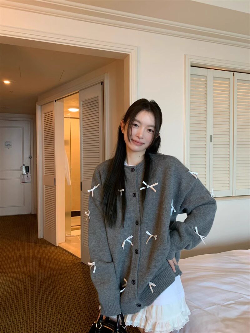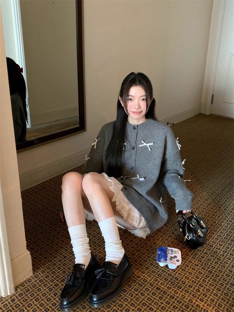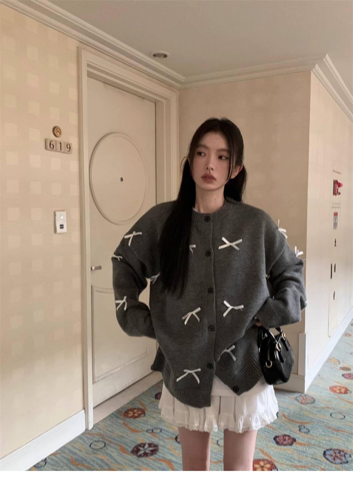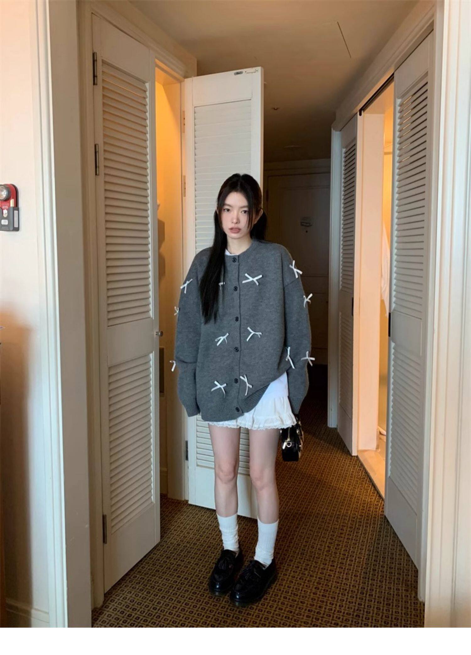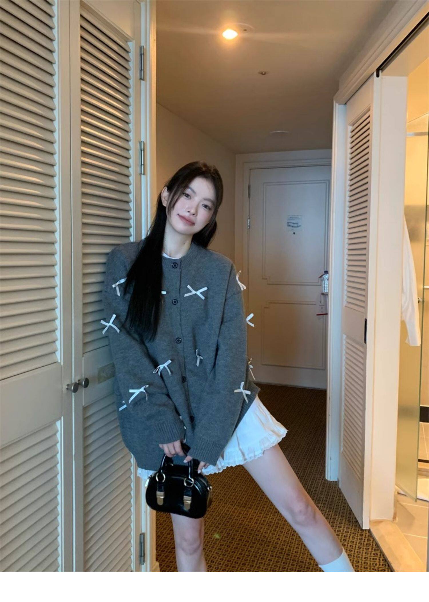 miu系蝴蝶結圓領毛衣外套女秋冬寬松慵懶風復古高知加厚針織開衫