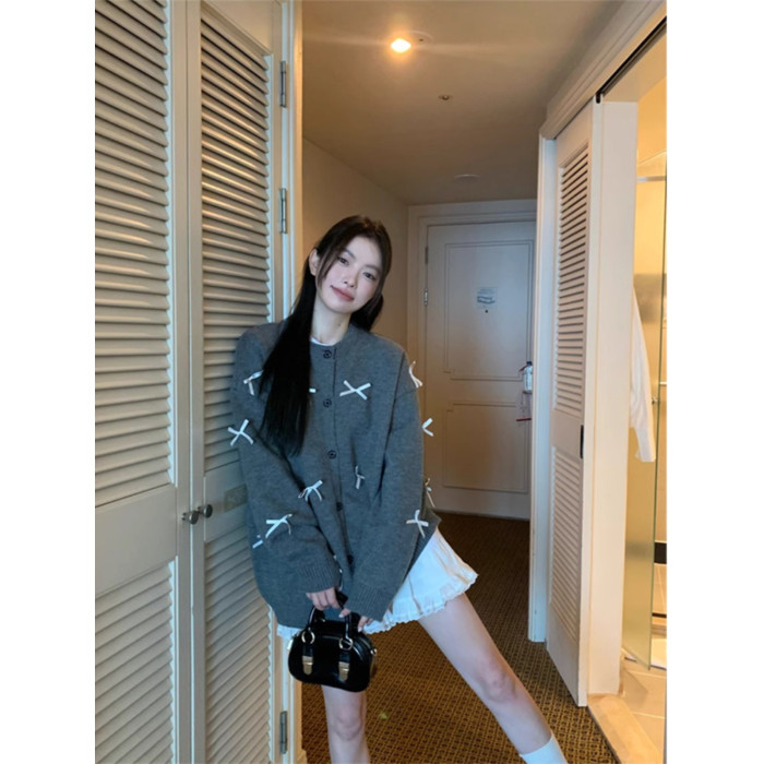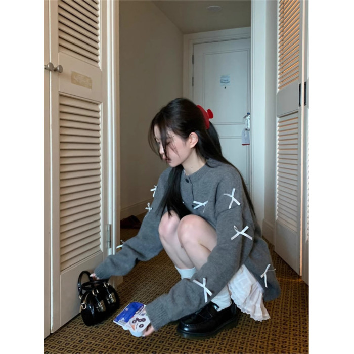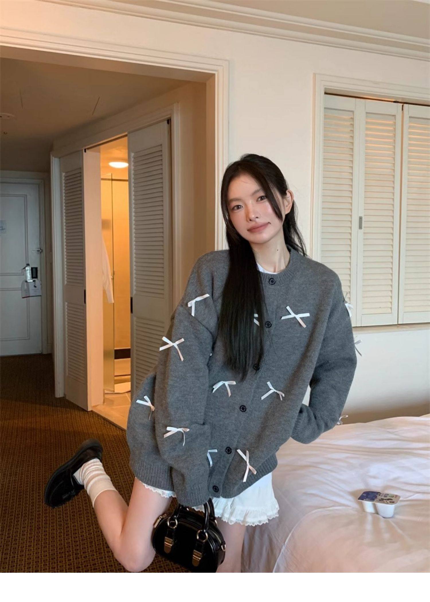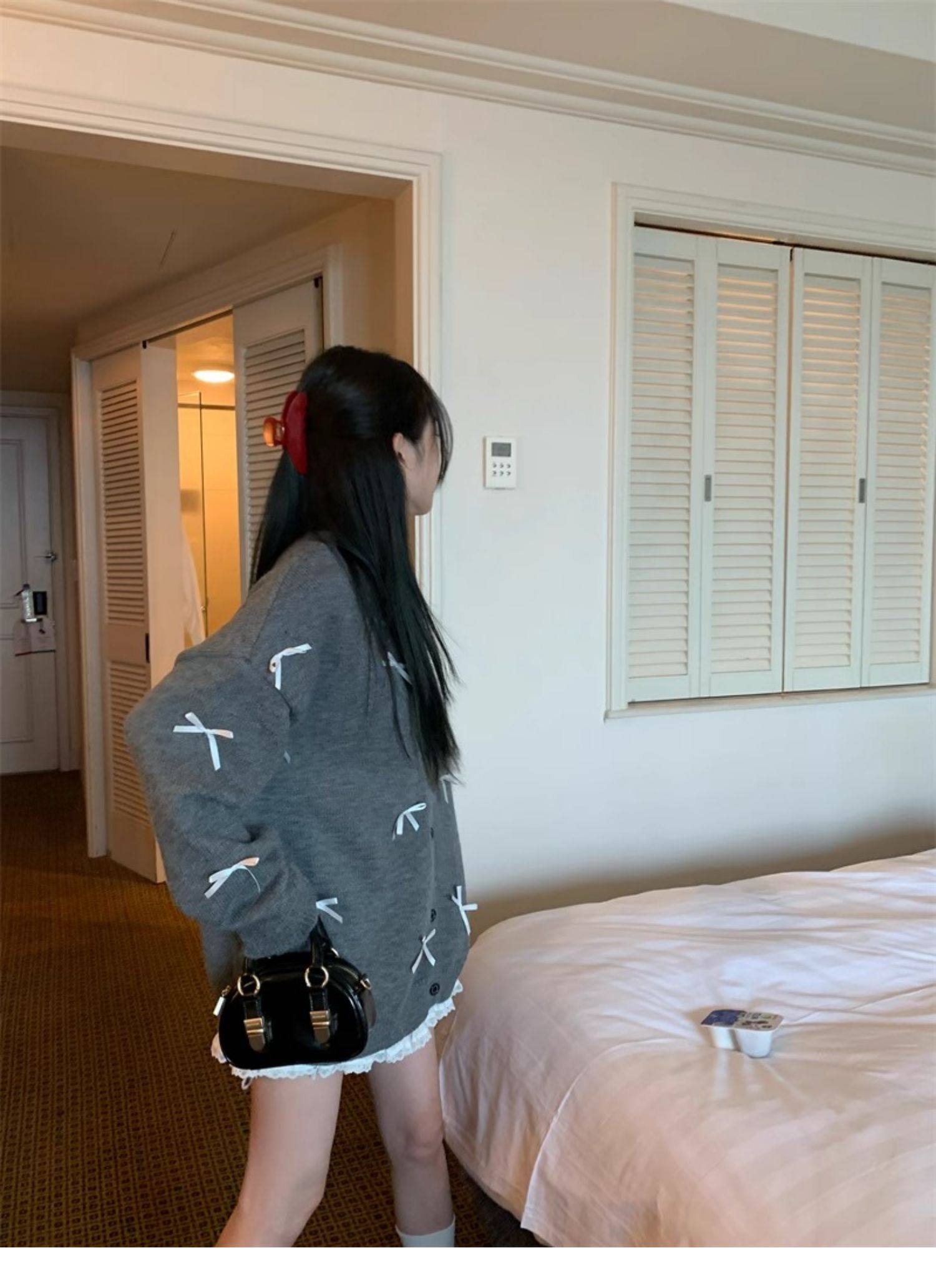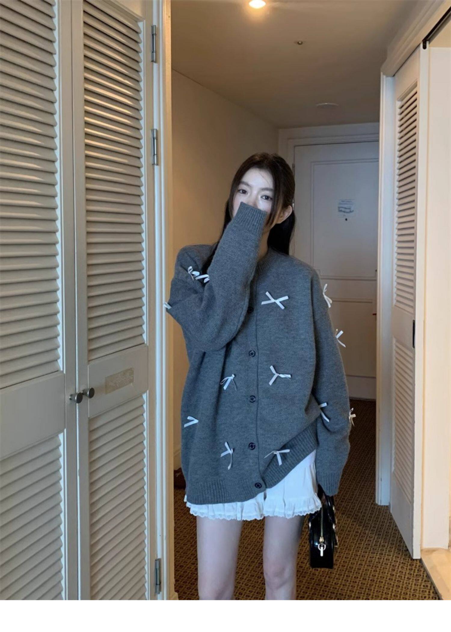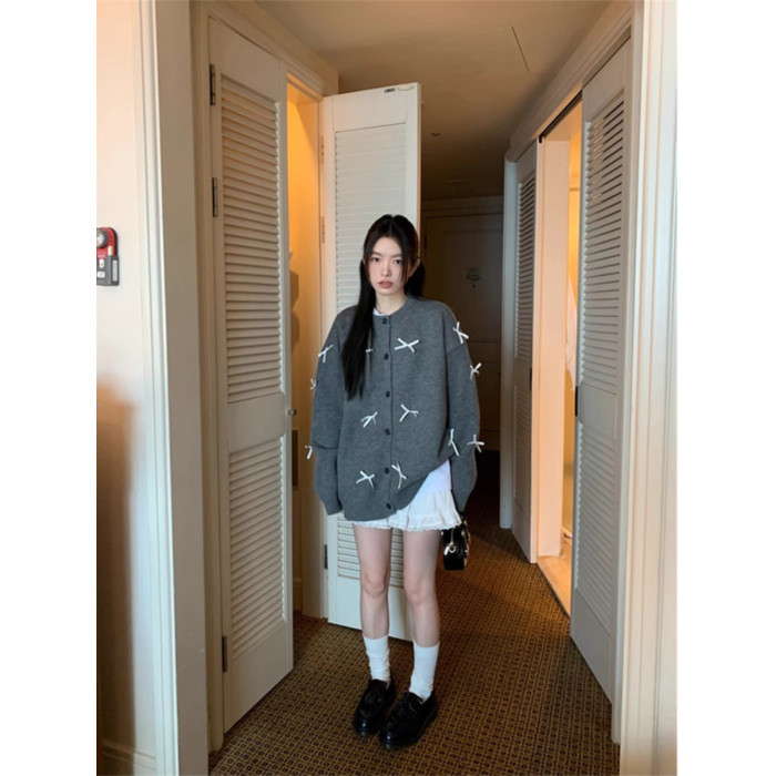 miu系蝴蝶結圓領毛衣外套女秋冬寬松慵懶風復古高知加厚針織開衫