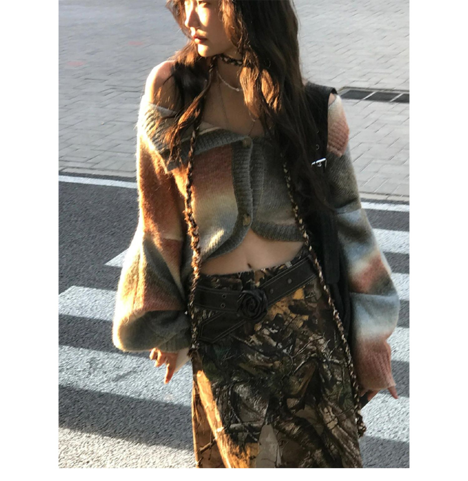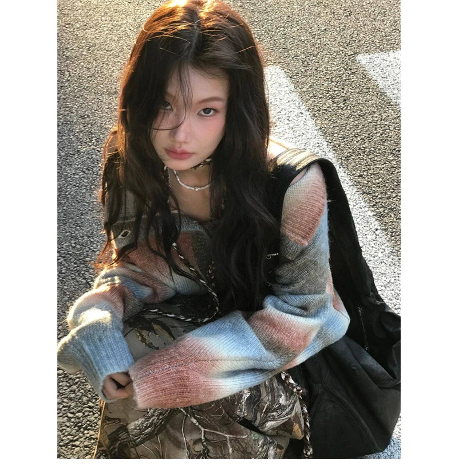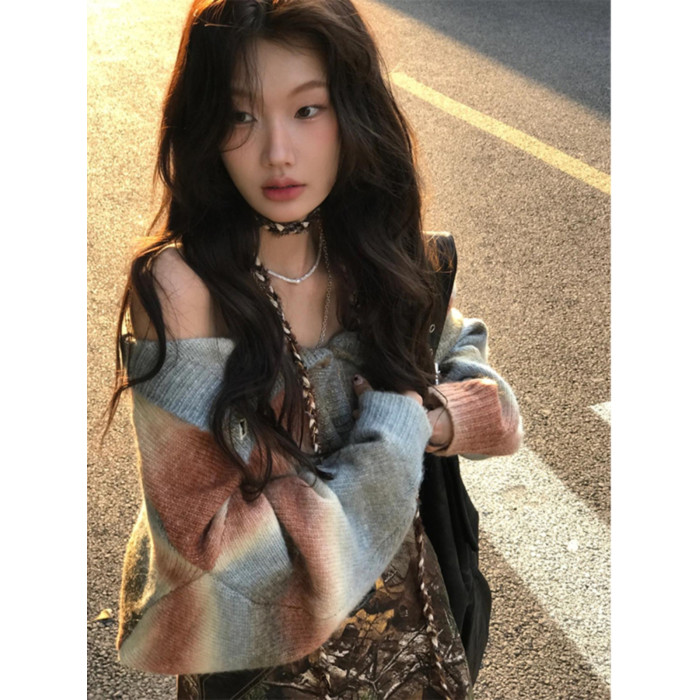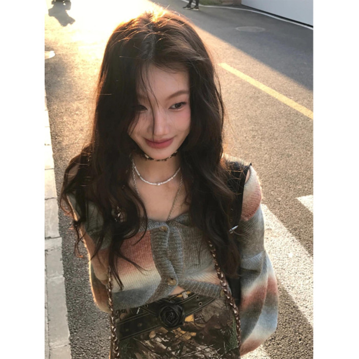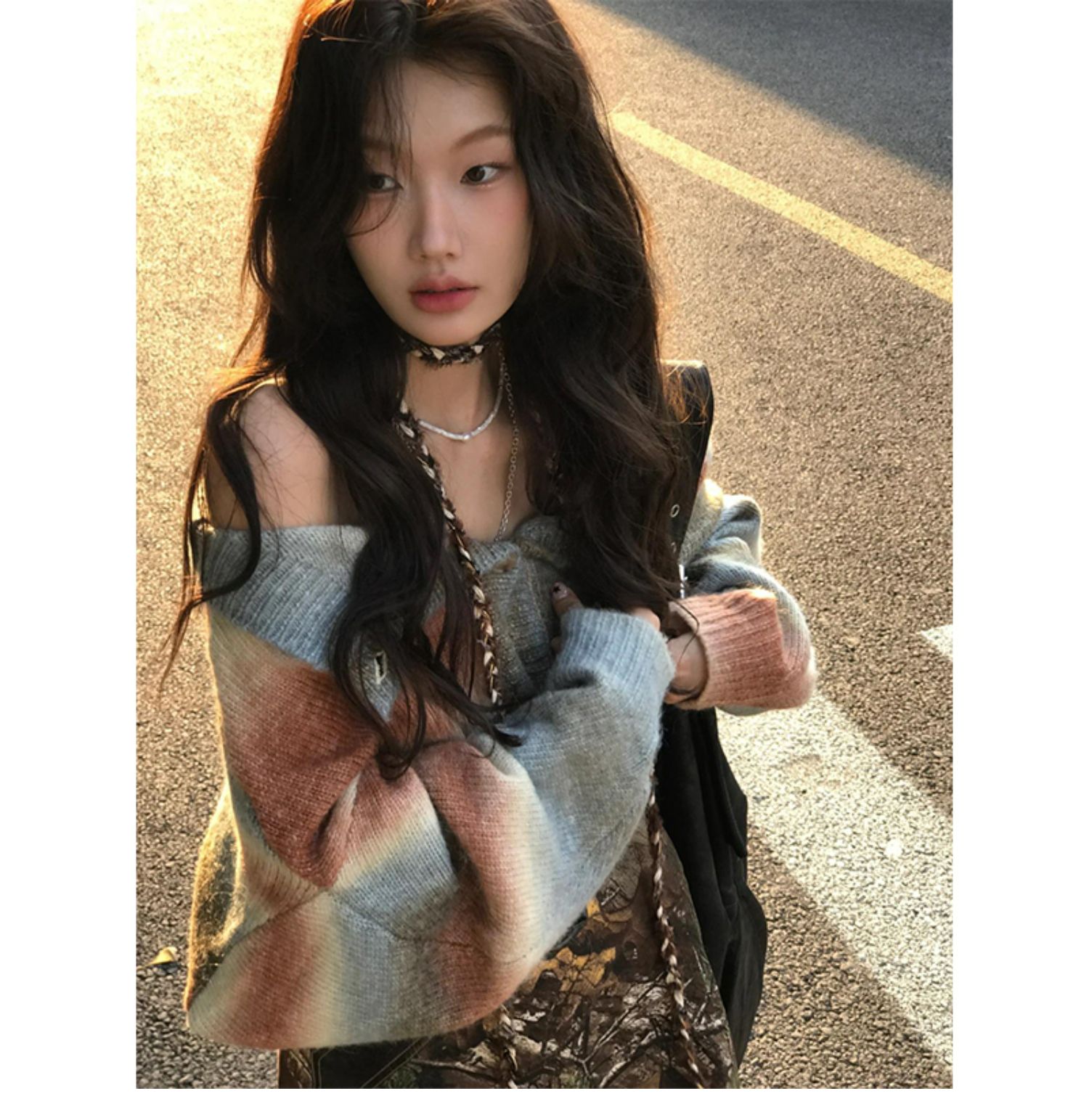 Turn up/陳腿兒 漸變條紋一字肩針織開衫女慵懶風辣妹兩穿毛衣ins