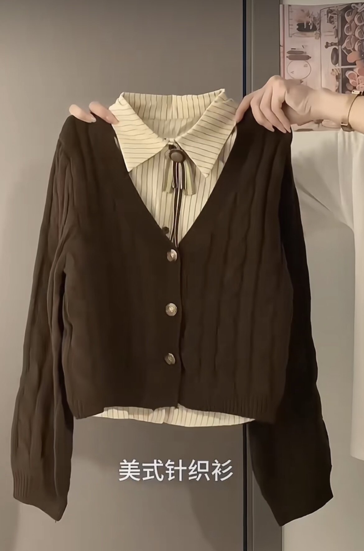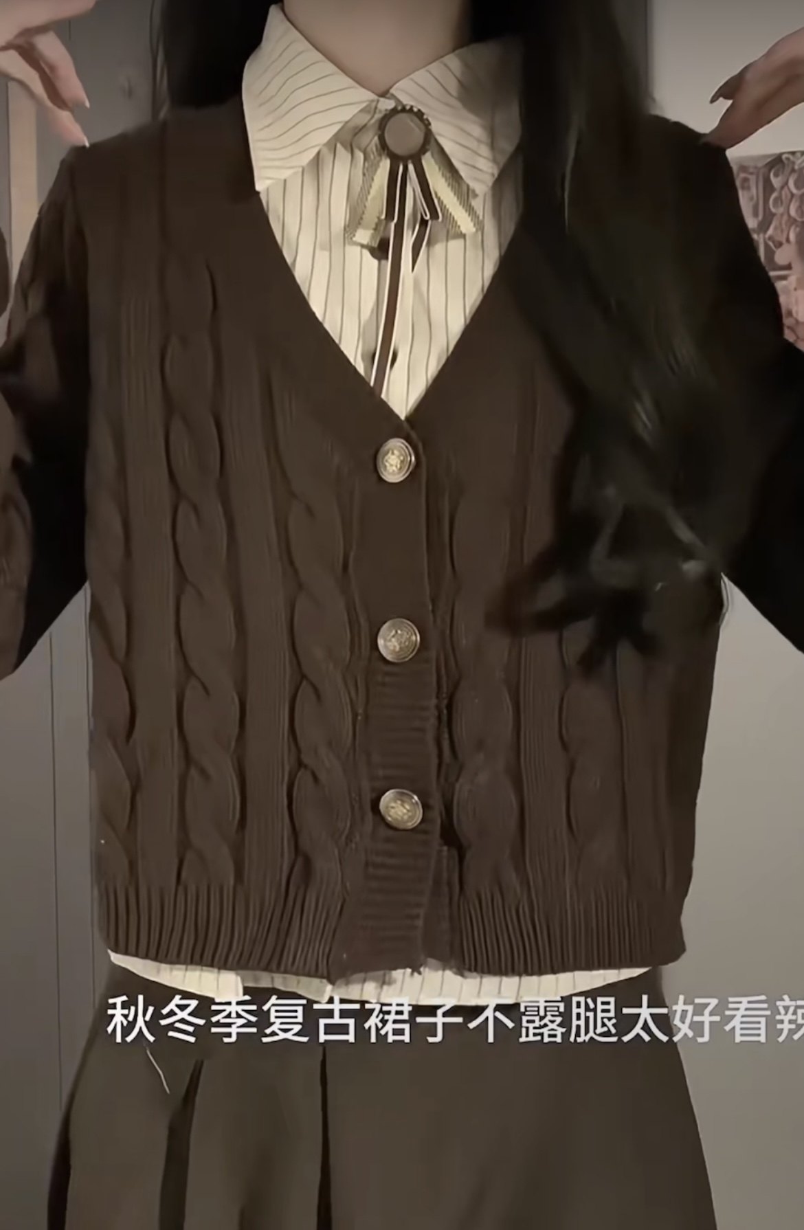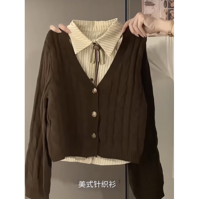 美拉德棕色麻花假兩件毛衣女秋冬復古慵懶學院風針織開衫外套上衣