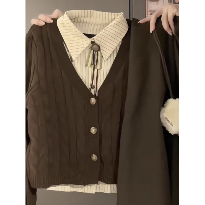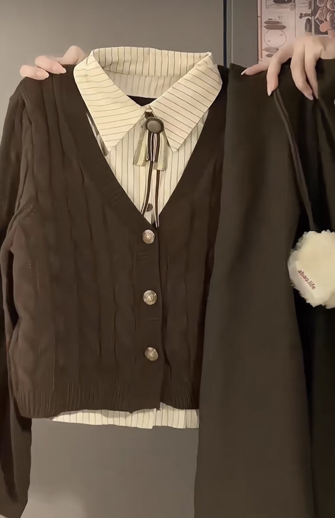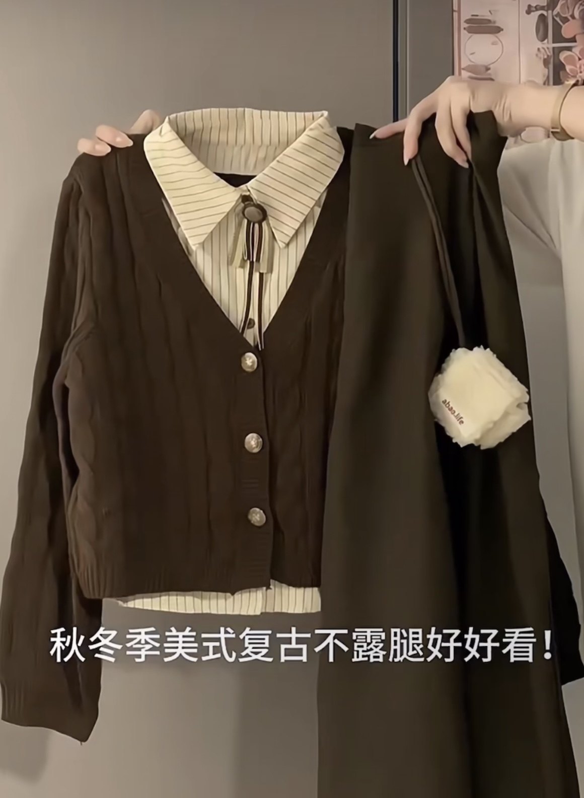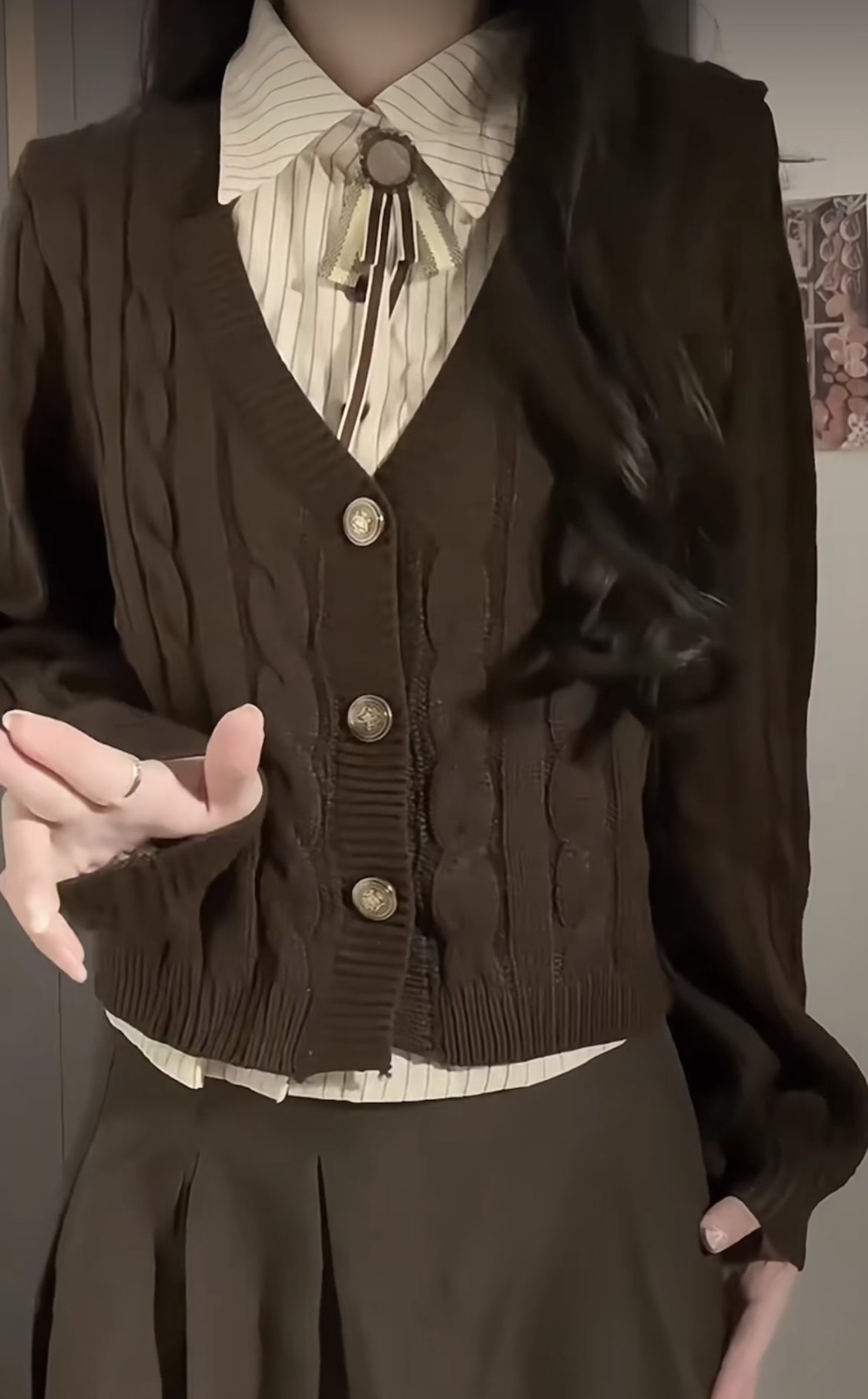 美拉德棕色麻花假兩件毛衣女秋冬復古慵懶學院風針織開衫外套上衣