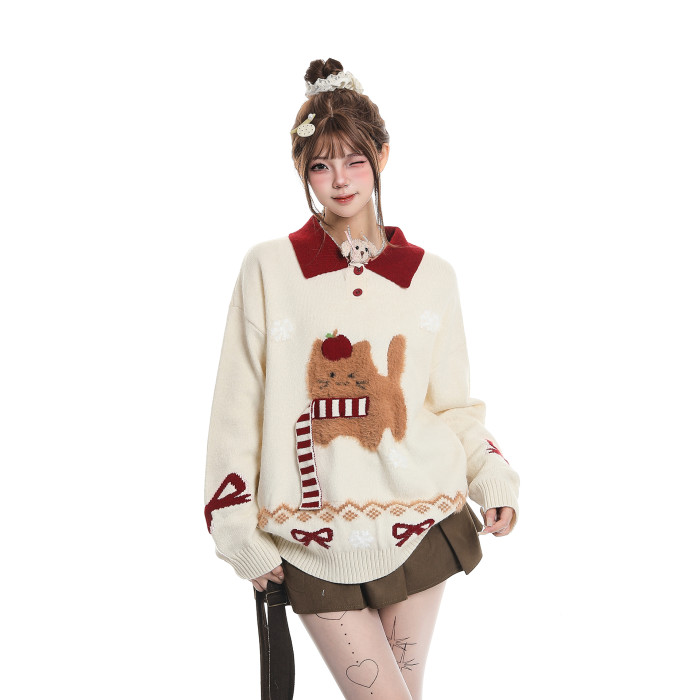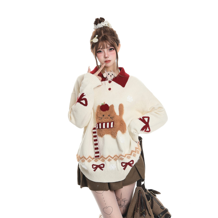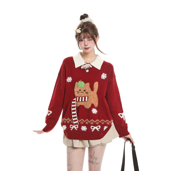 可愛圍巾小狗撞色繙領毛衣女秋冬慵嬾風聖誕節穿搭軟糯針織衫上衣