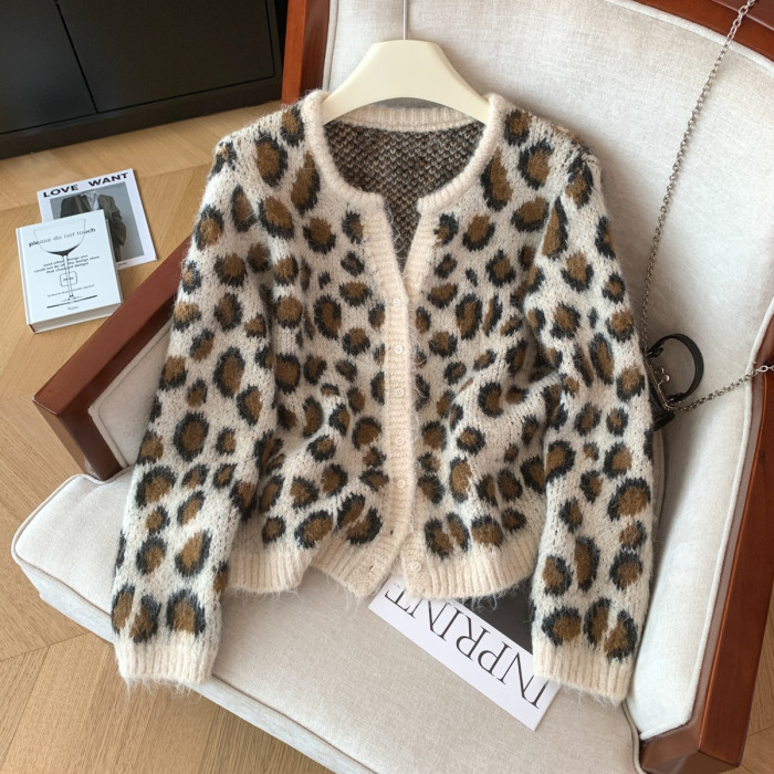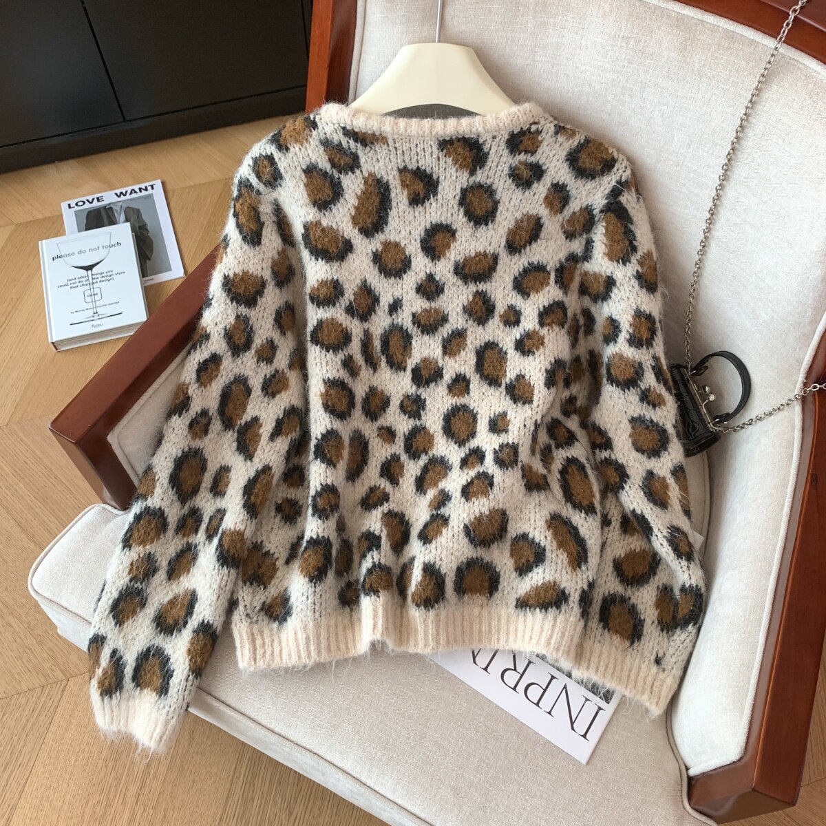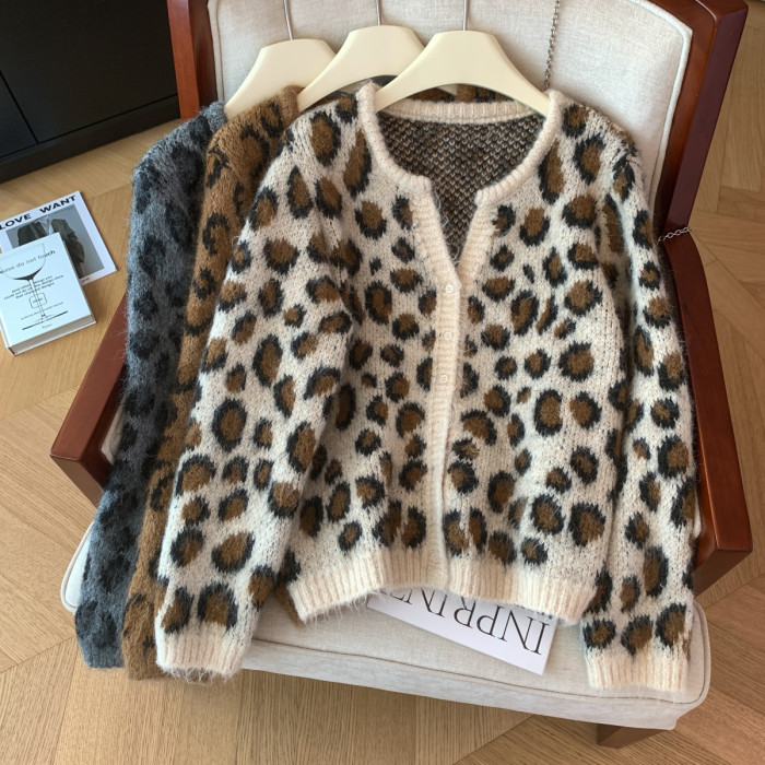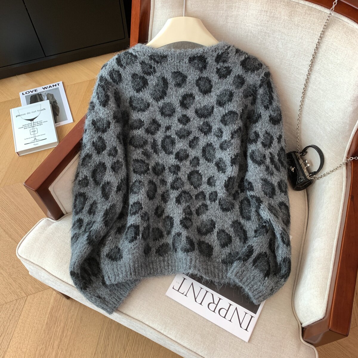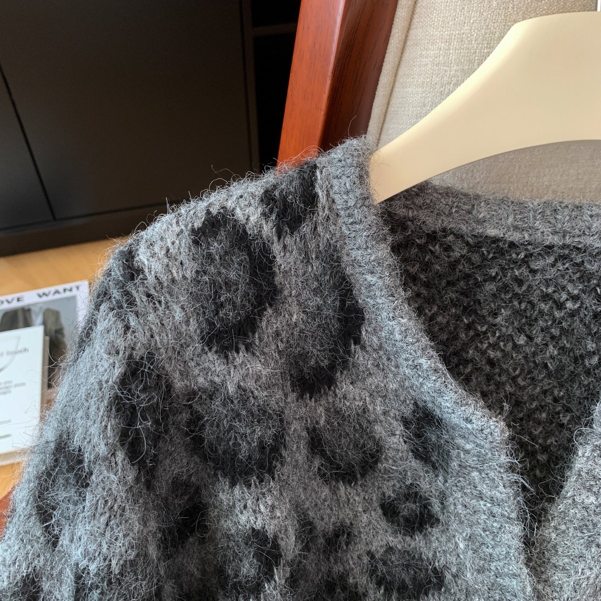 美式慵懶軟糯豹紋開衫外套毛衣女秋冬設計感洋氣寬松針織衫上衣潮