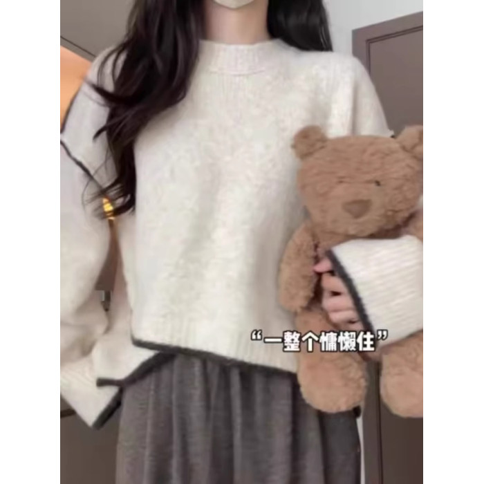 小衆設計感不規則撞色休閒圓領毛衣女秋冬慵懶百搭軟糯寬松針織衫