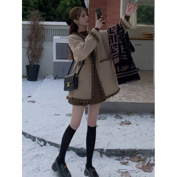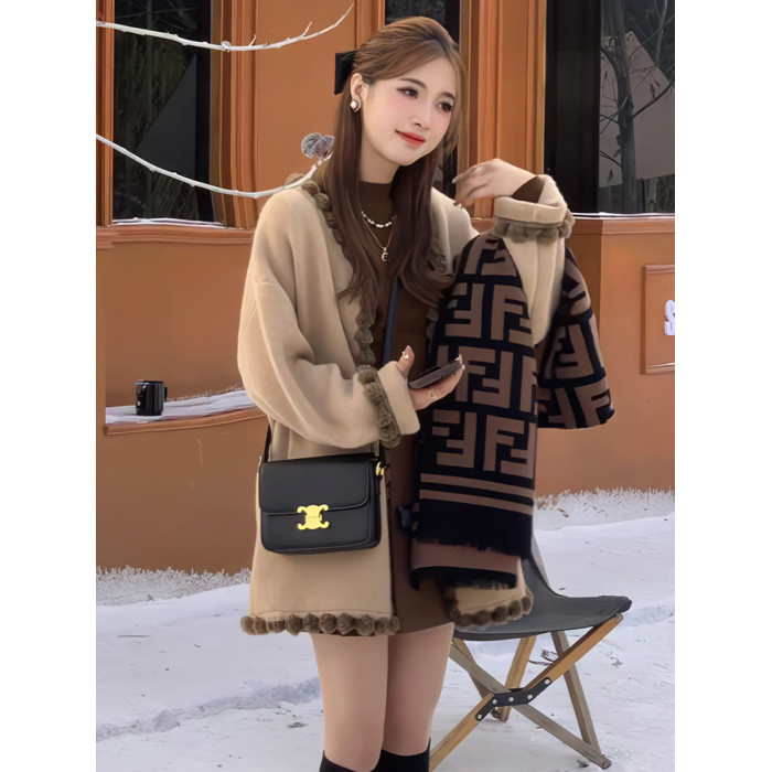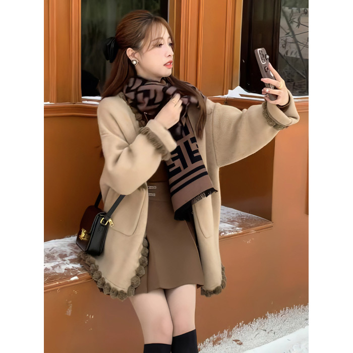 秋冬新款織帶V領長袖落肩毛衣外套女小衆設計感寬松休閒夾棉上衣