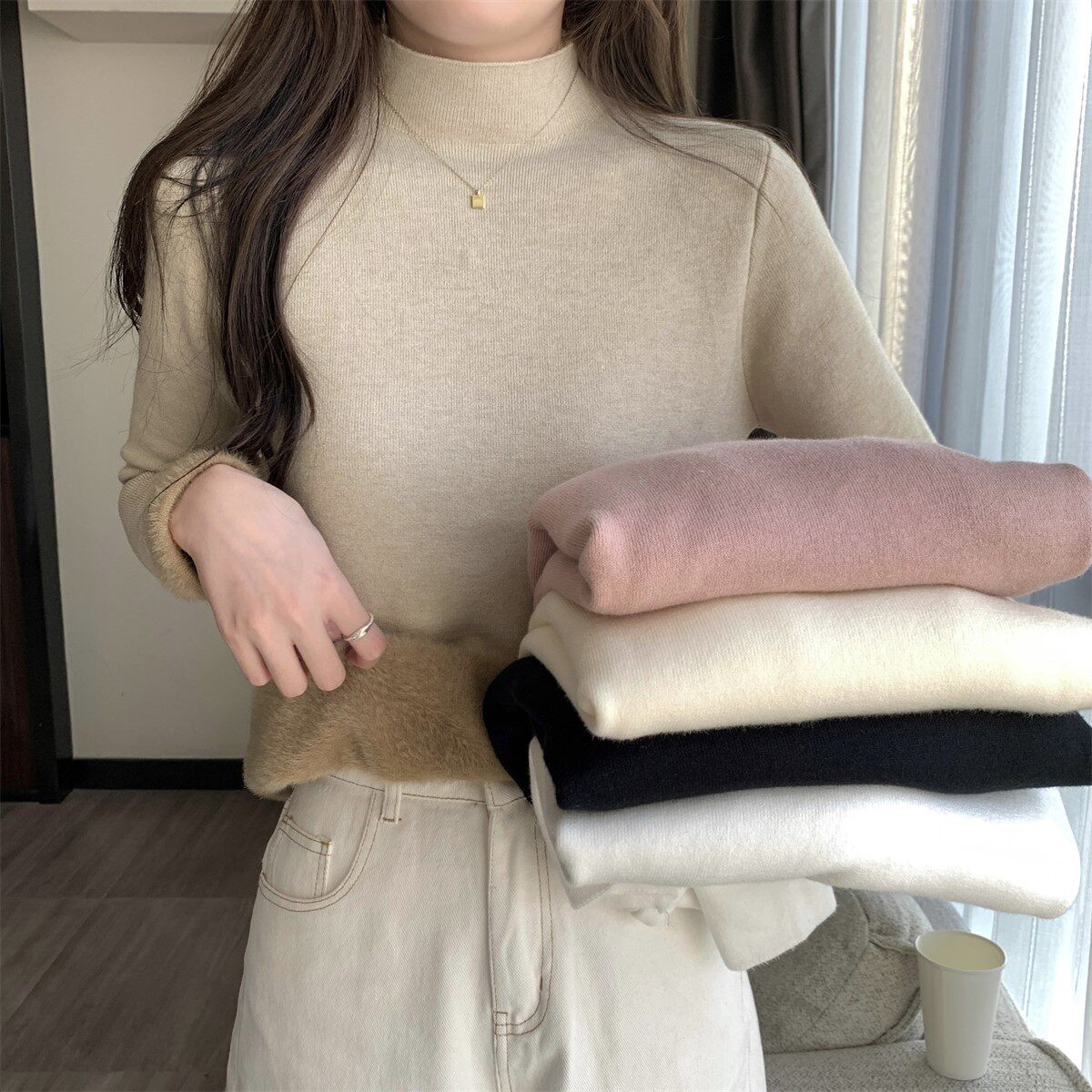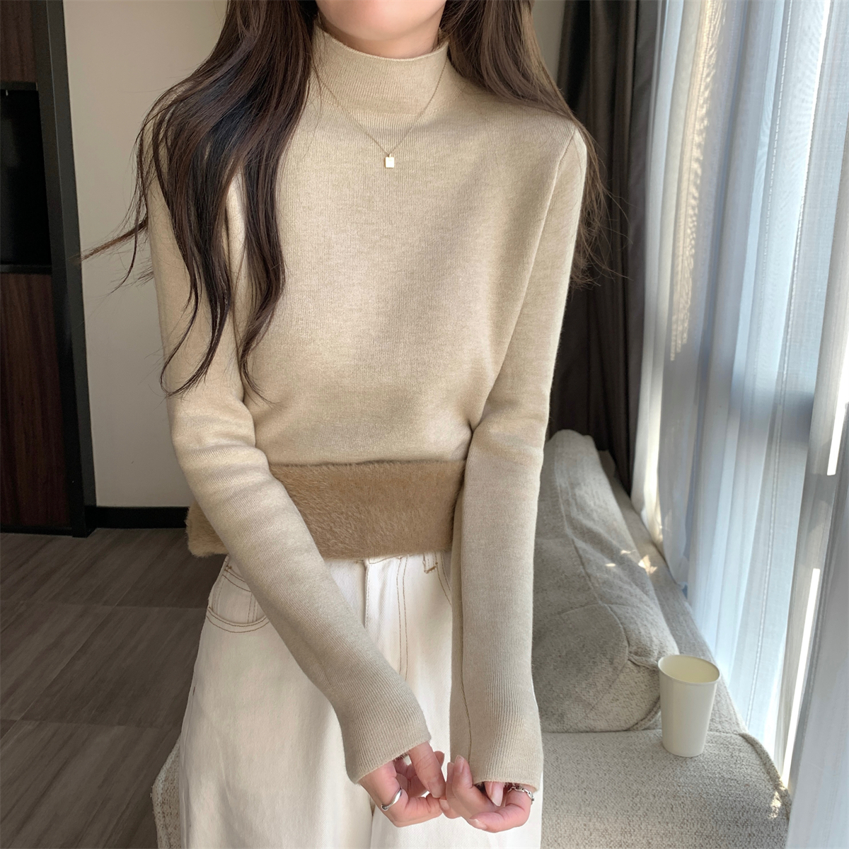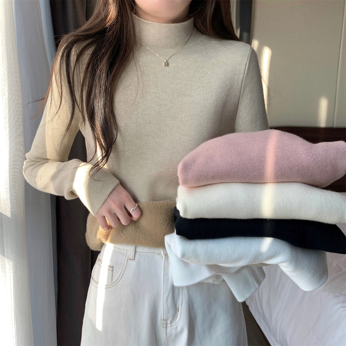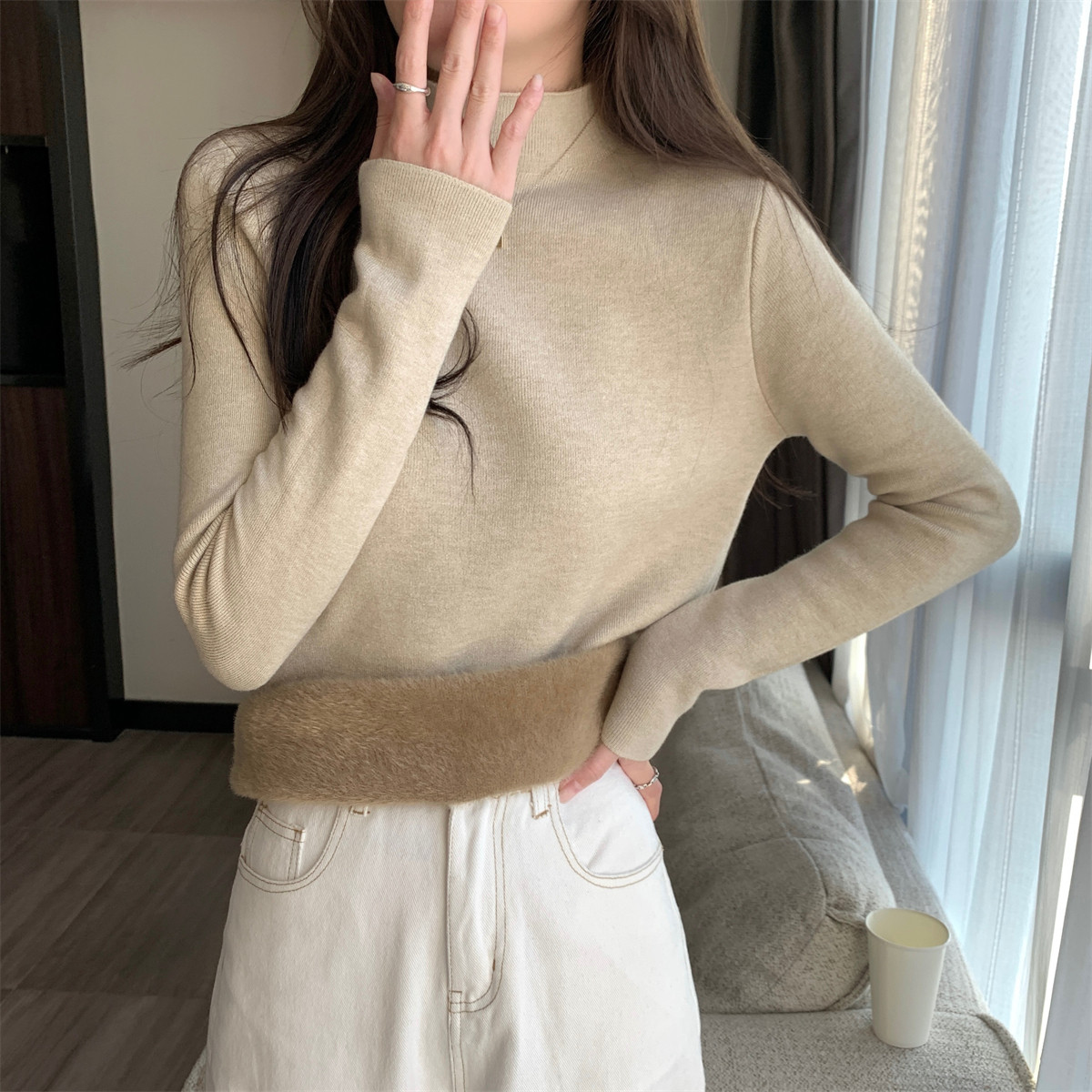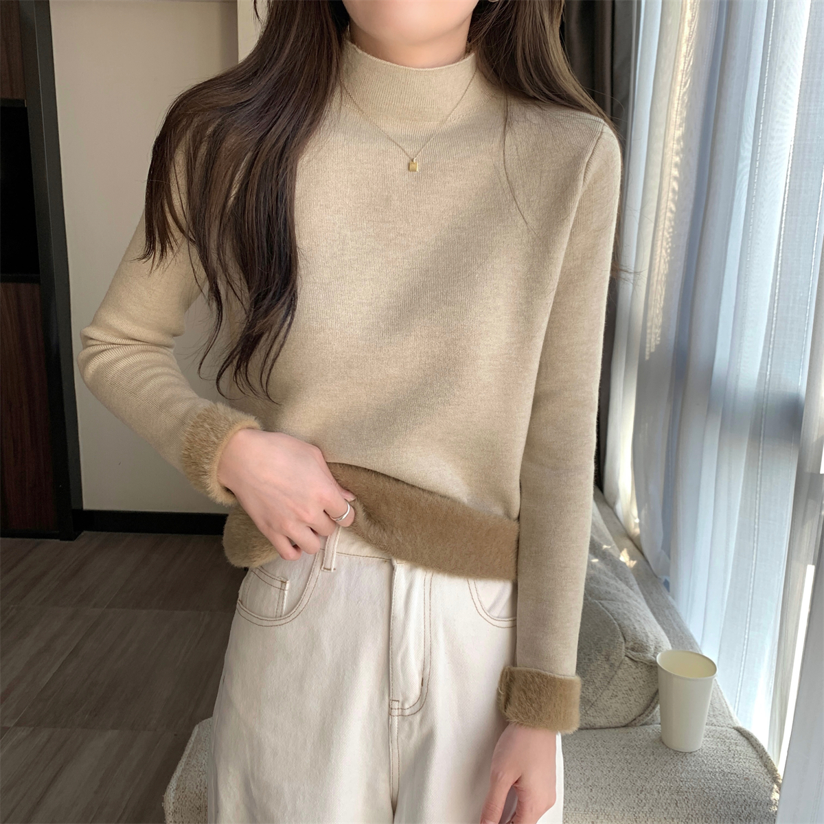 溫柔燕麥色長袖半高領加絨加厚修身毛衣打底衫女春秋冬季保暖內搭