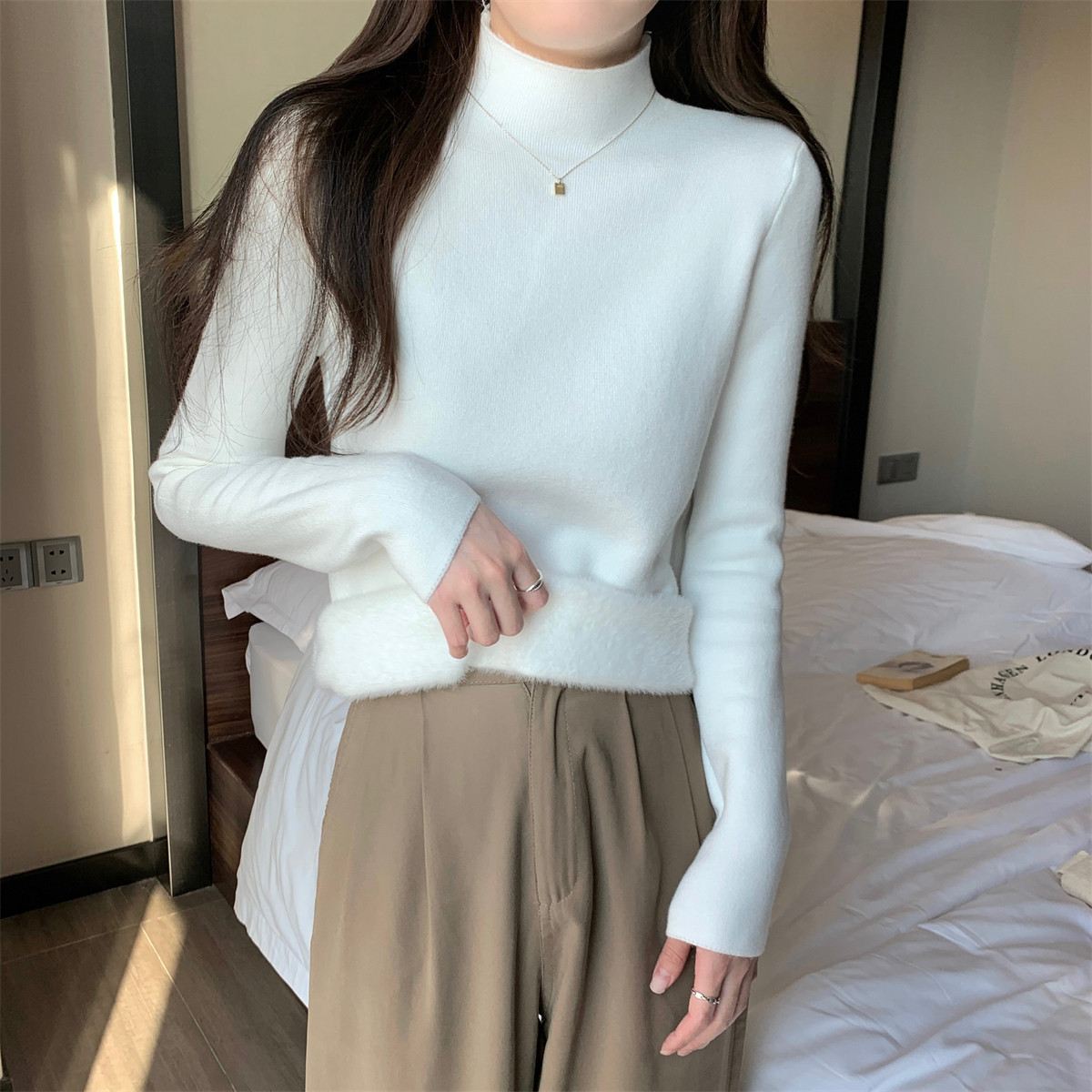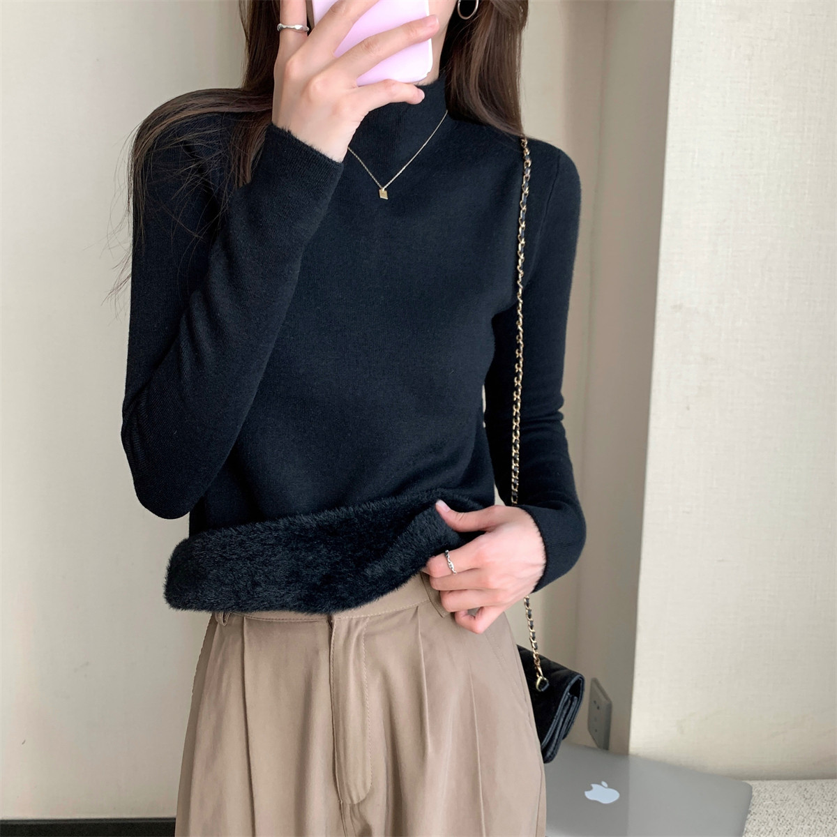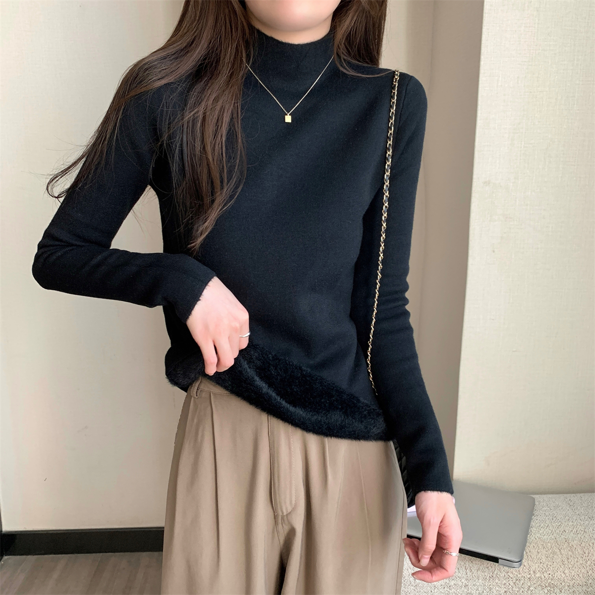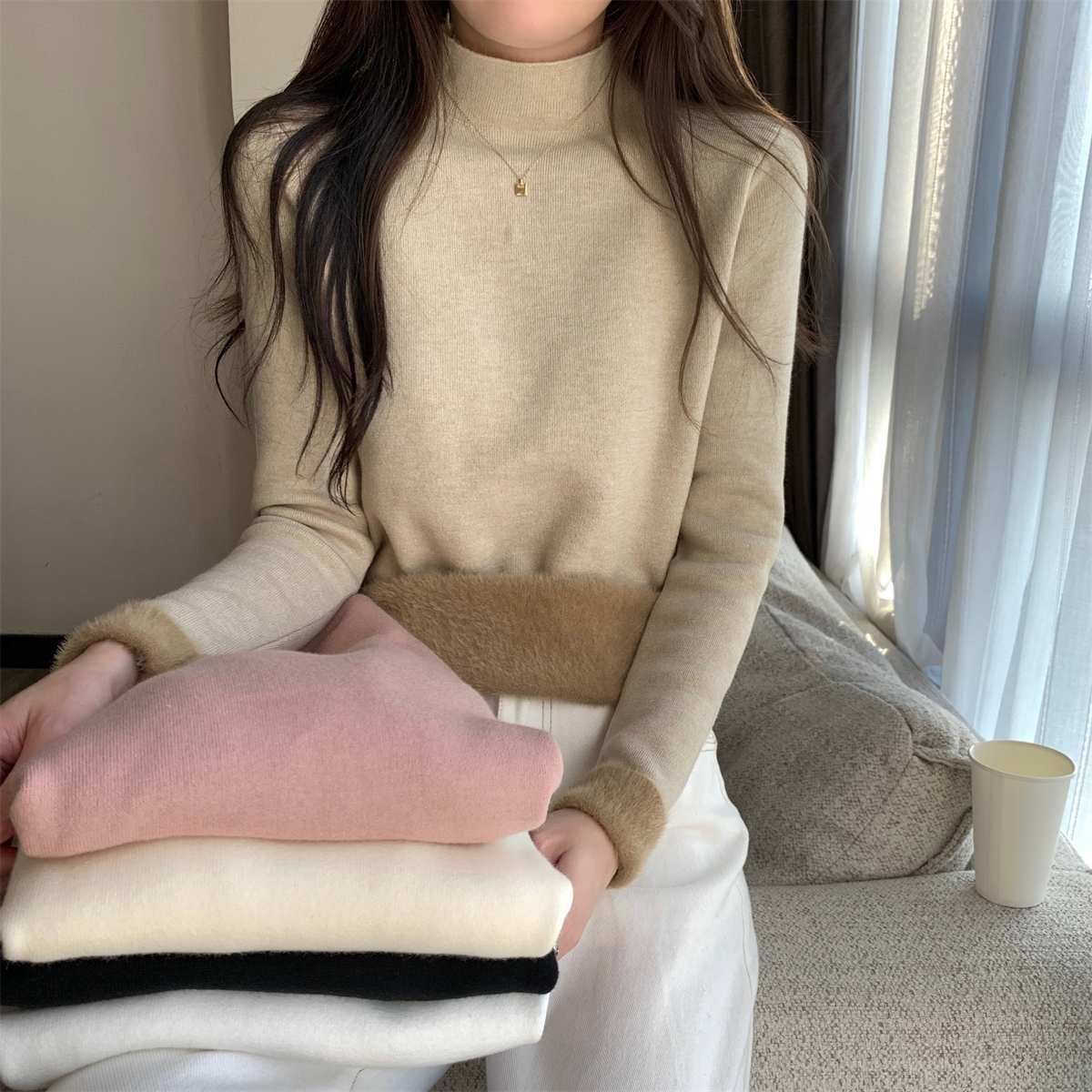 溫柔燕麥色長袖半高領加絨加厚修身毛衣打底衫女春秋冬季保暖內搭