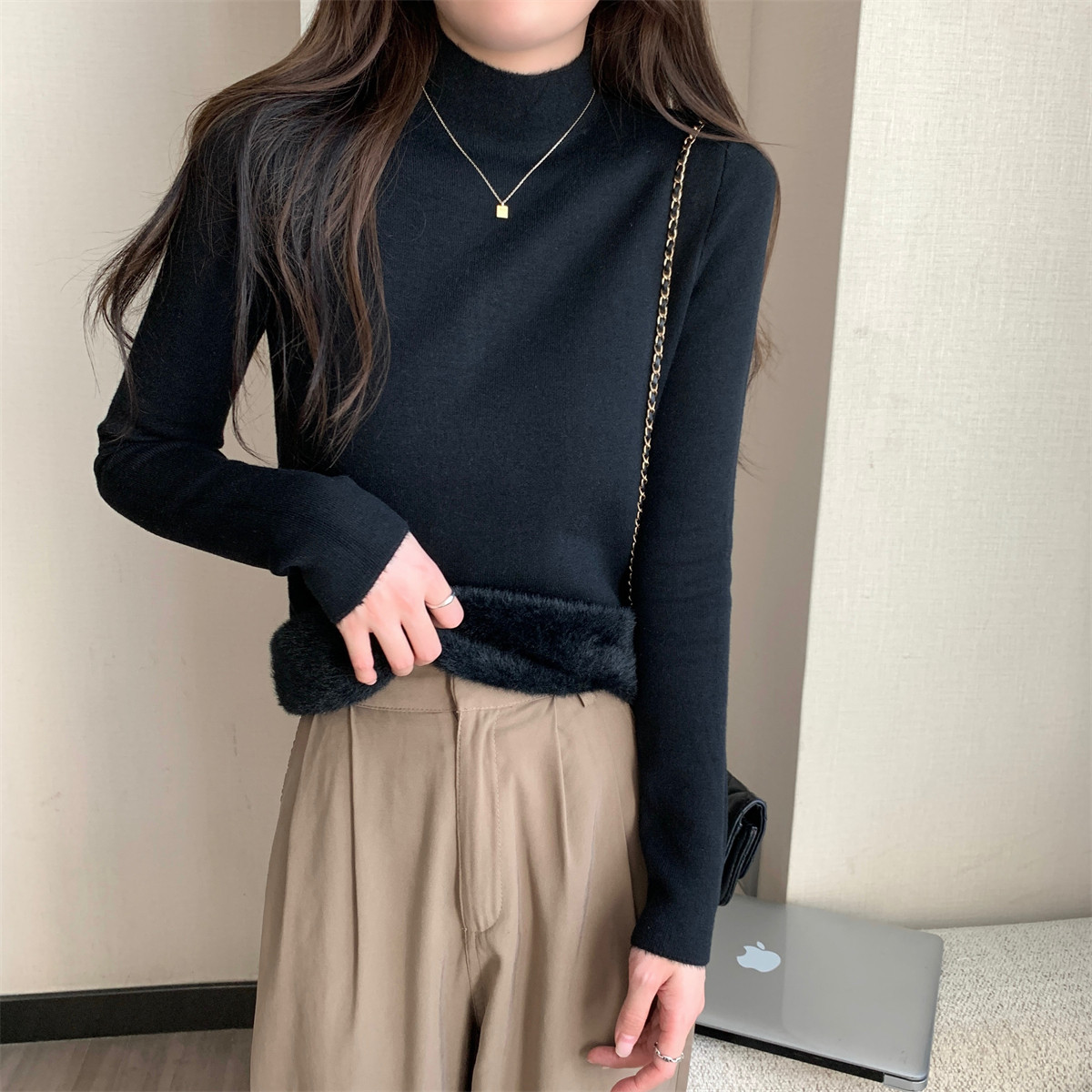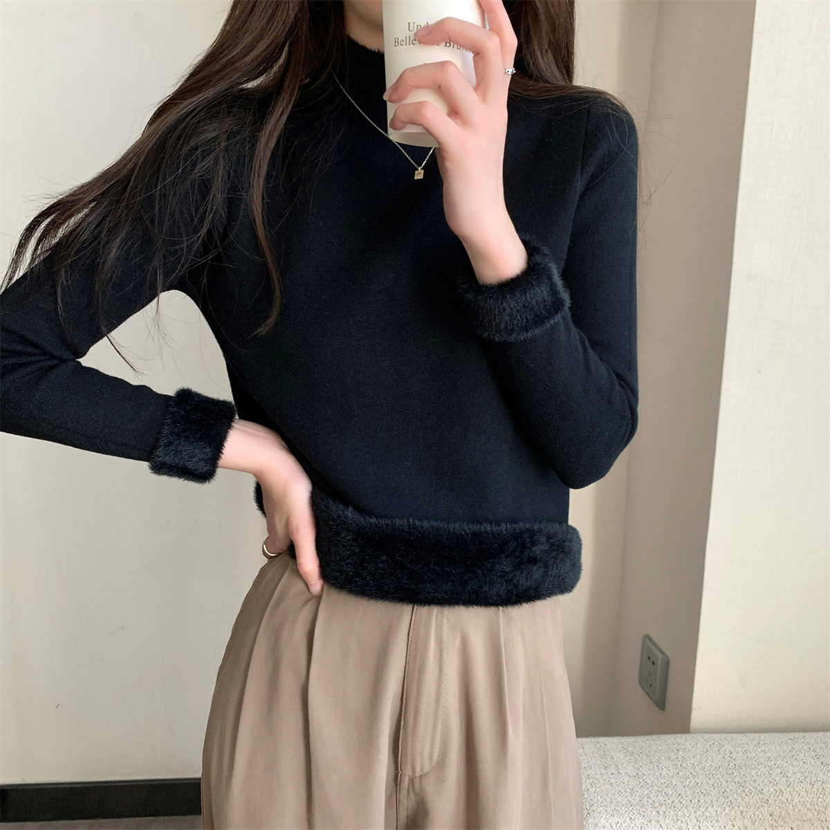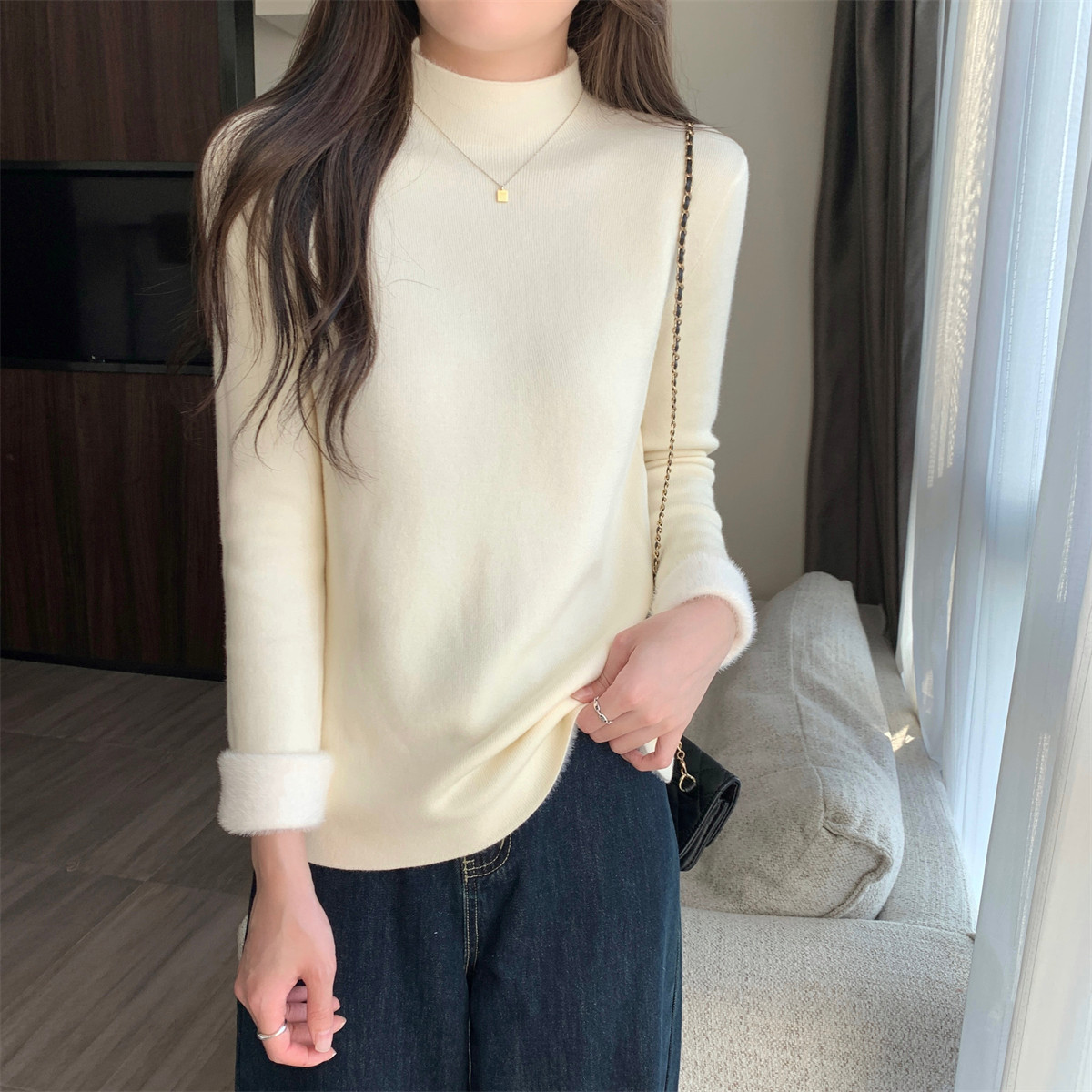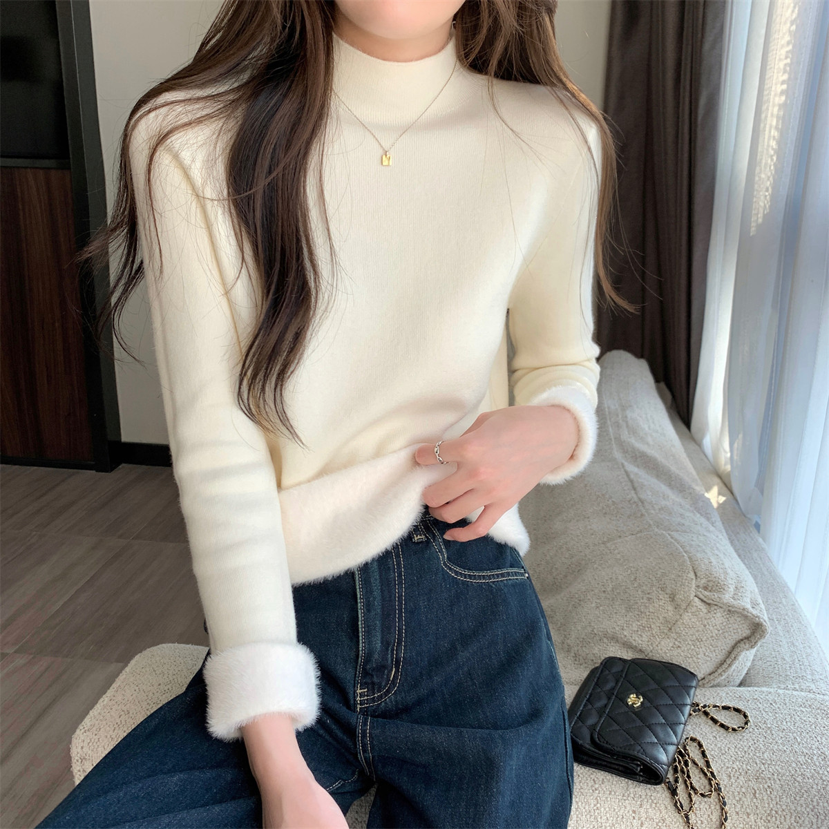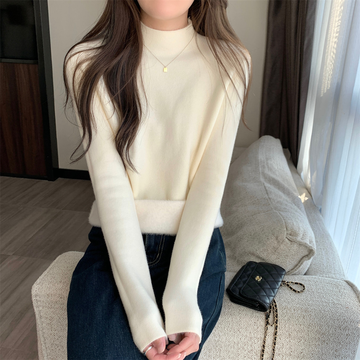 溫柔燕麥色長袖半高領加絨加厚修身毛衣打底衫女春秋冬季保暖內搭