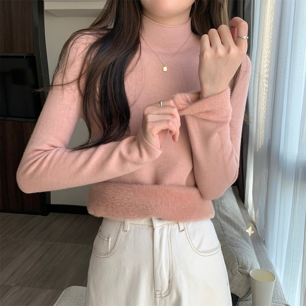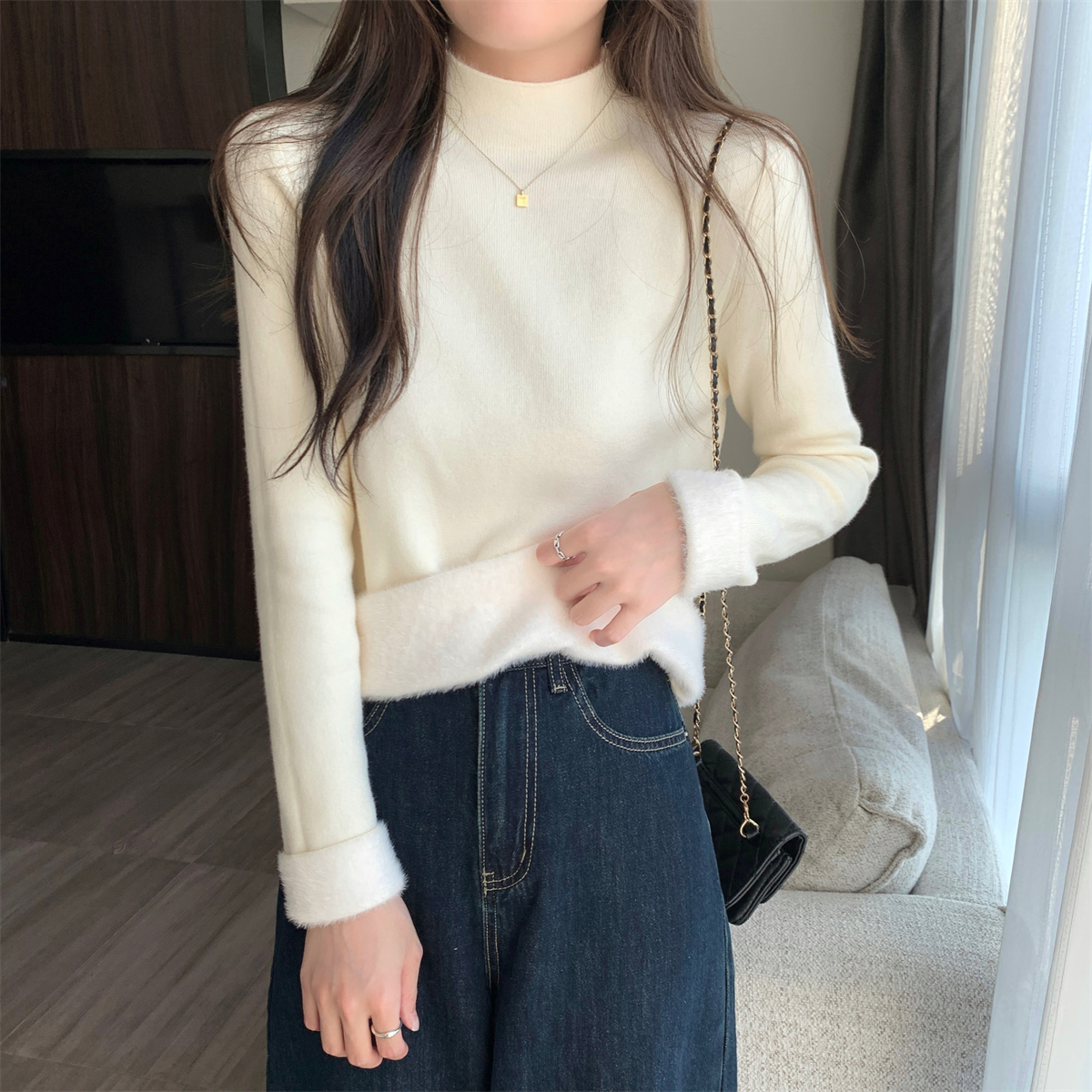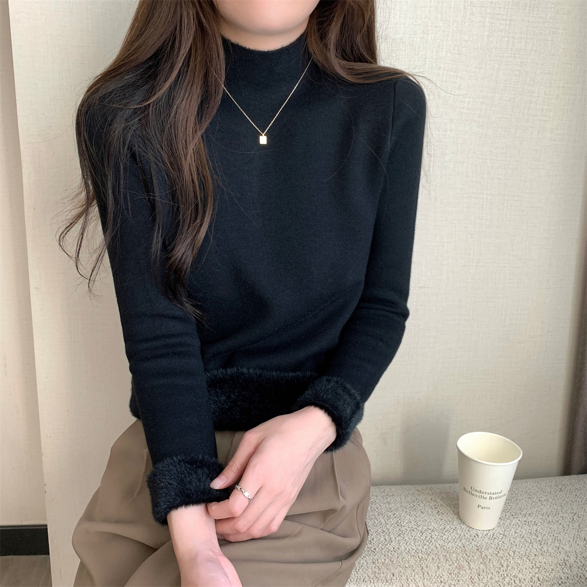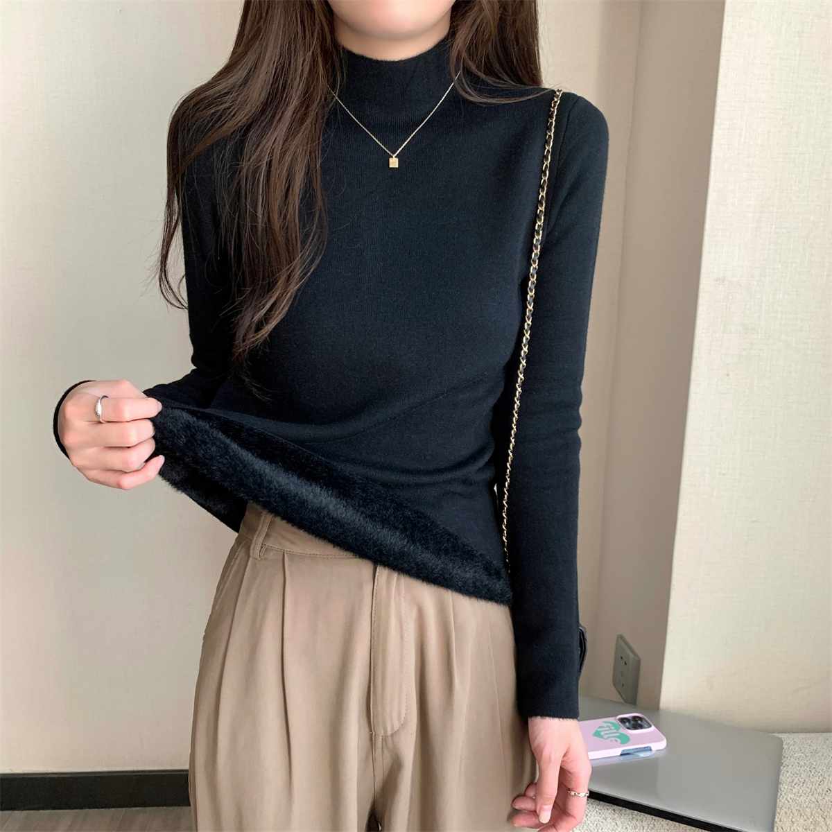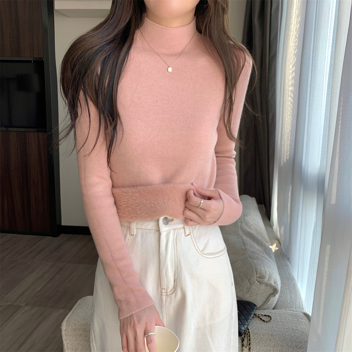 溫柔燕麥色長袖半高領加絨加厚修身毛衣打底衫女春秋冬季保暖內搭