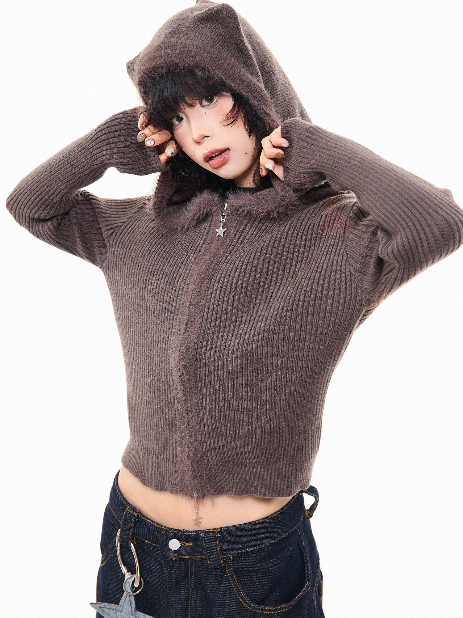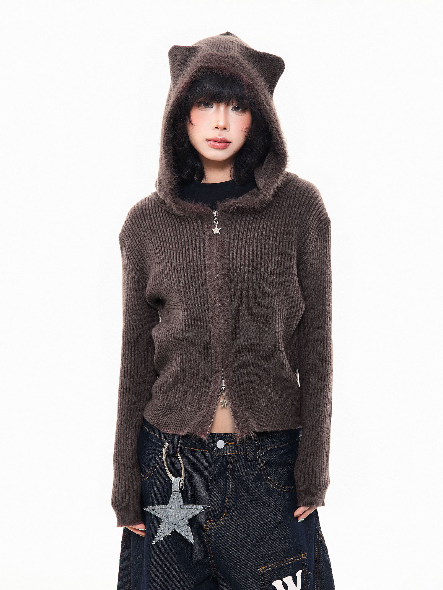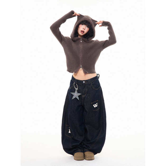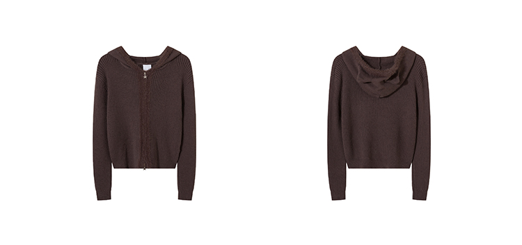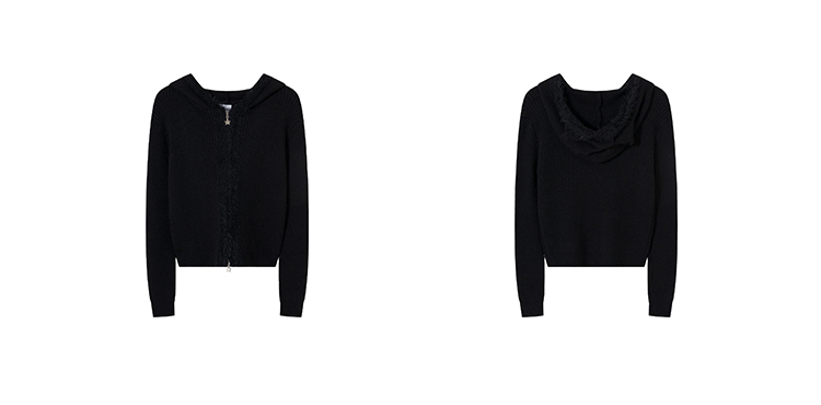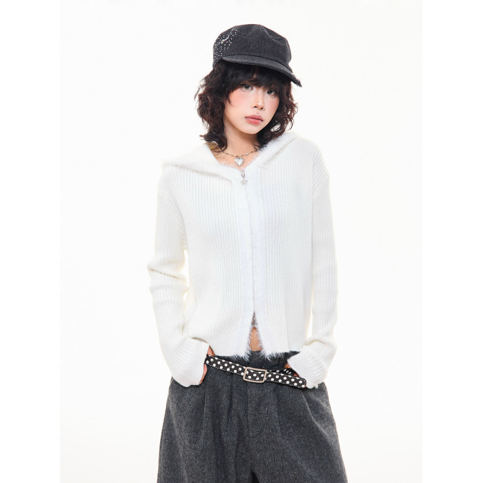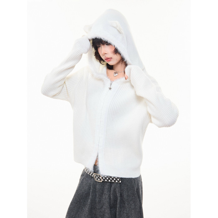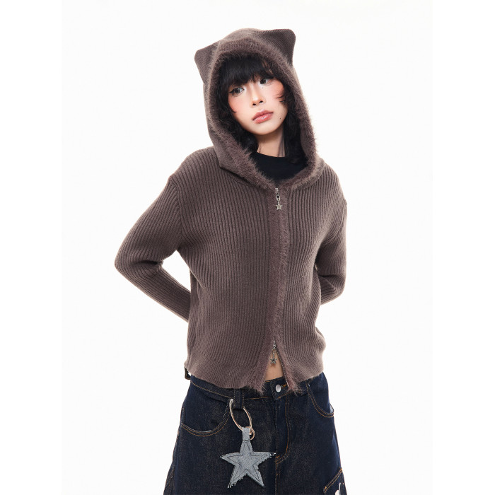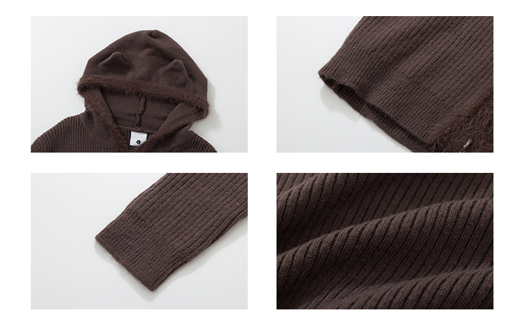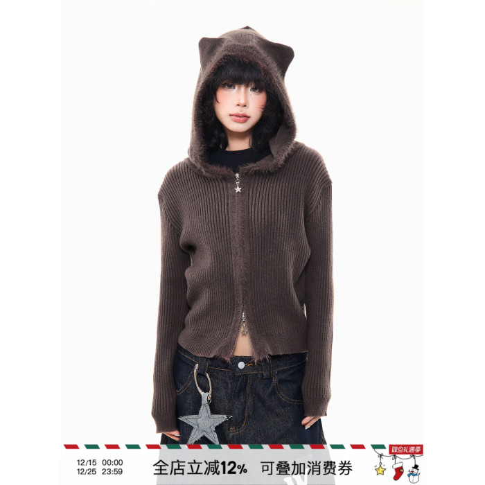 MKGO美式復古毛邊拼接小熊耳朵連帽毛衣外套女秋季修身短款針織衫