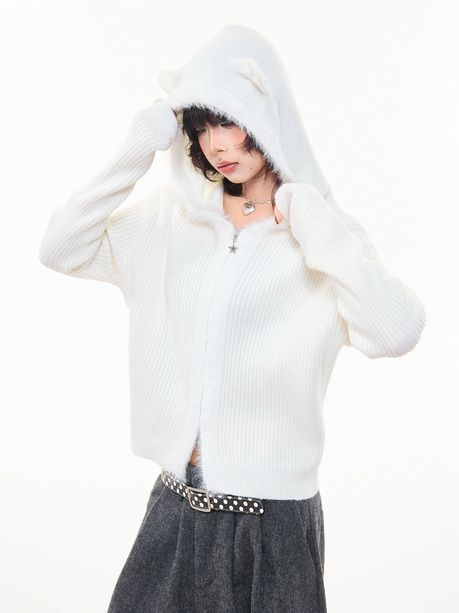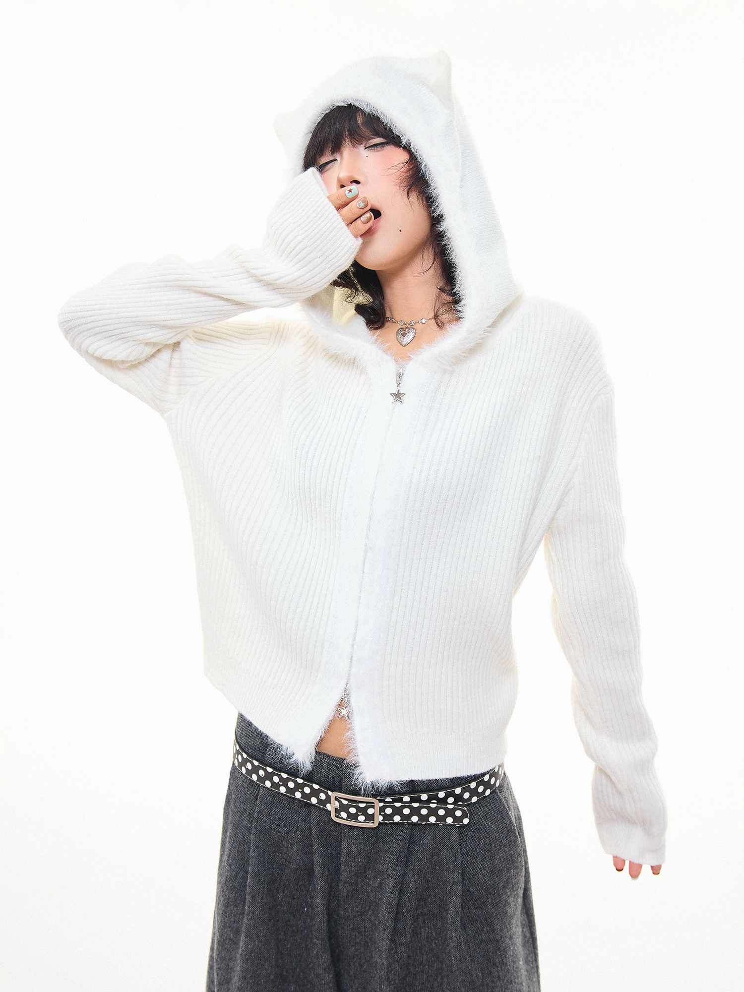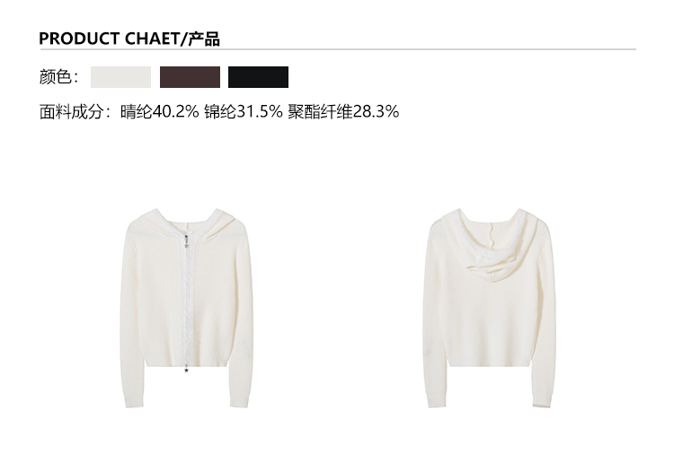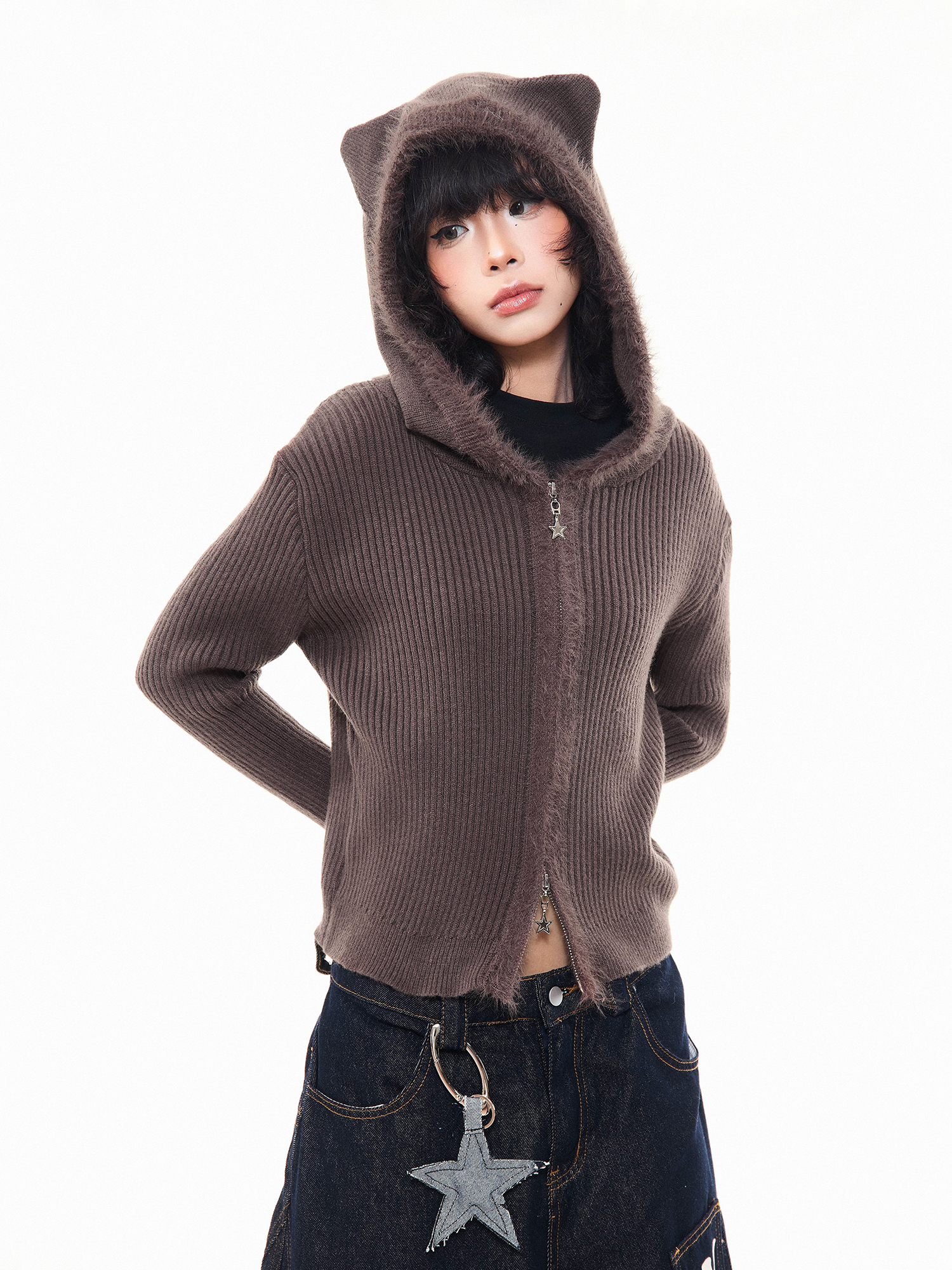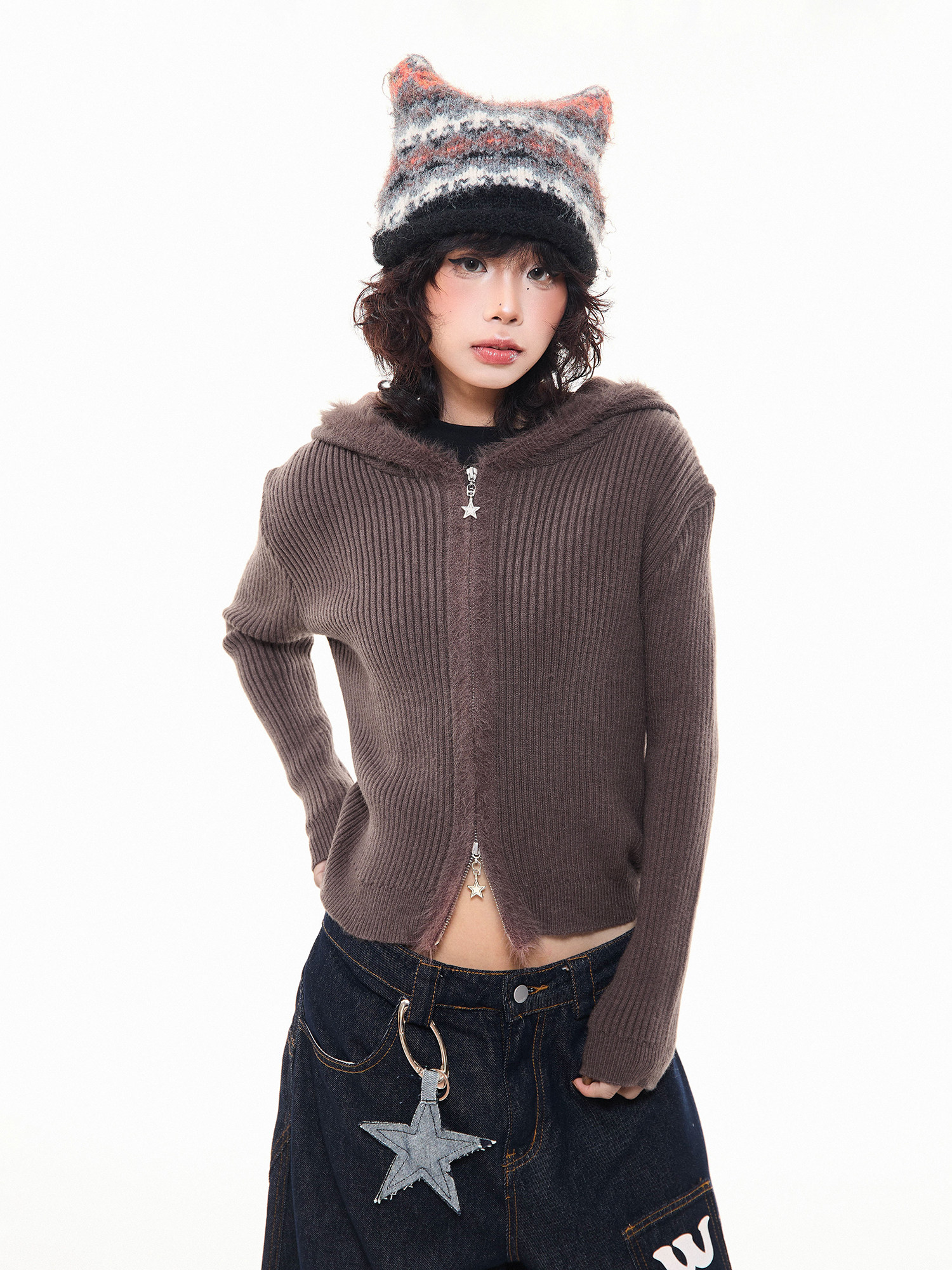 MKGO美式復古毛邊拼接小熊耳朵連帽毛衣外套女秋季修身短款針織衫