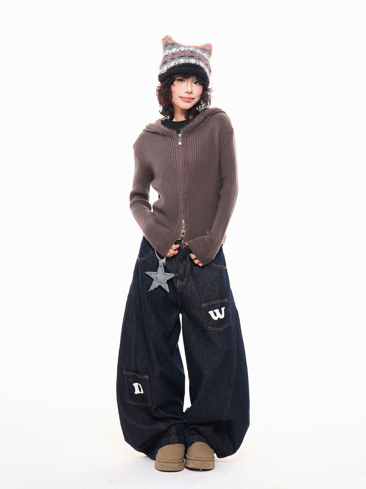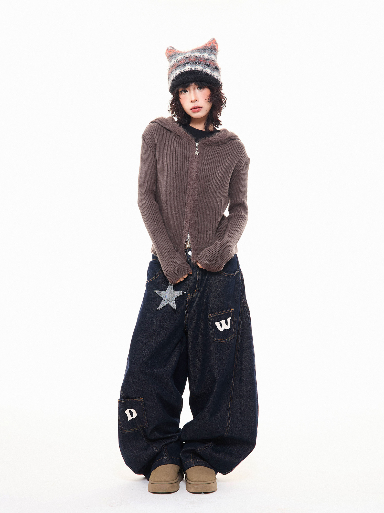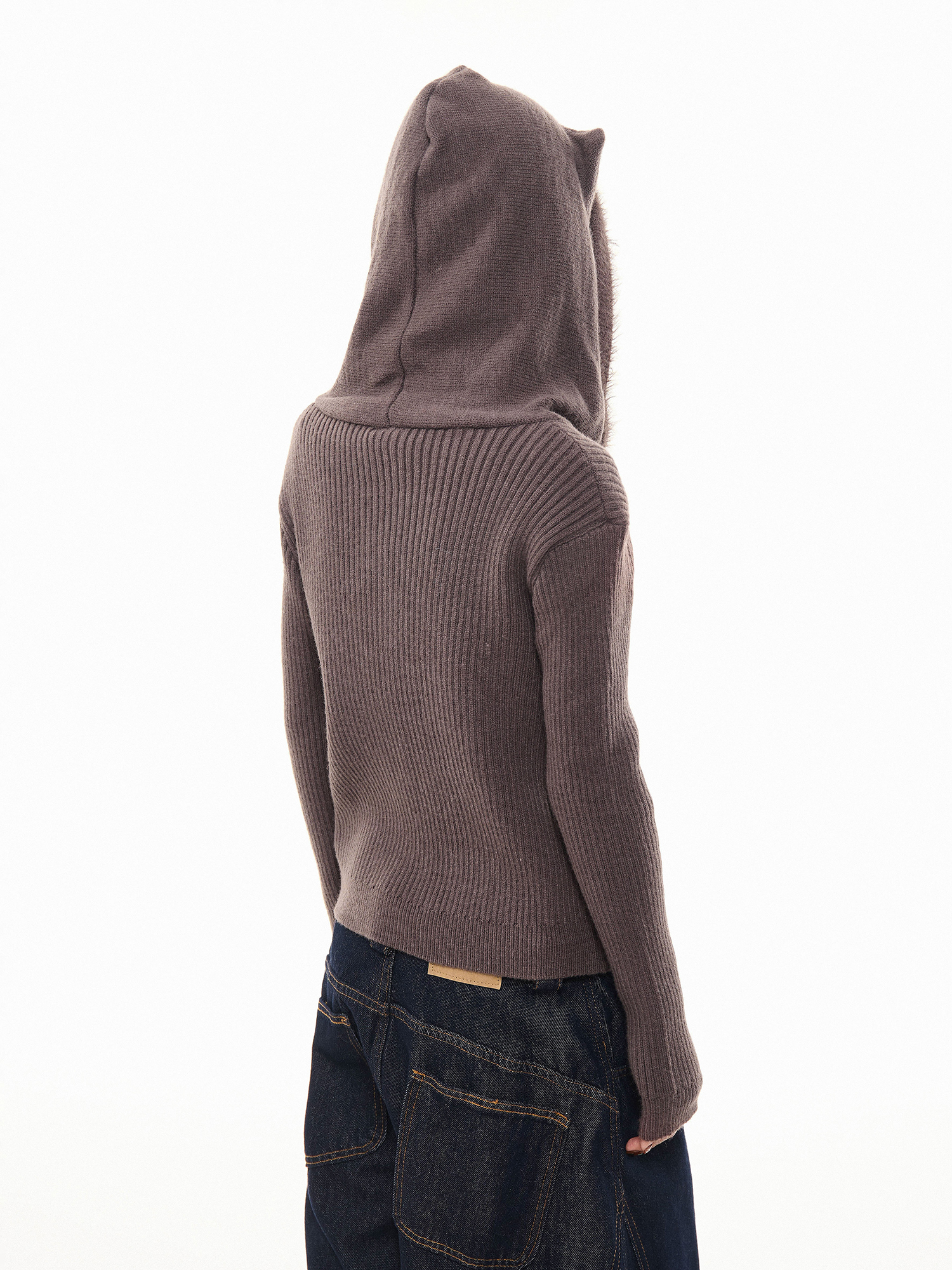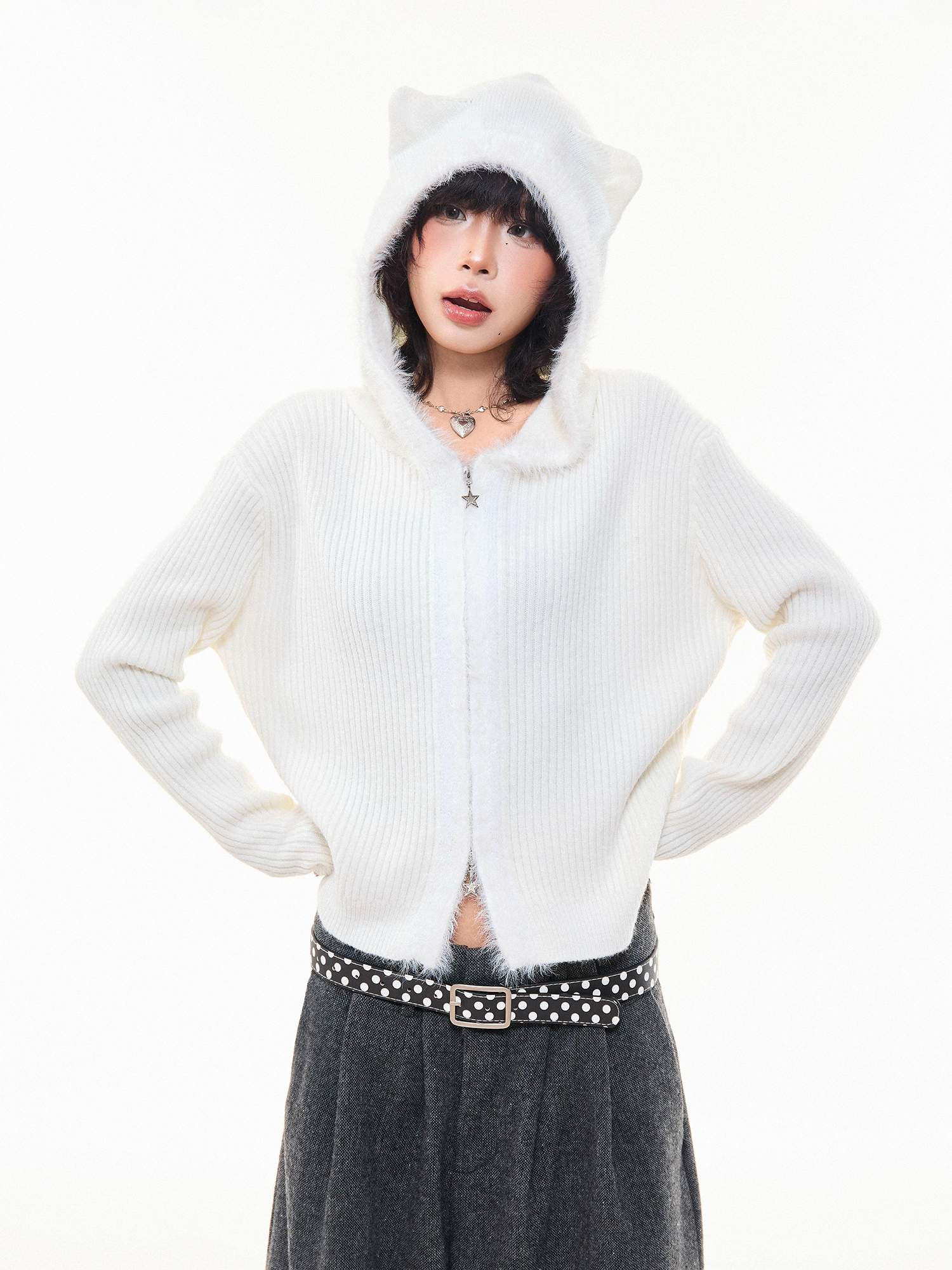 MKGO美式復古毛邊拼接小熊耳朵連帽毛衣外套女秋季修身短款針織衫