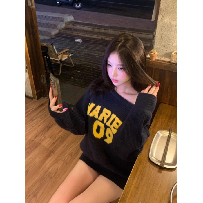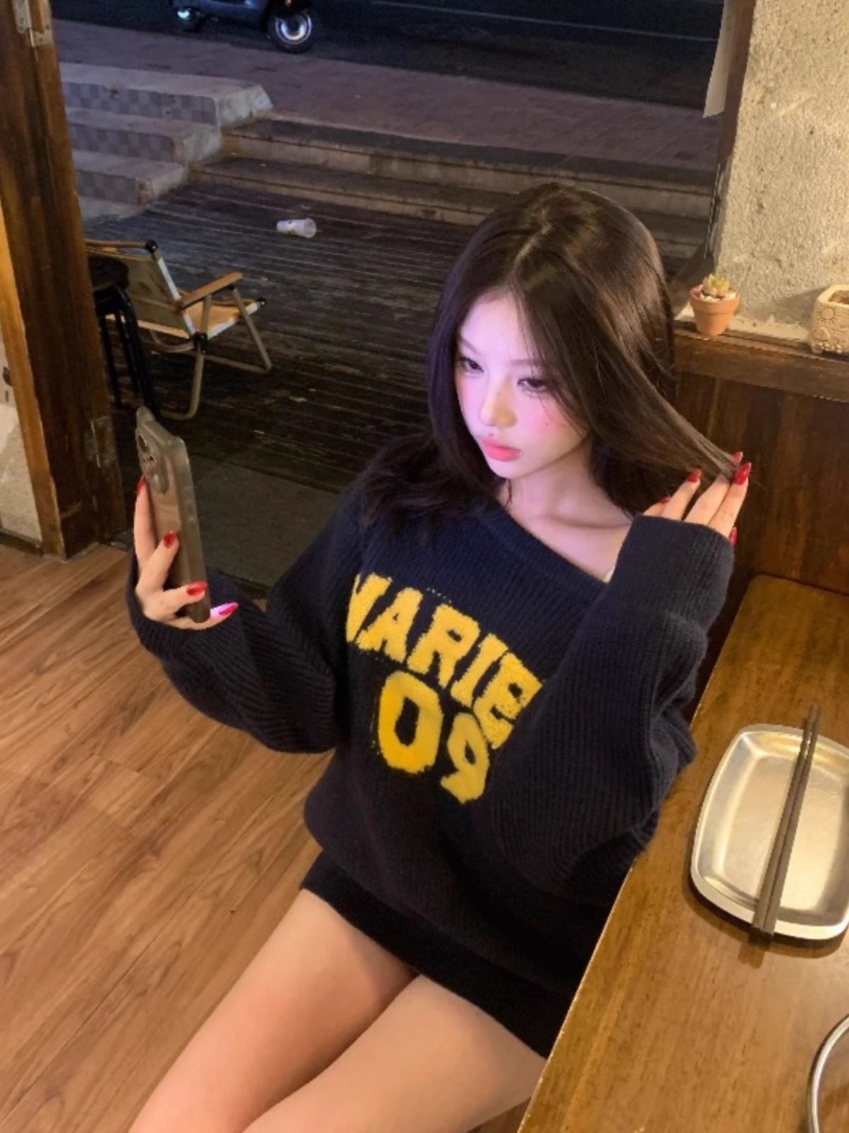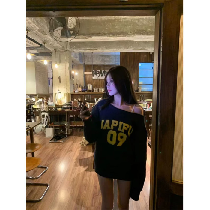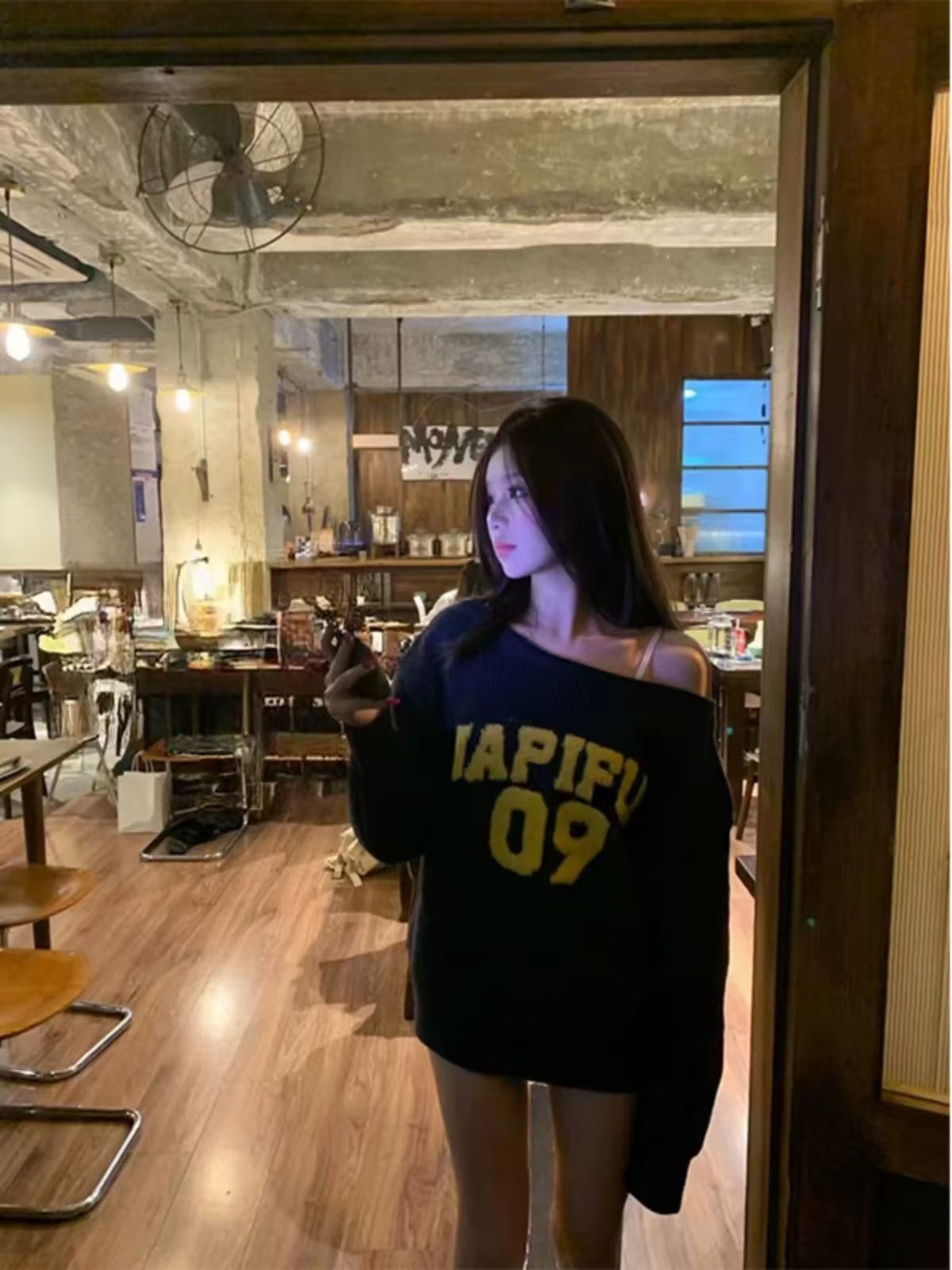 美式藏青色斜肩針織毛衣女秋冬寬松設計感慵懶風提花字母套頭上衣