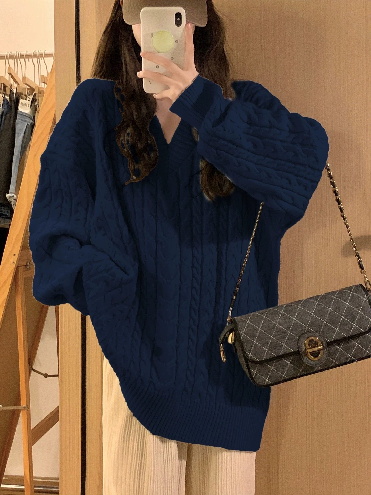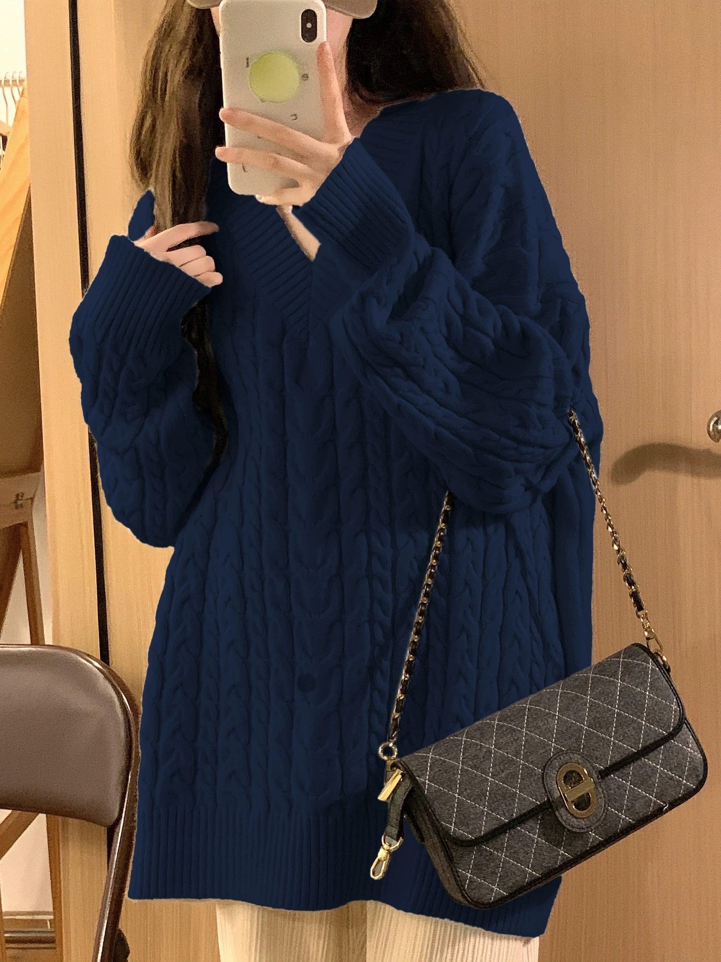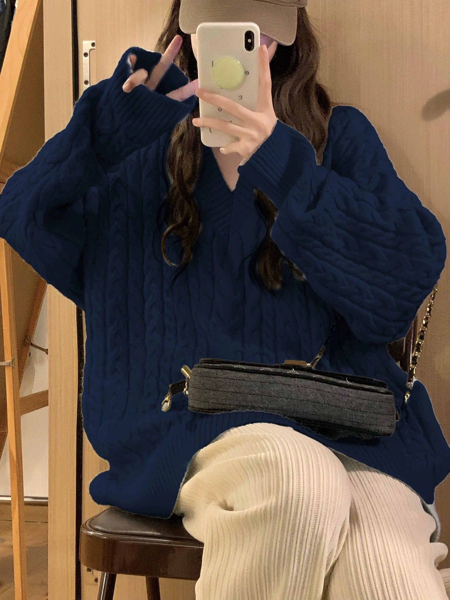 大碼胖MM藏藍色oversize軟糯慵懶V領麻花毛衣女學生加厚針織上衣