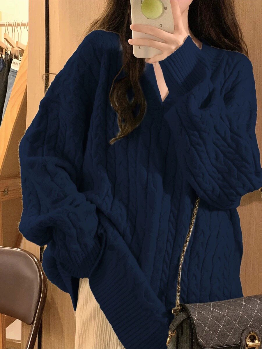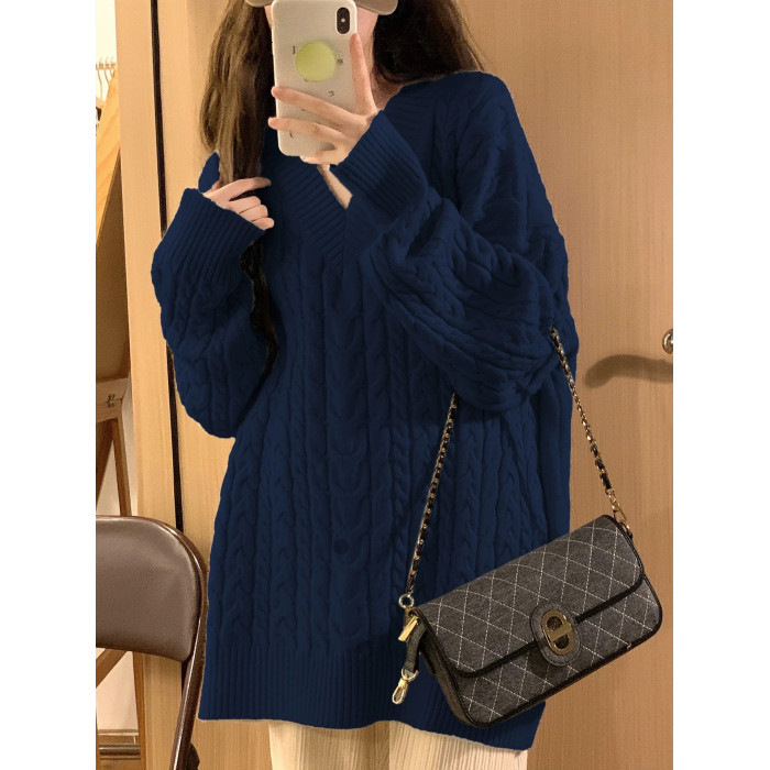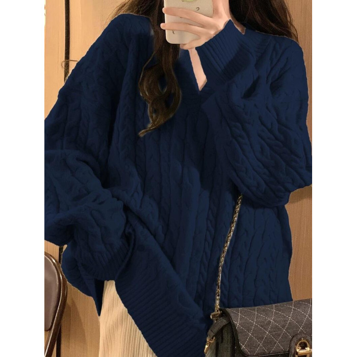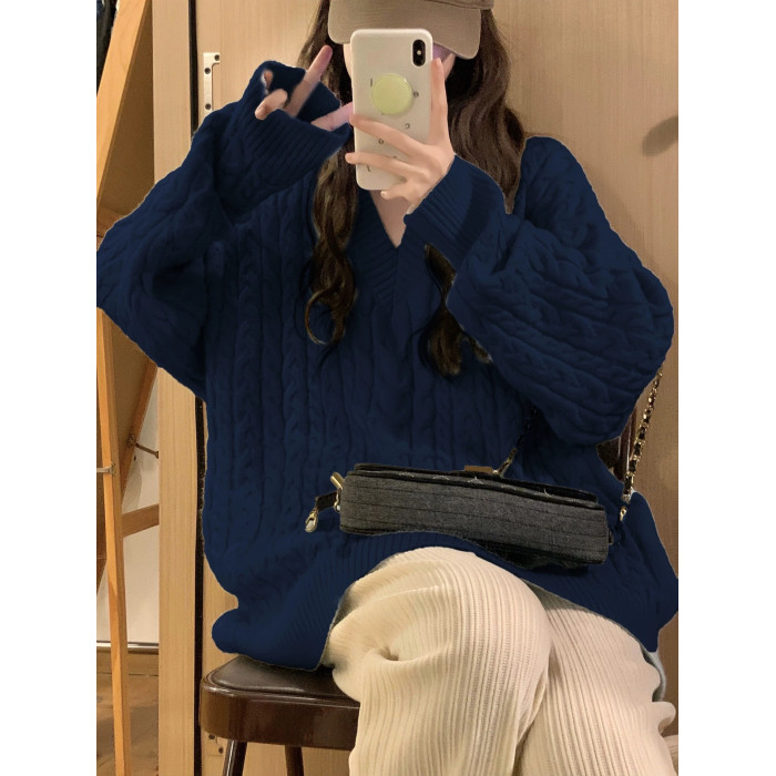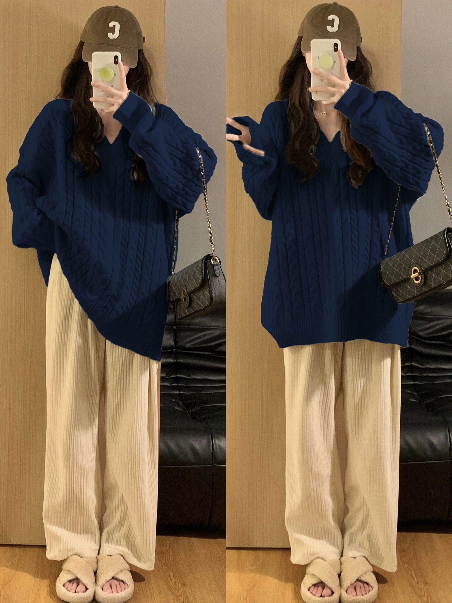 大碼胖MM藏藍色oversize軟糯慵懶V領麻花毛衣女學生加厚針織上衣