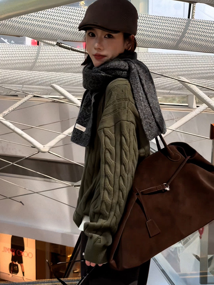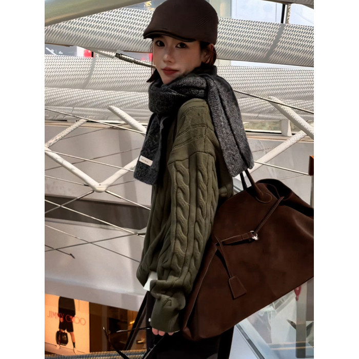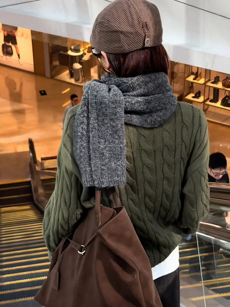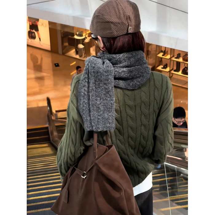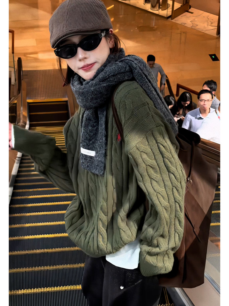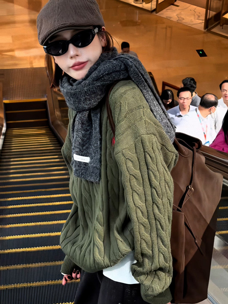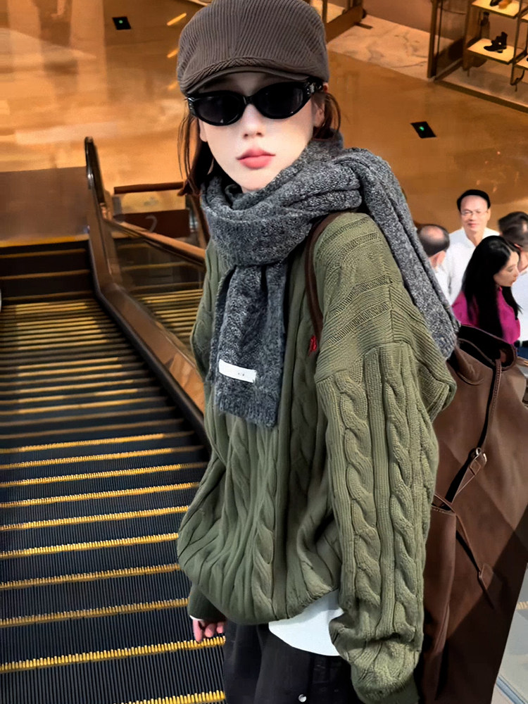 歐貨時髦洋氣減齡綠色麻花針織套頭毛衣女裝春秋美式新款內搭上衣