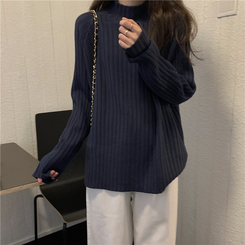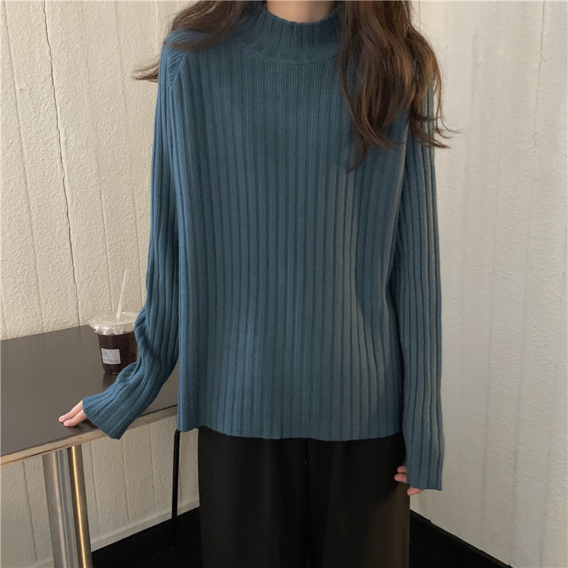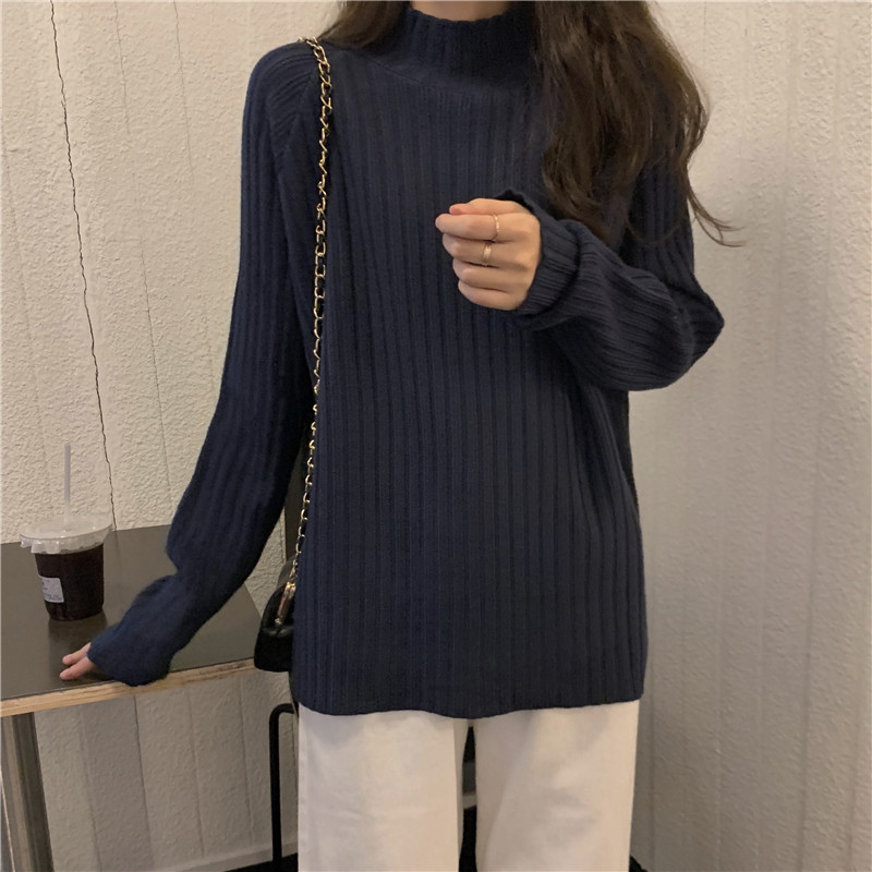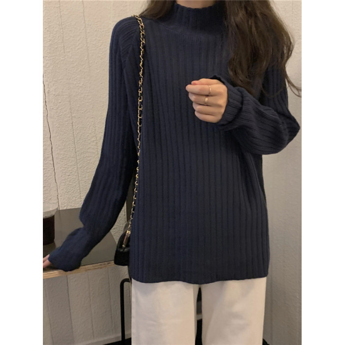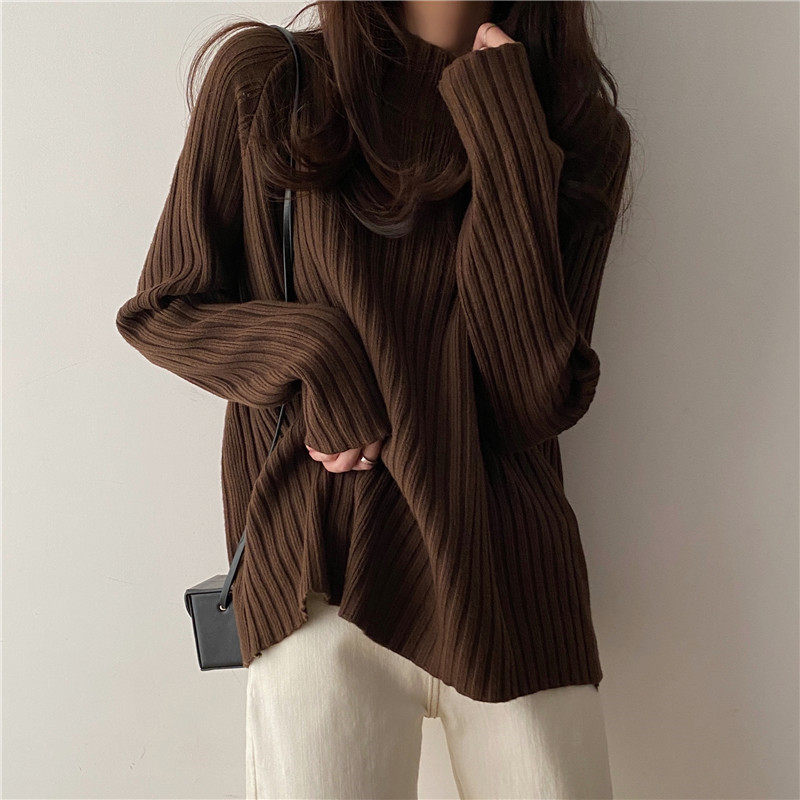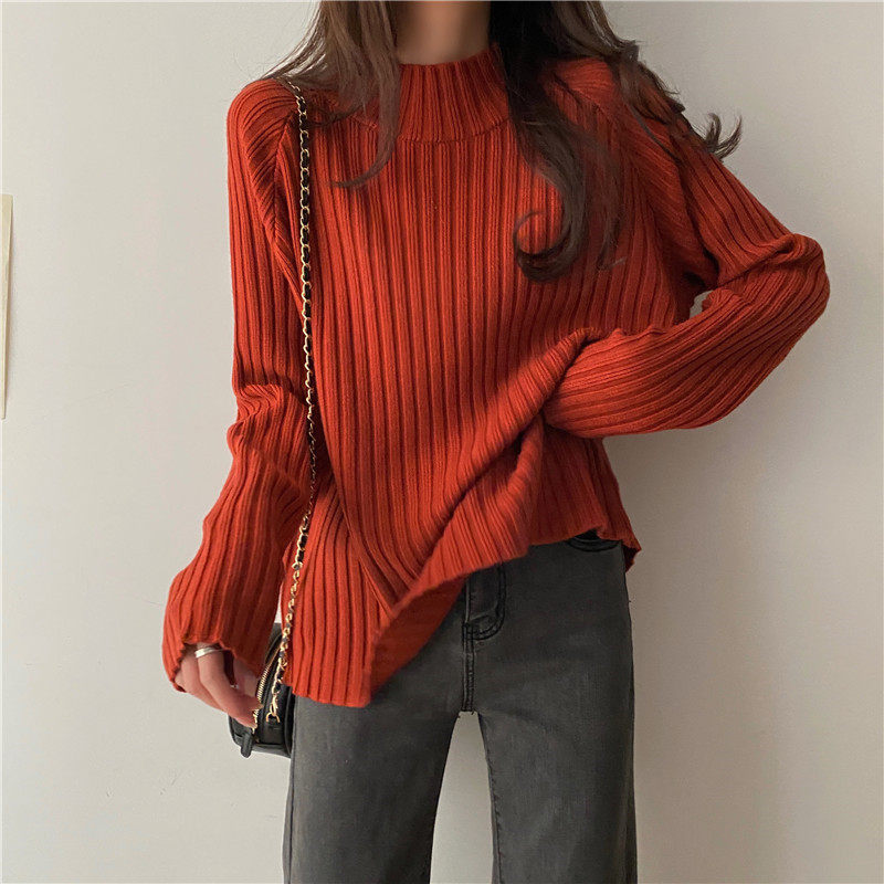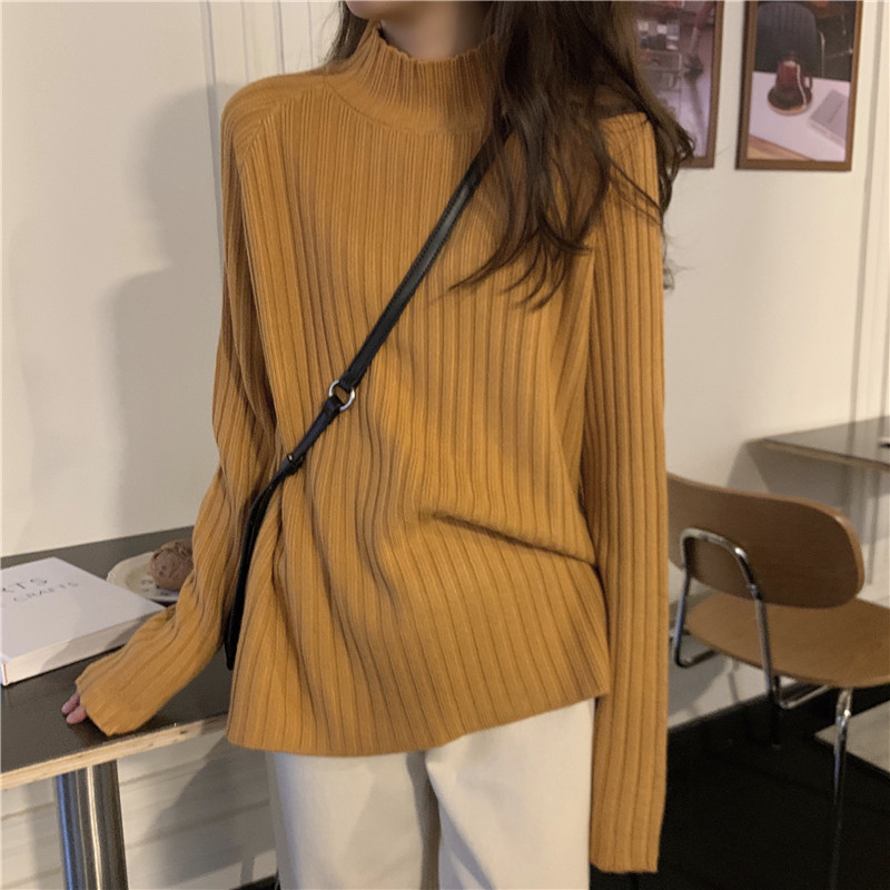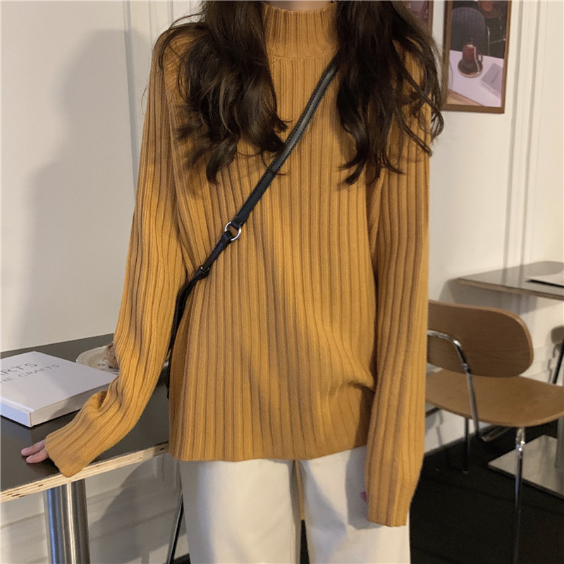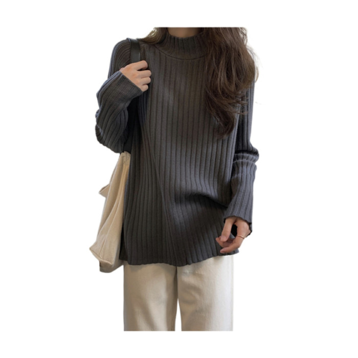 2025秋季純色半高領坑條設計感針織毛衣大碼女裝寬松顯瘦套頭上衣