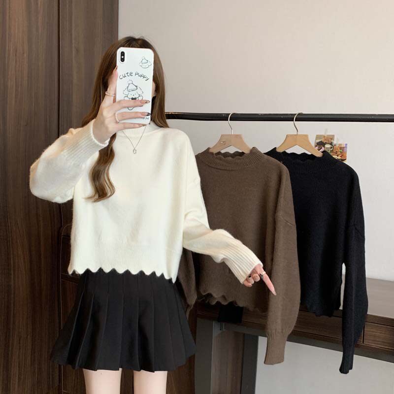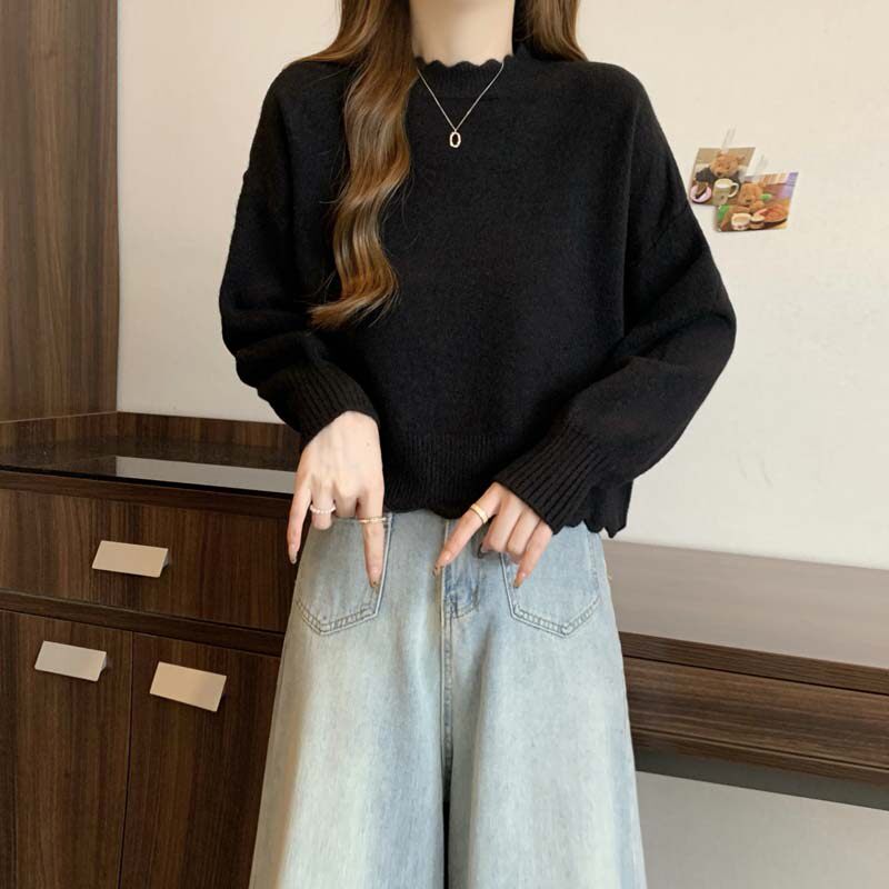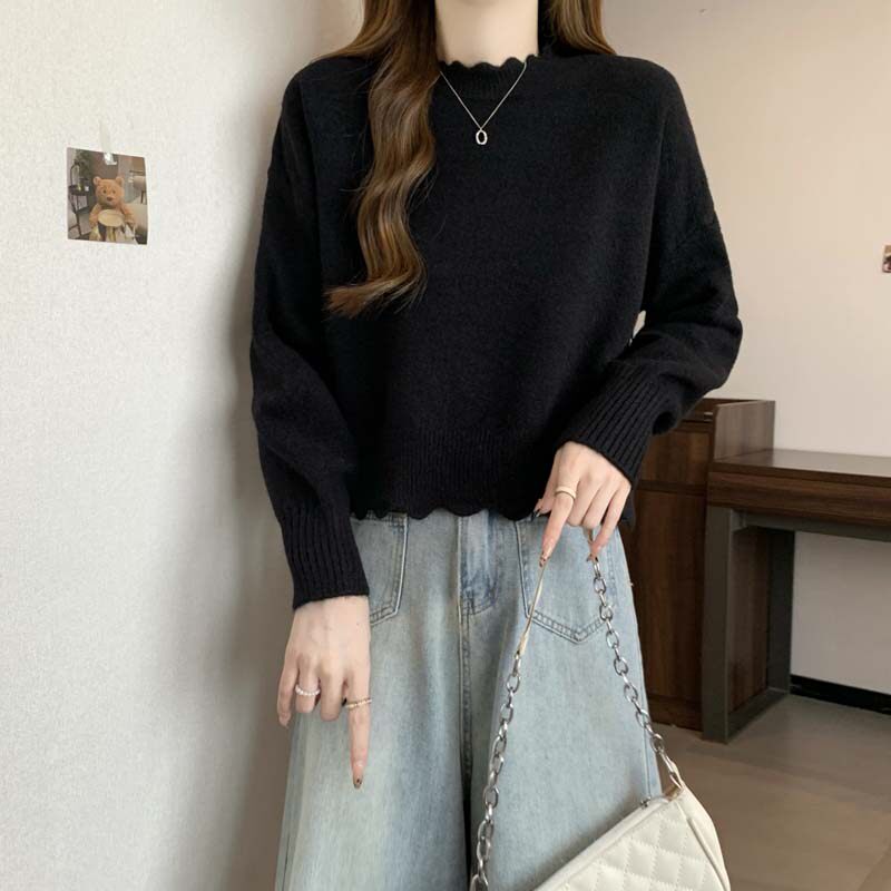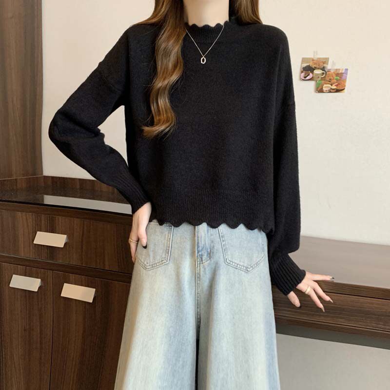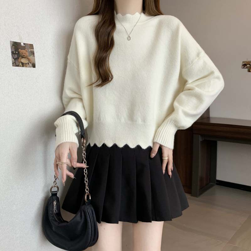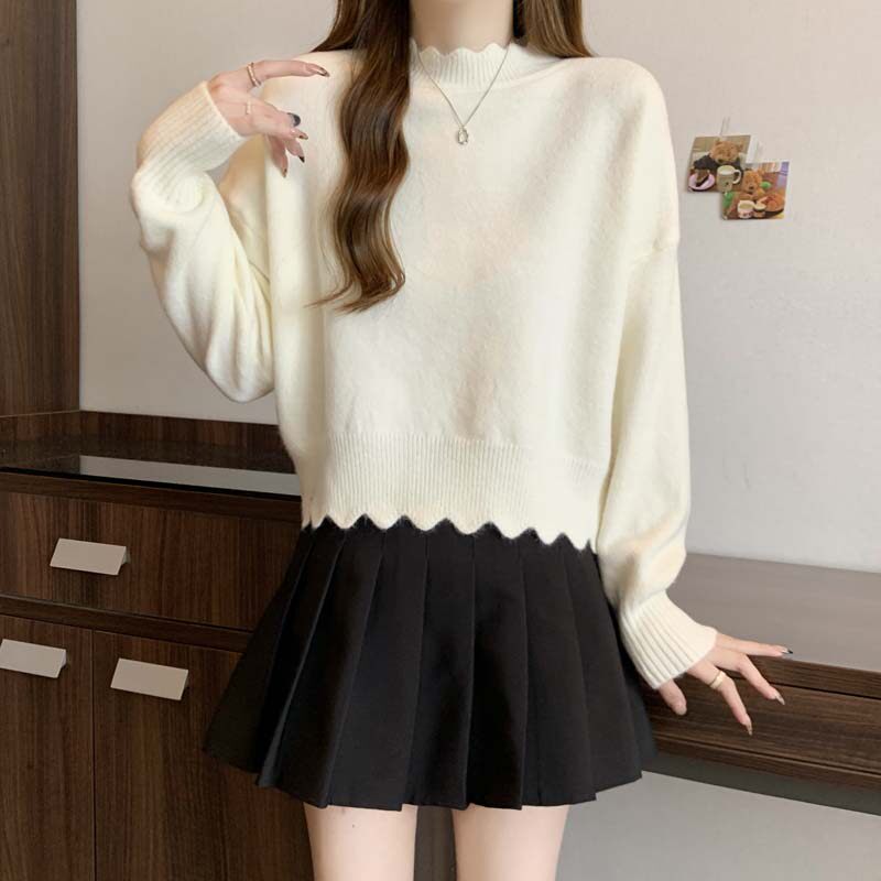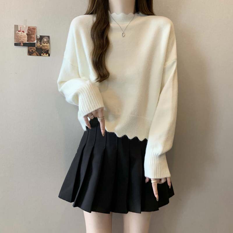 法式不規則半高領毛衣女秋冬胖mm寬松顯瘦短款打底內搭針織衫上衣