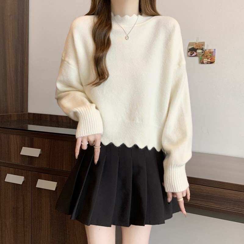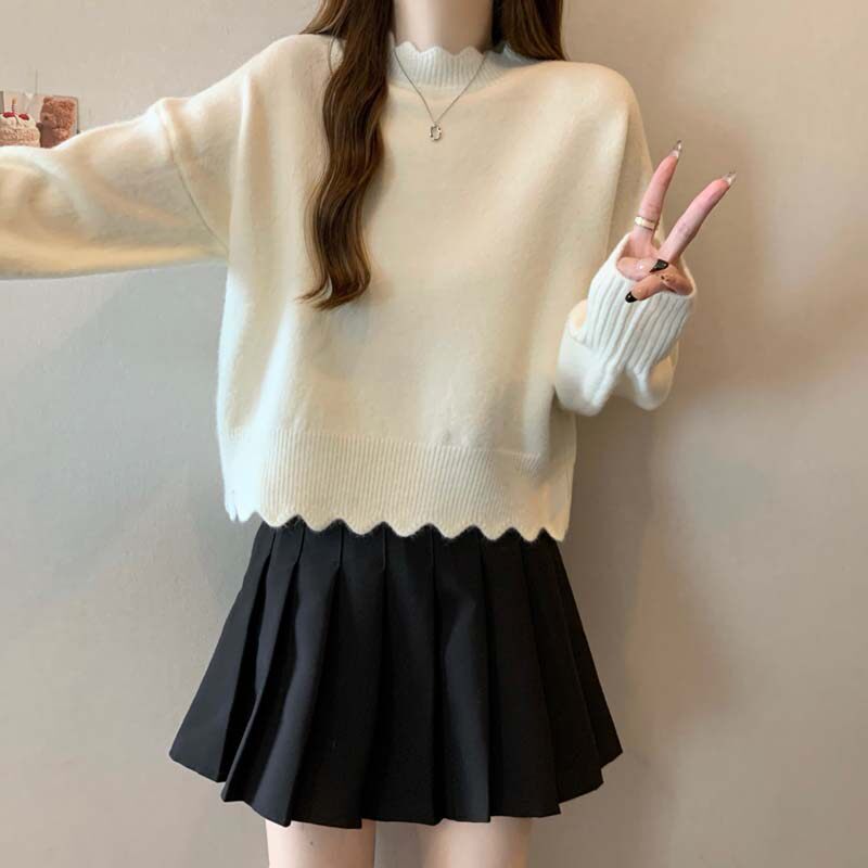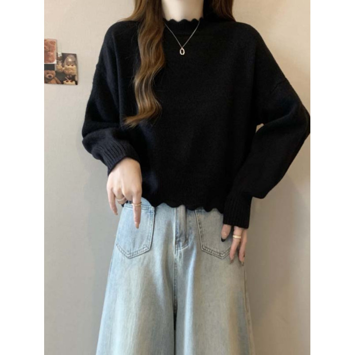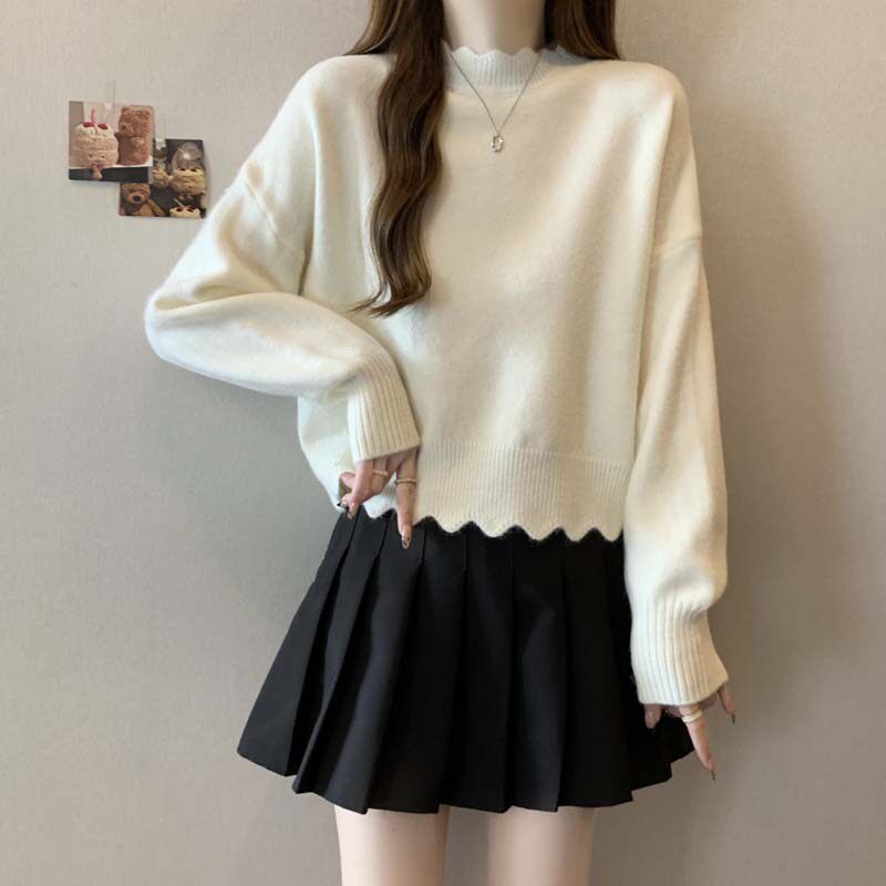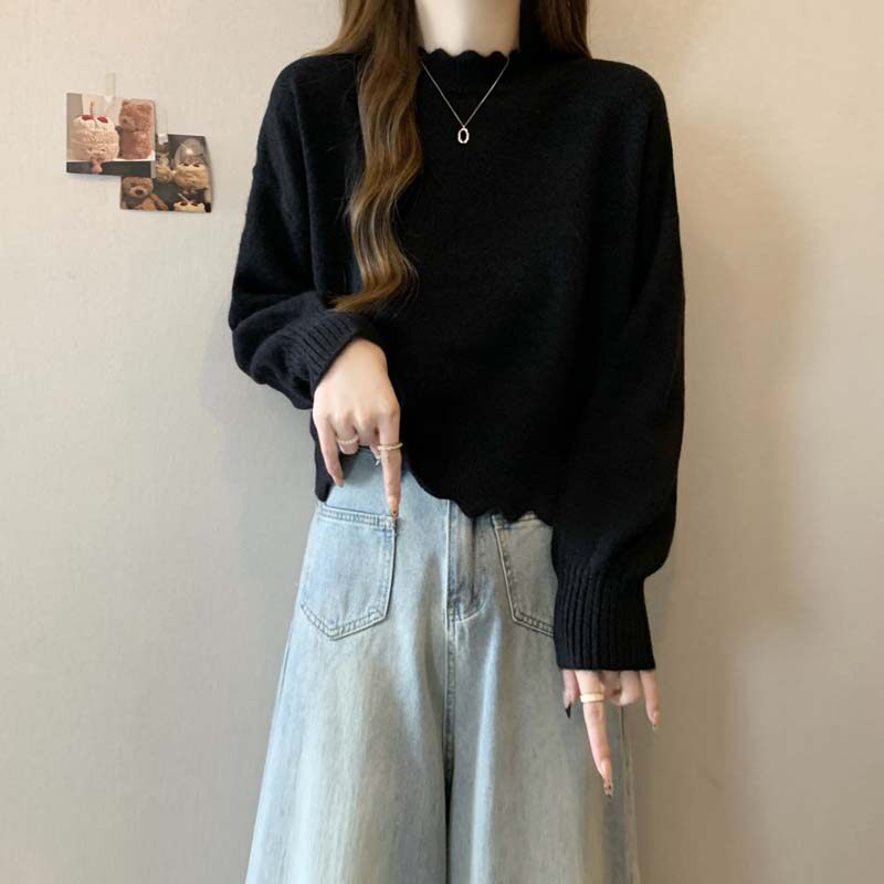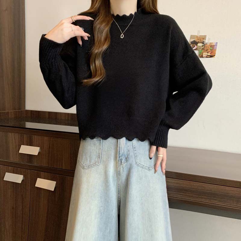 法式不規則半高領毛衣女秋冬胖mm寬松顯瘦短款打底內搭針織衫上衣