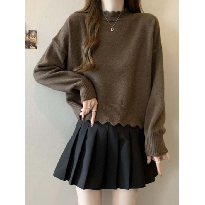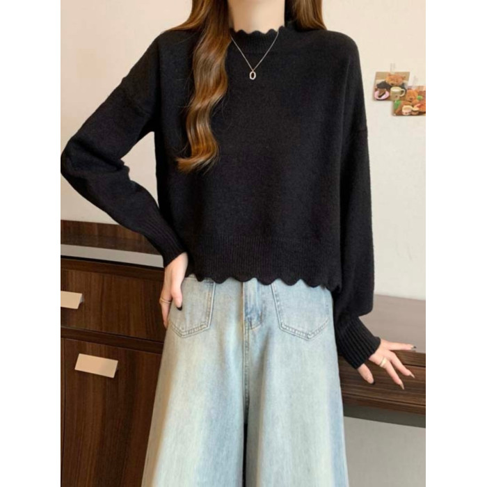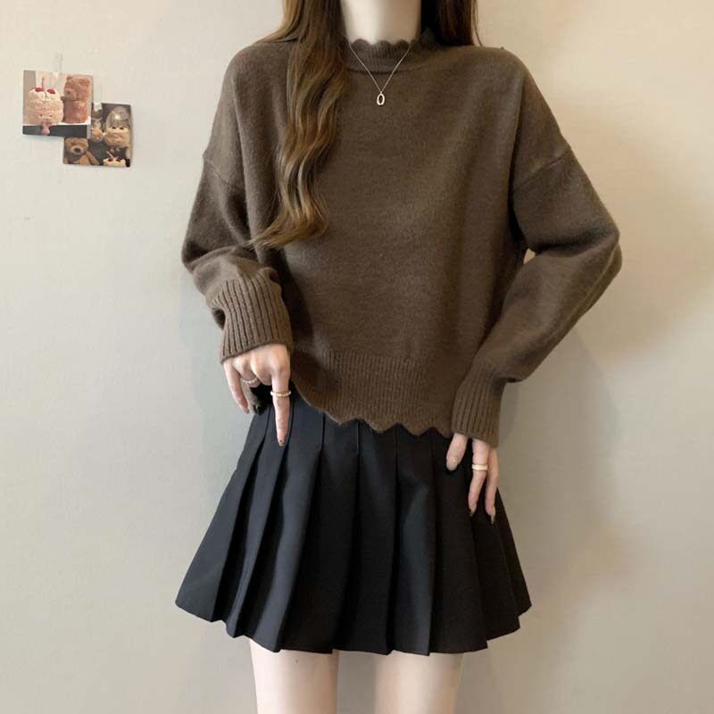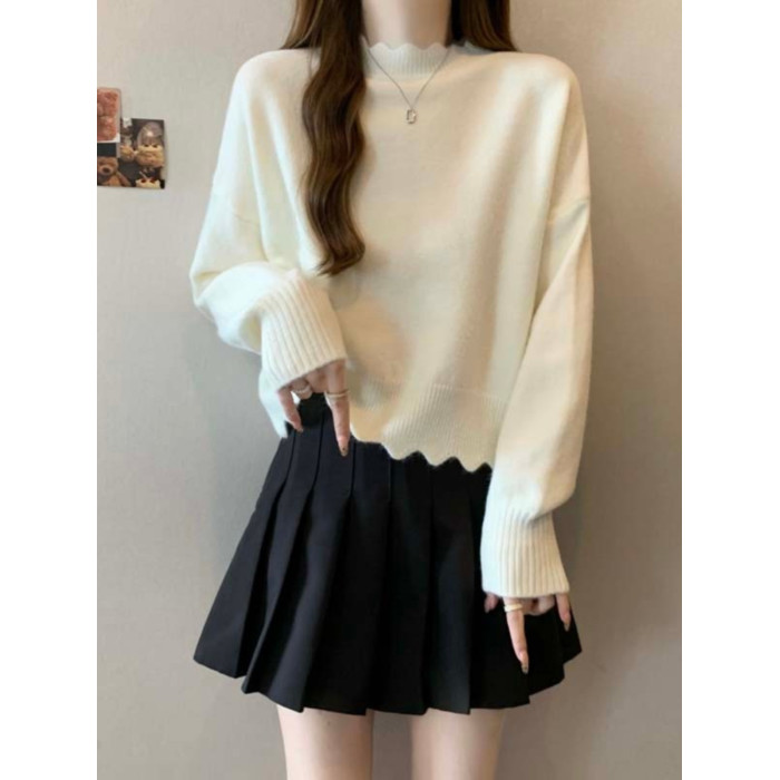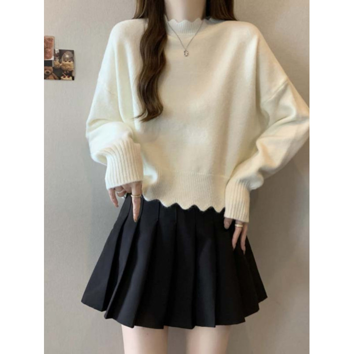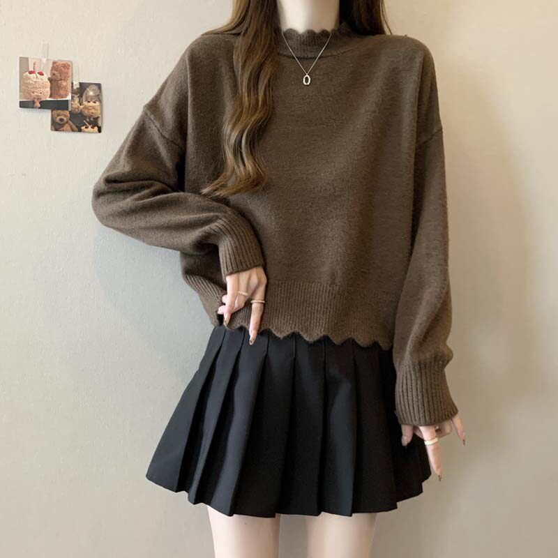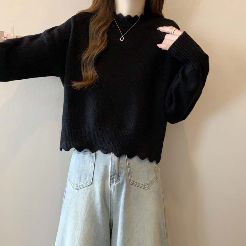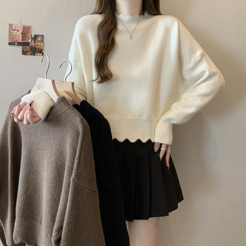 法式不規則半高領毛衣女秋冬胖mm寬松顯瘦短款打底內搭針織衫上衣