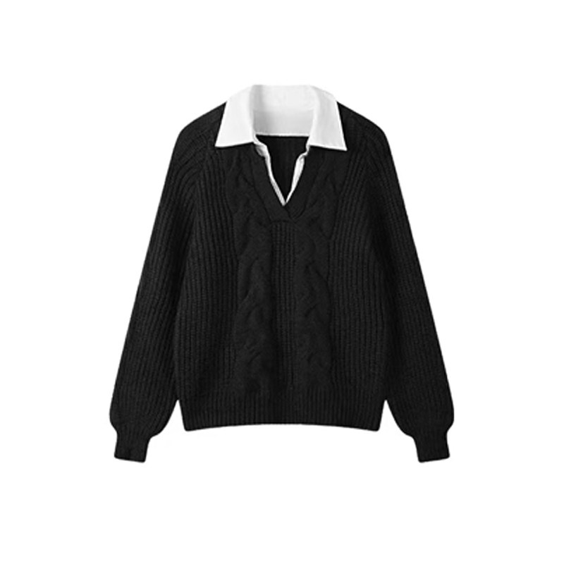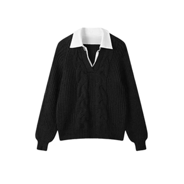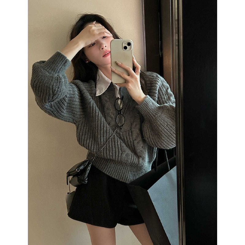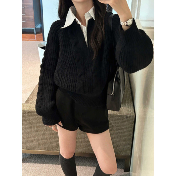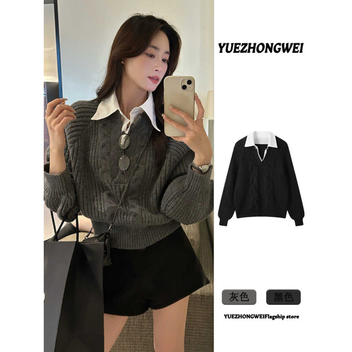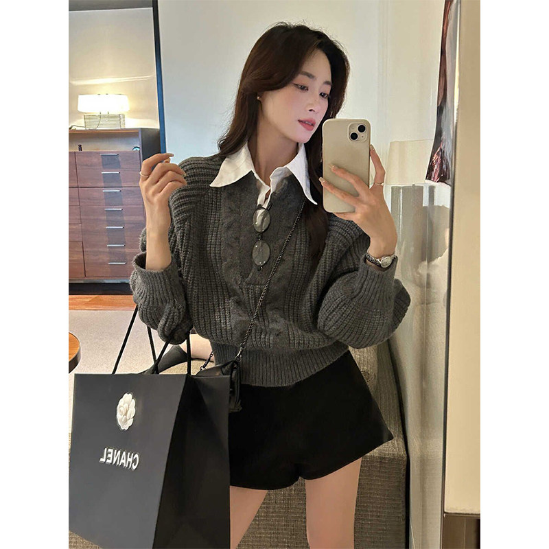 假兩件襯衫拼接翻領灰色套頭毛衣女秋冬加厚寬松慵懶風針織衫上衣