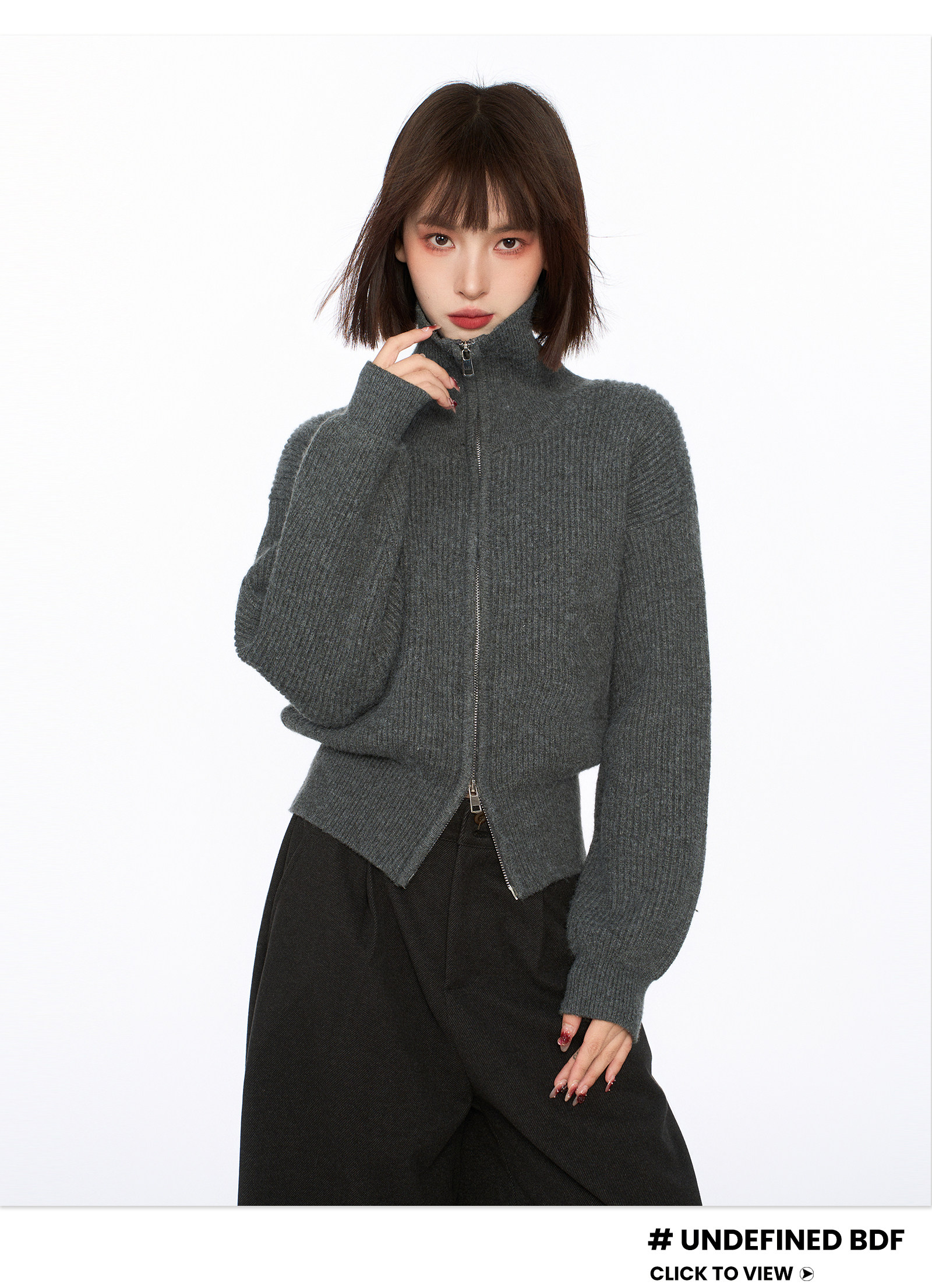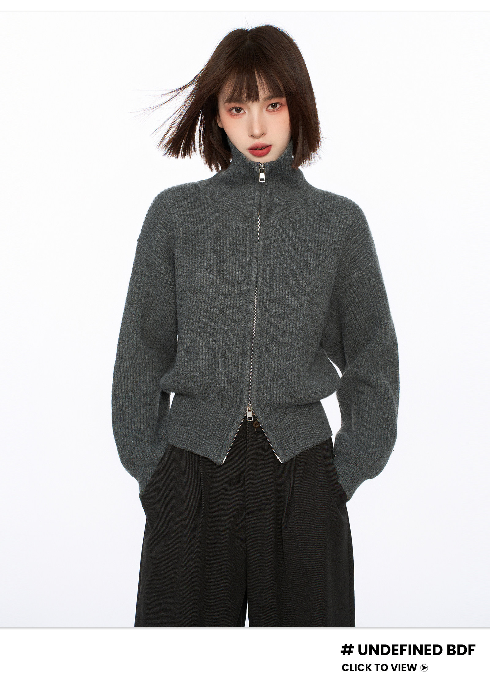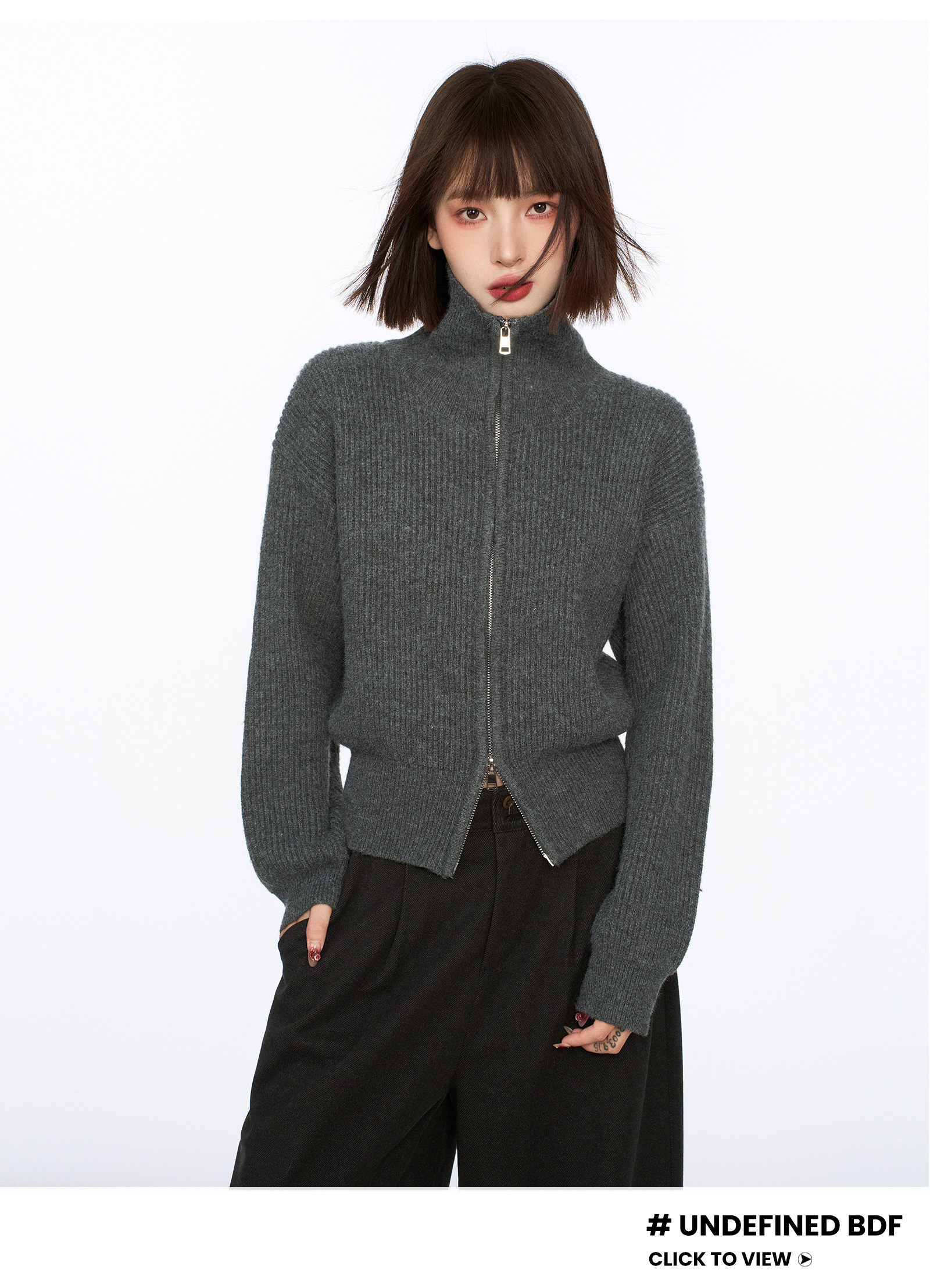灰色立領雙拉鍊針織毛衣外套女秋冬季小個子加厚高領慵懶開衫上衣