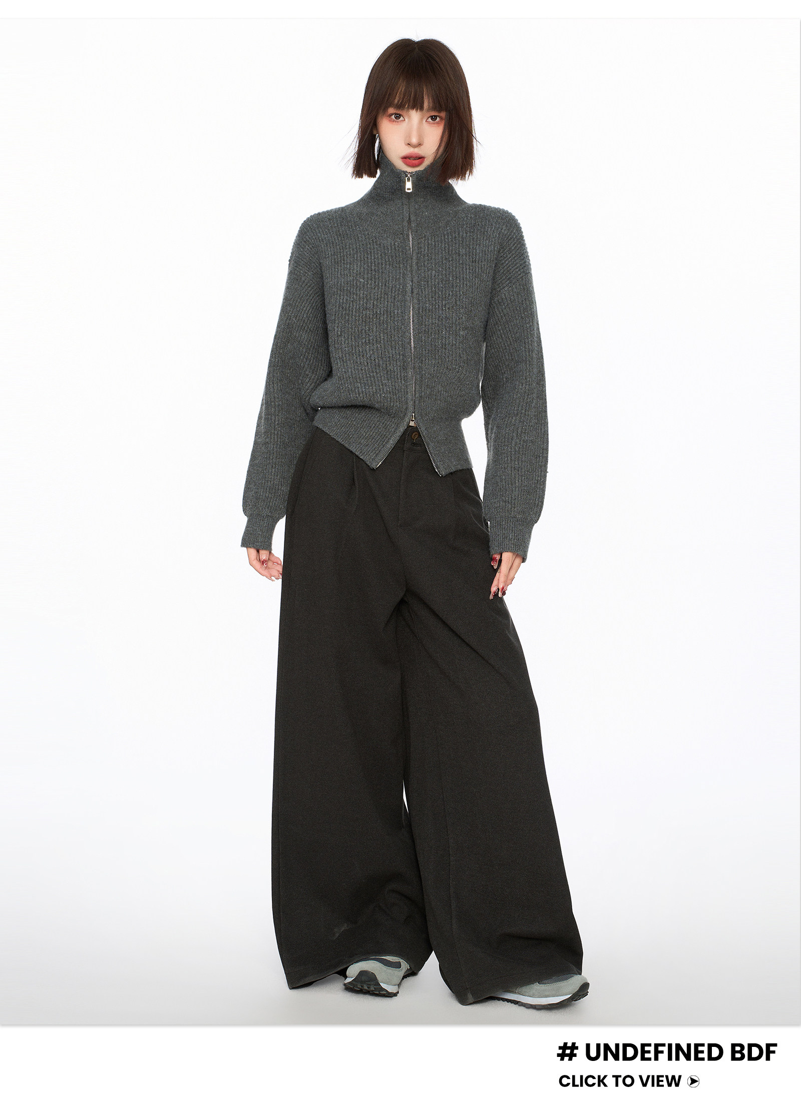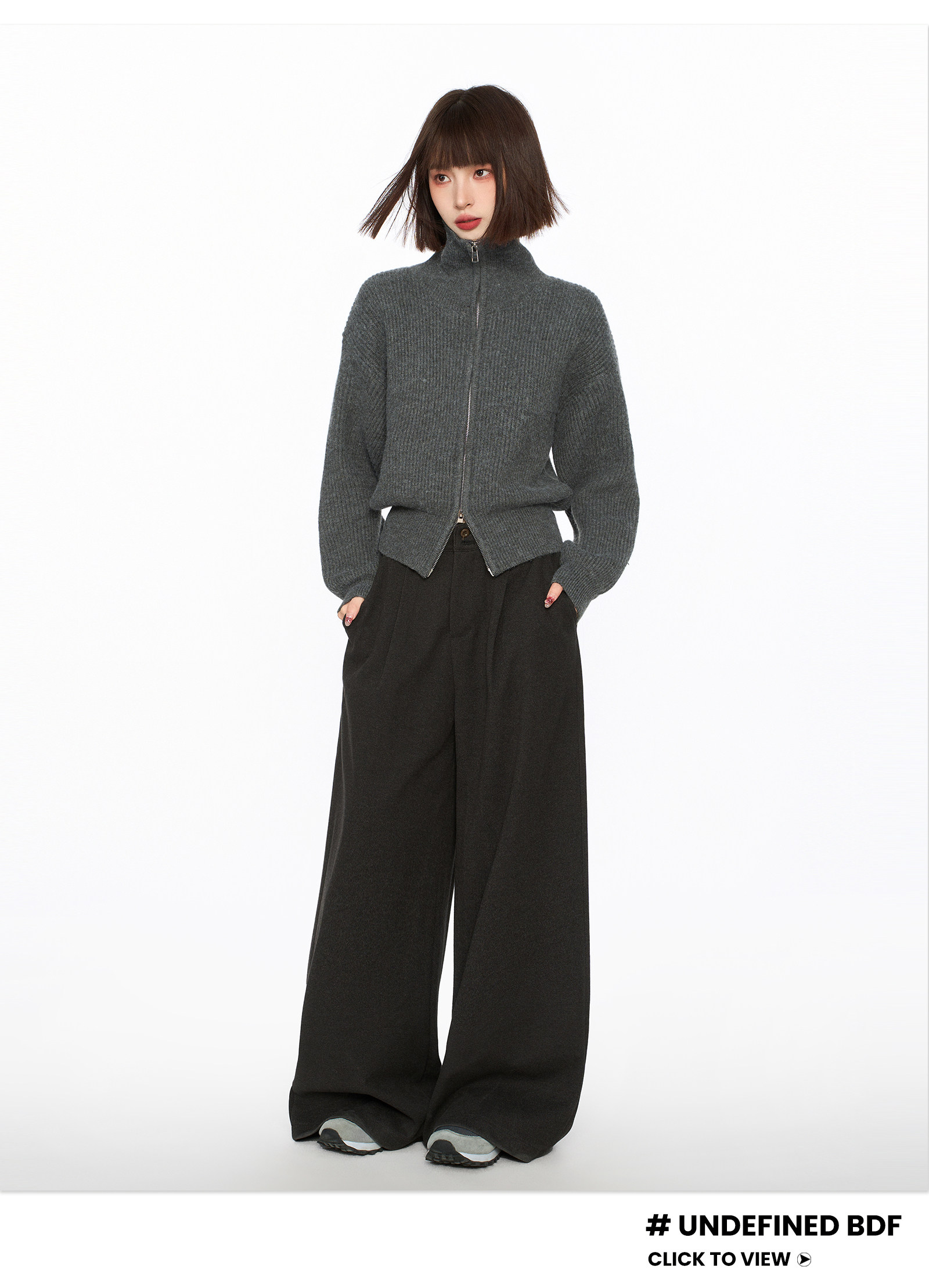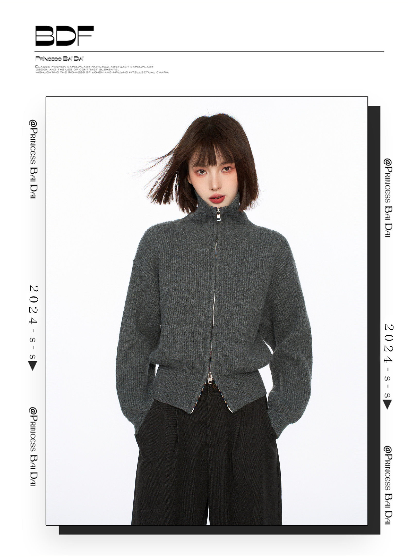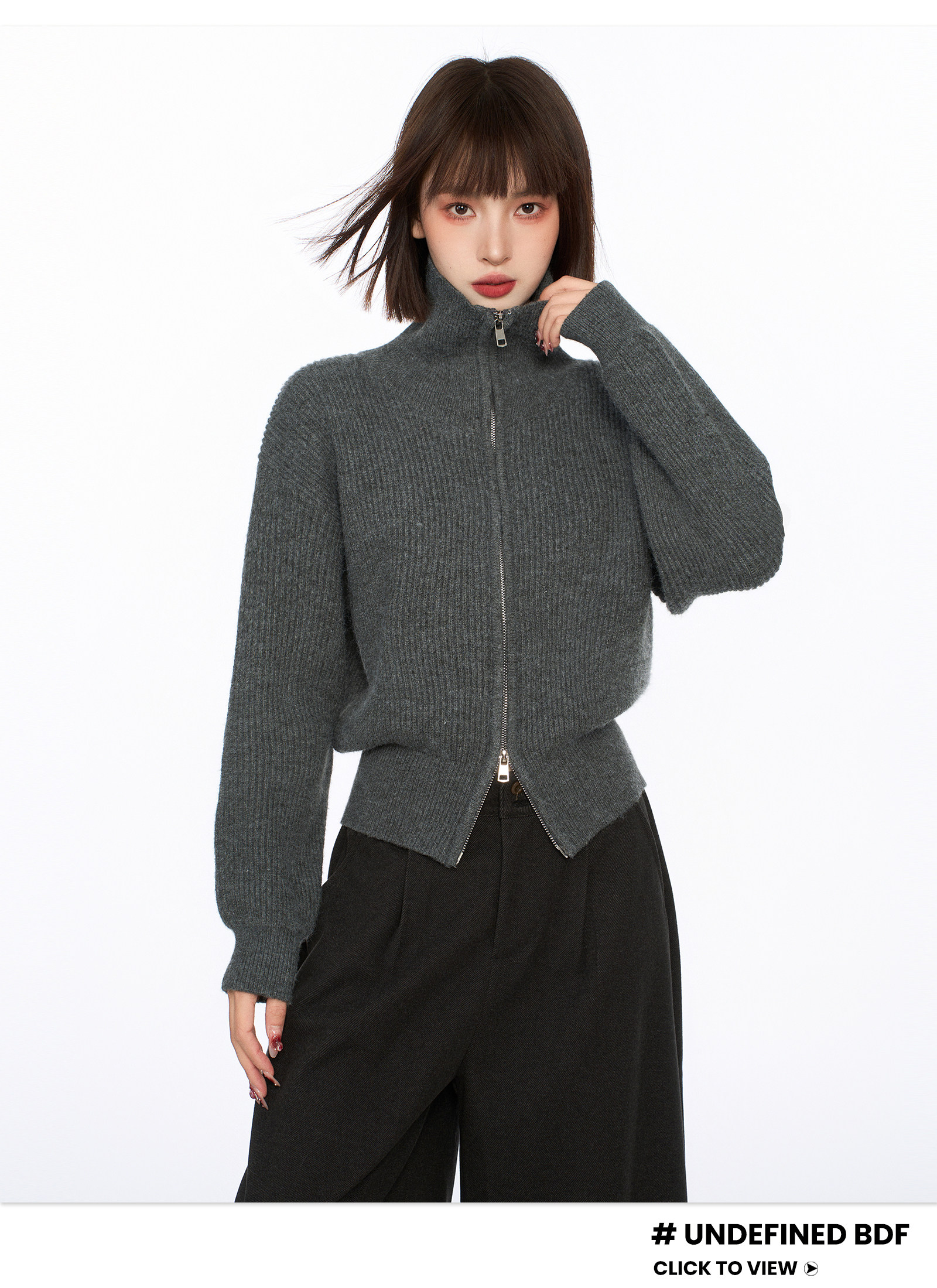灰色立領雙拉鍊針織毛衣外套女秋冬季小個子加厚高領慵懶開衫上衣