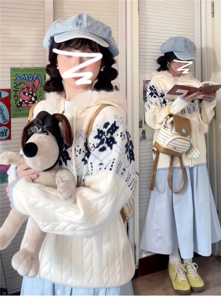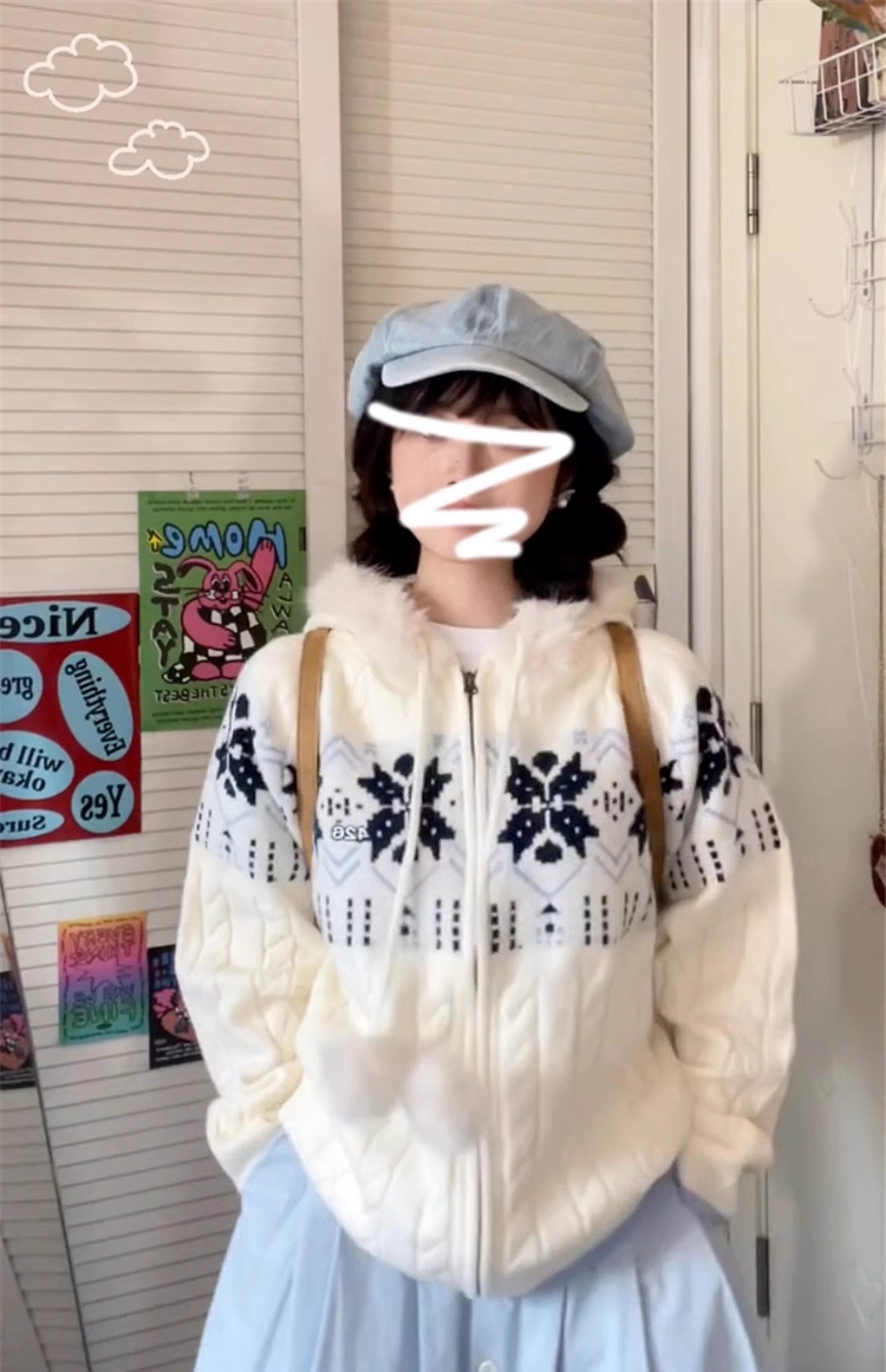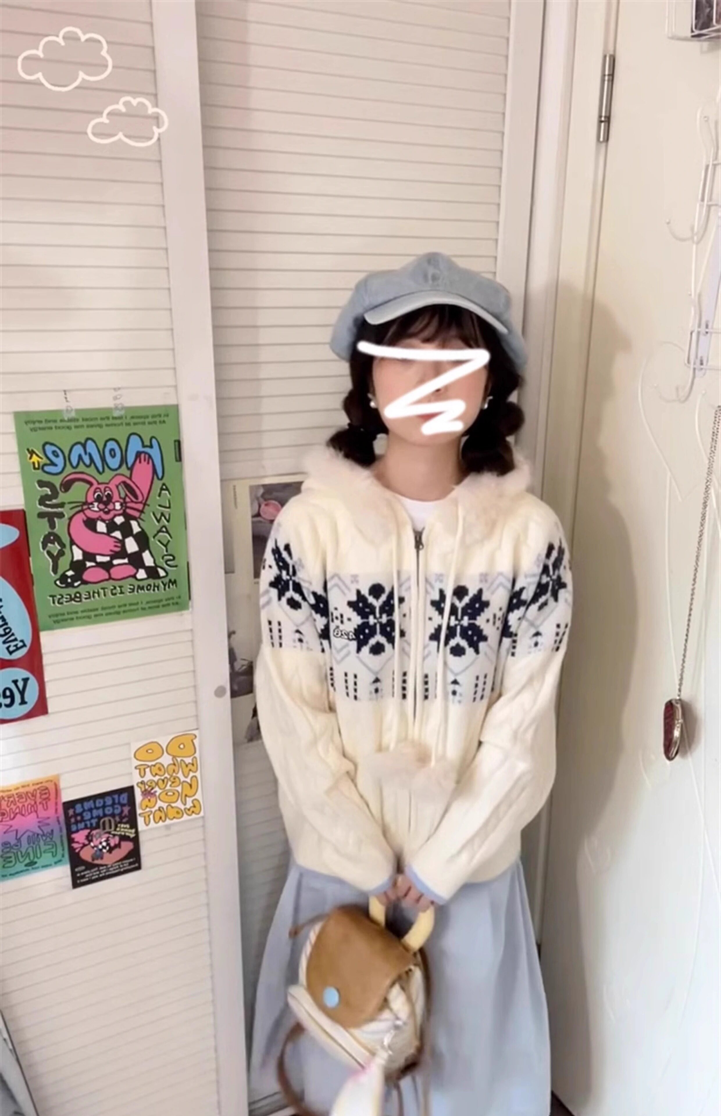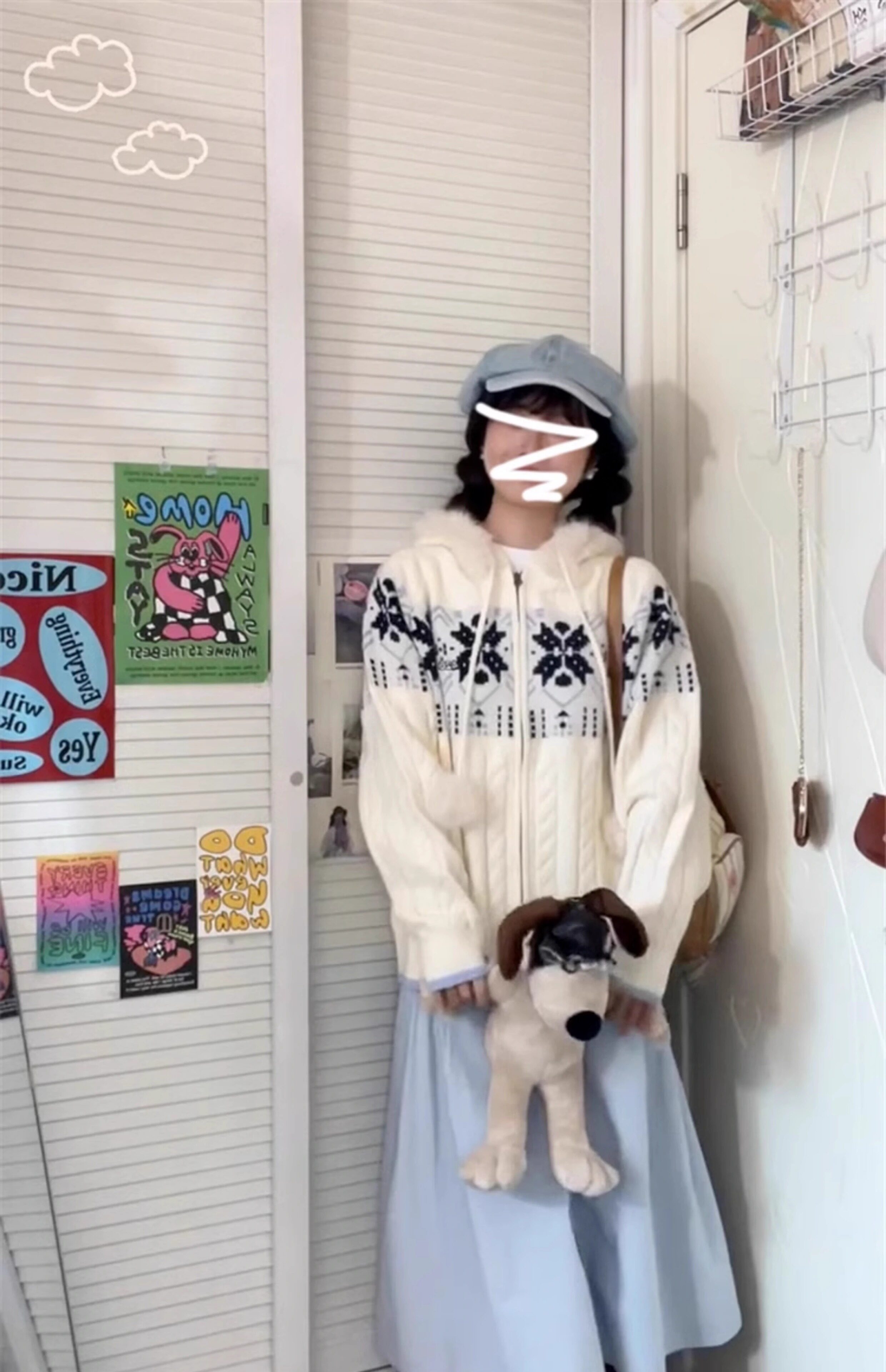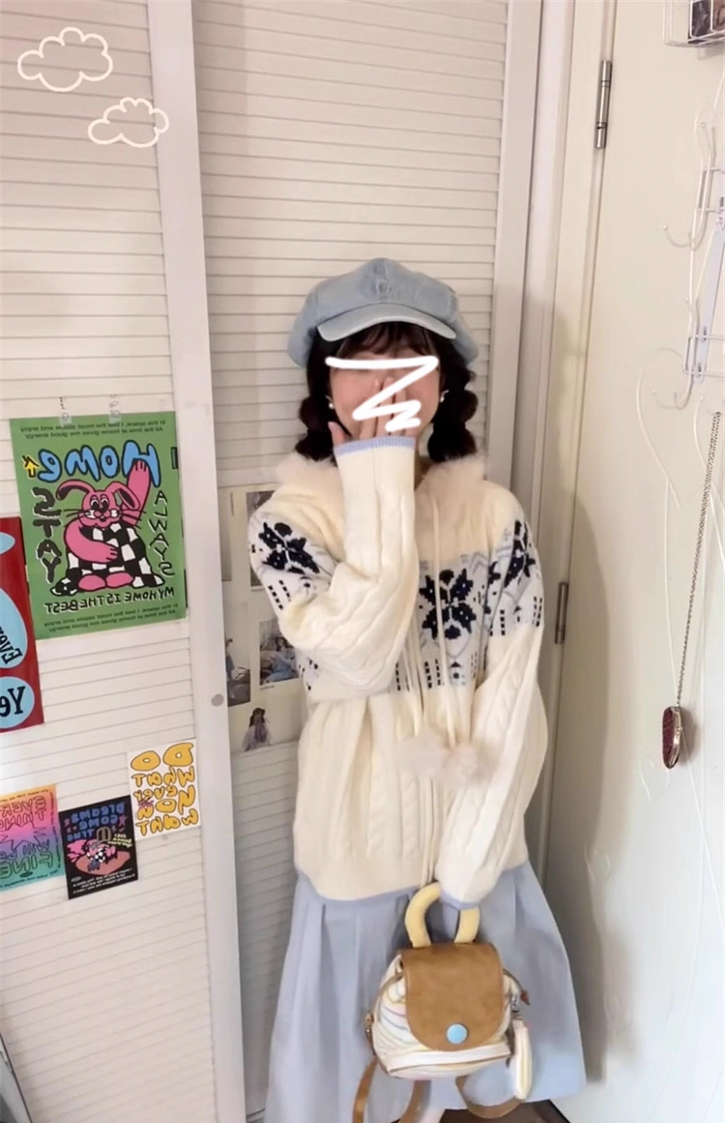 慵懶風藍白色費爾島連帽毛衣外套女秋冬季2025年新款寬松針織開衫