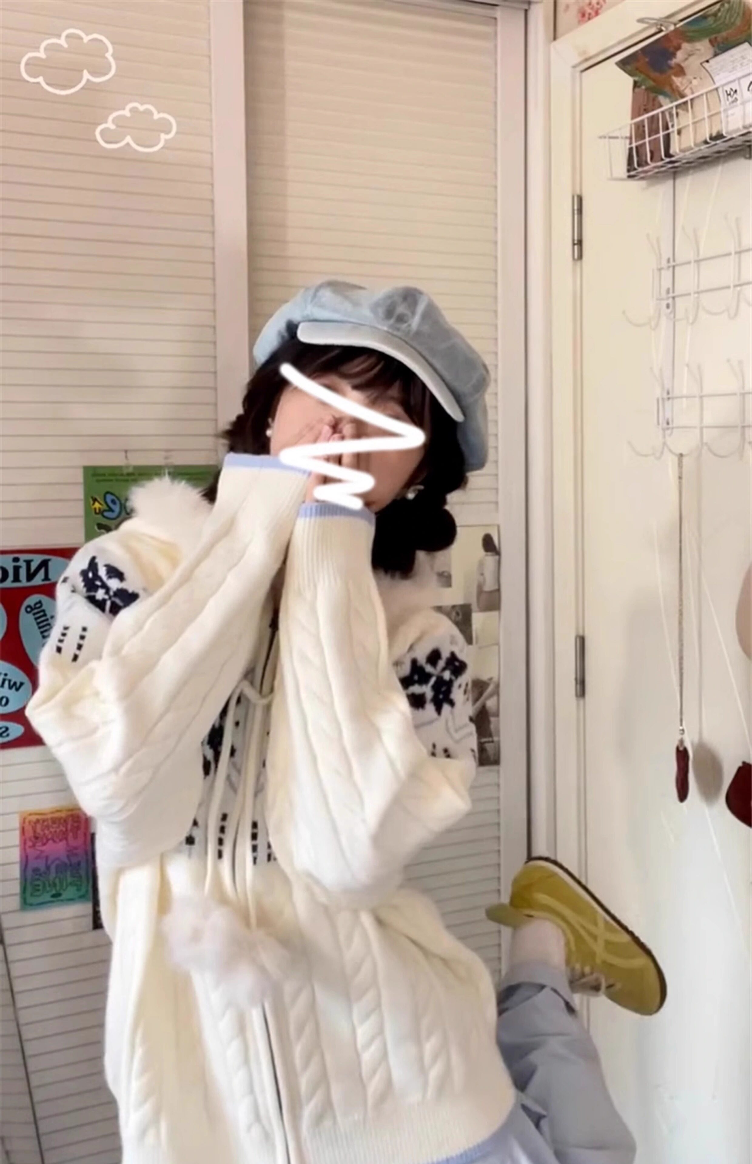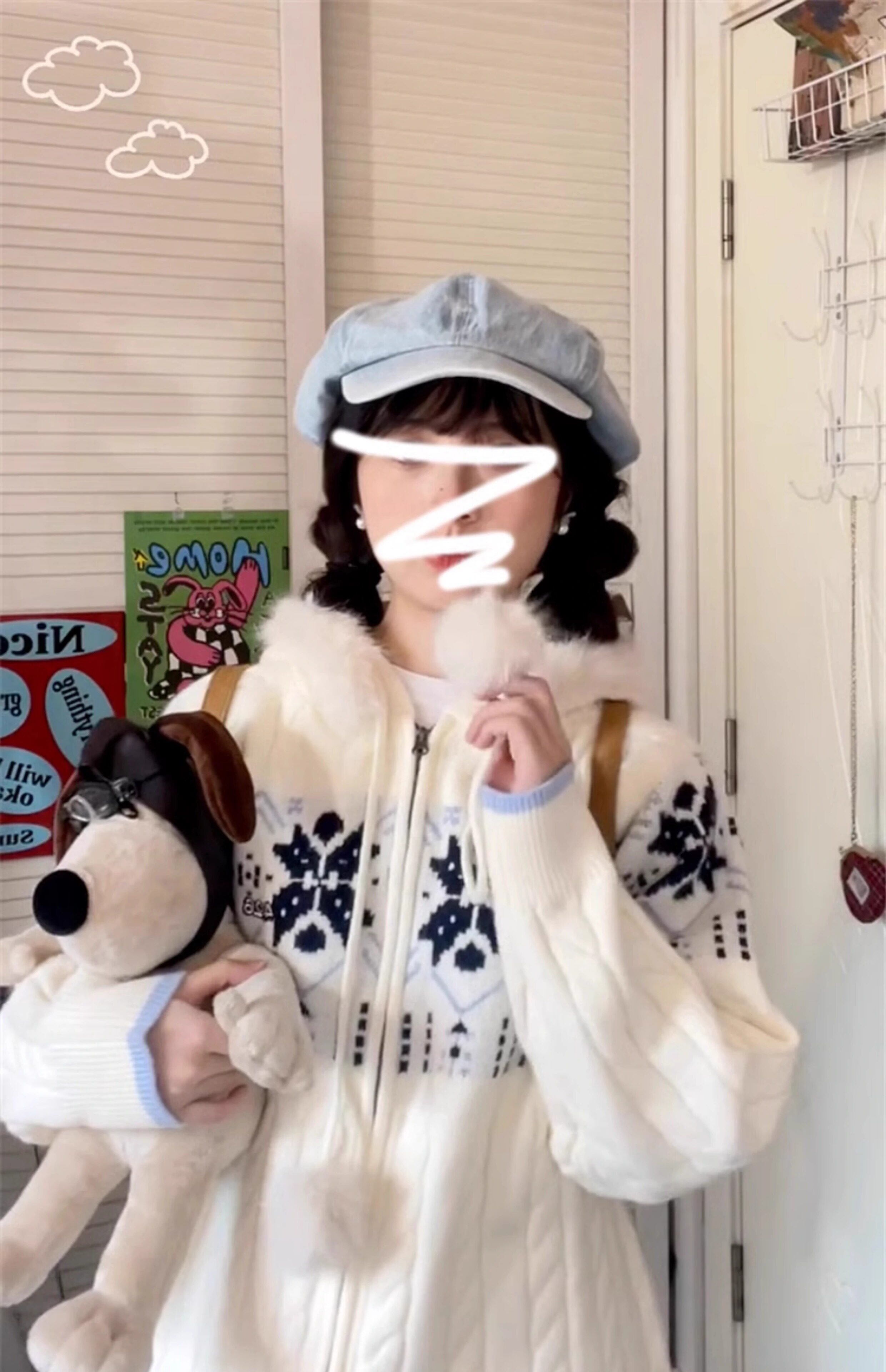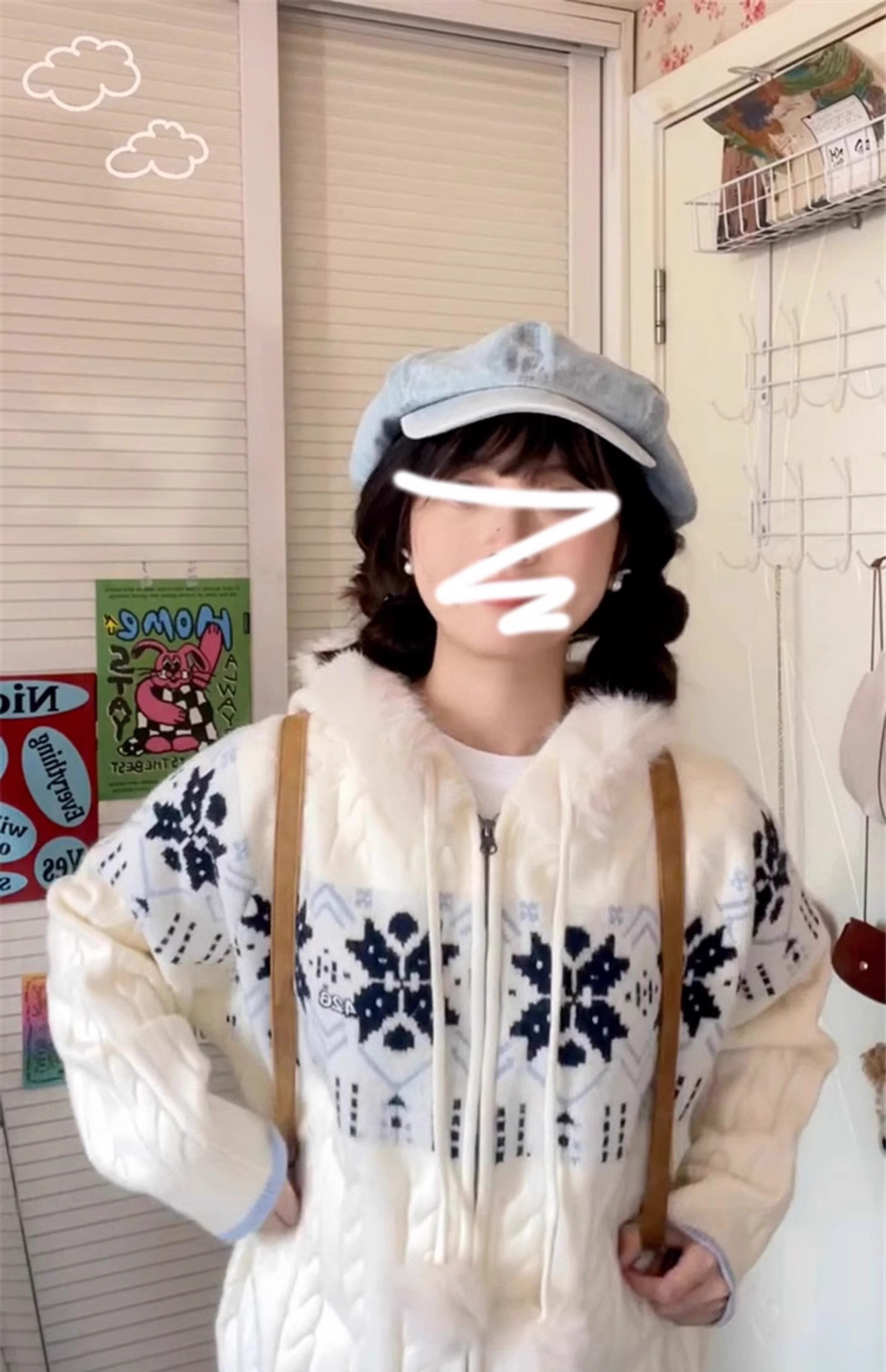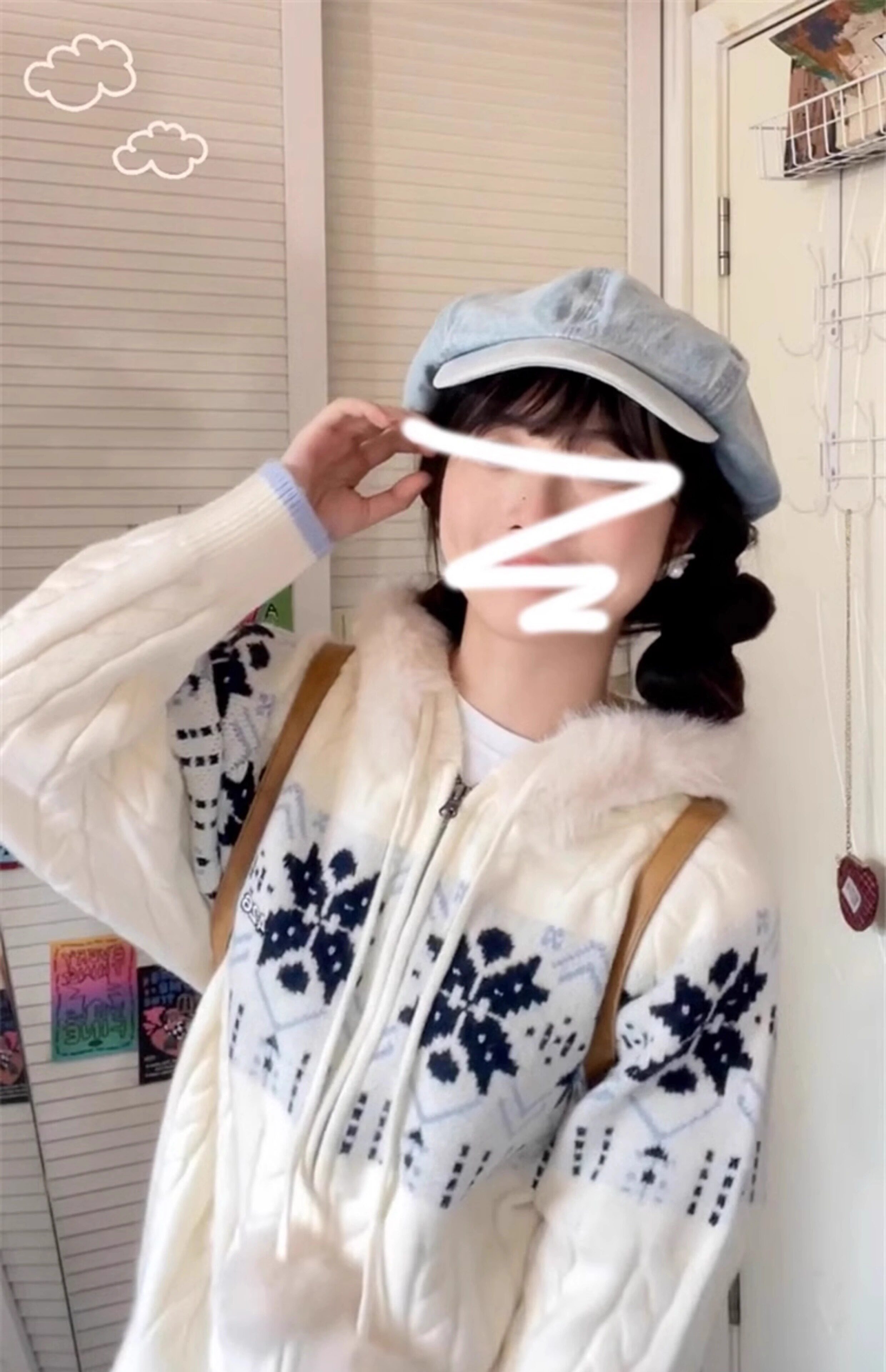 慵懶風藍白色費爾島連帽毛衣外套女秋冬季2025年新款寬松針織開衫