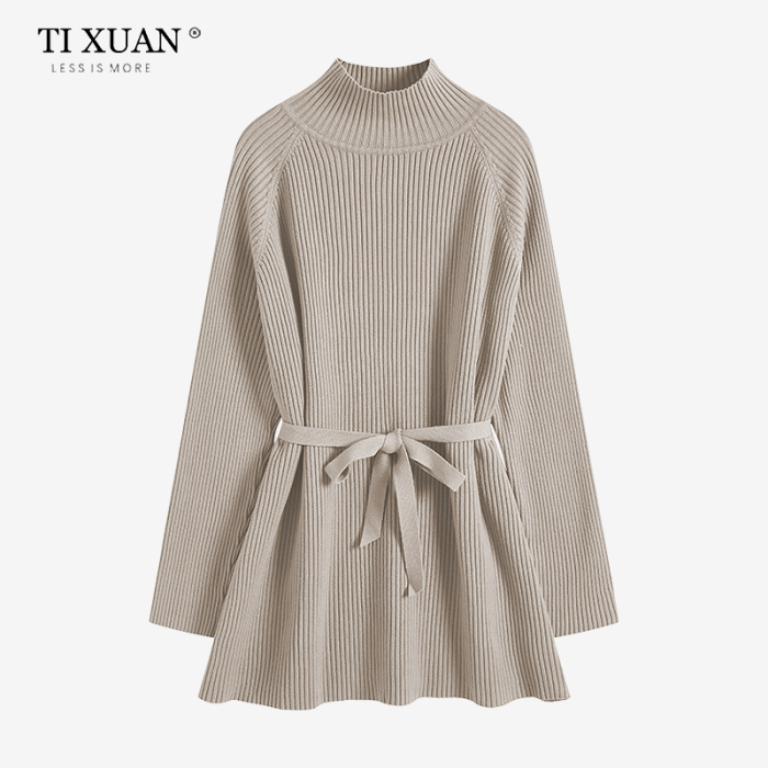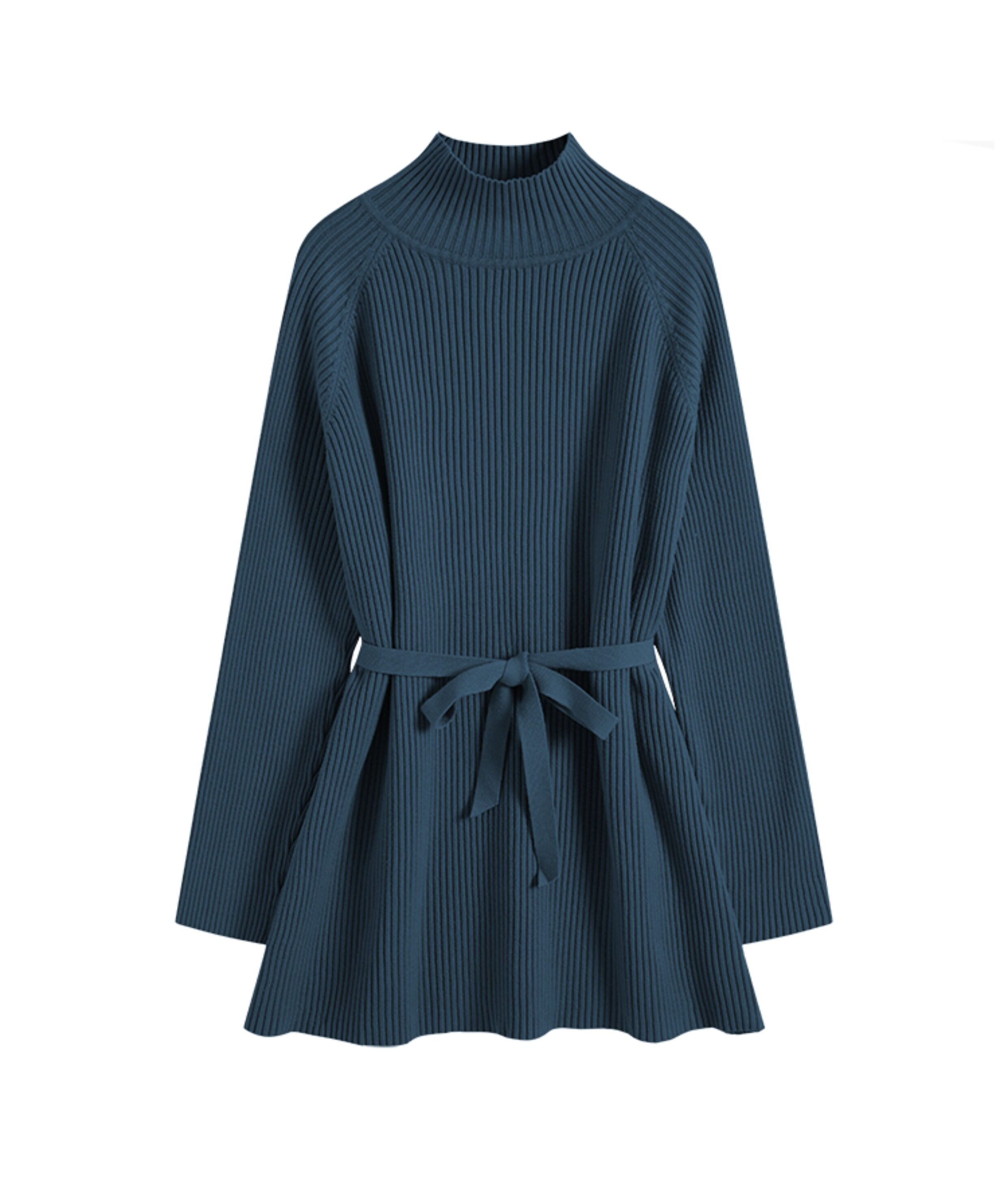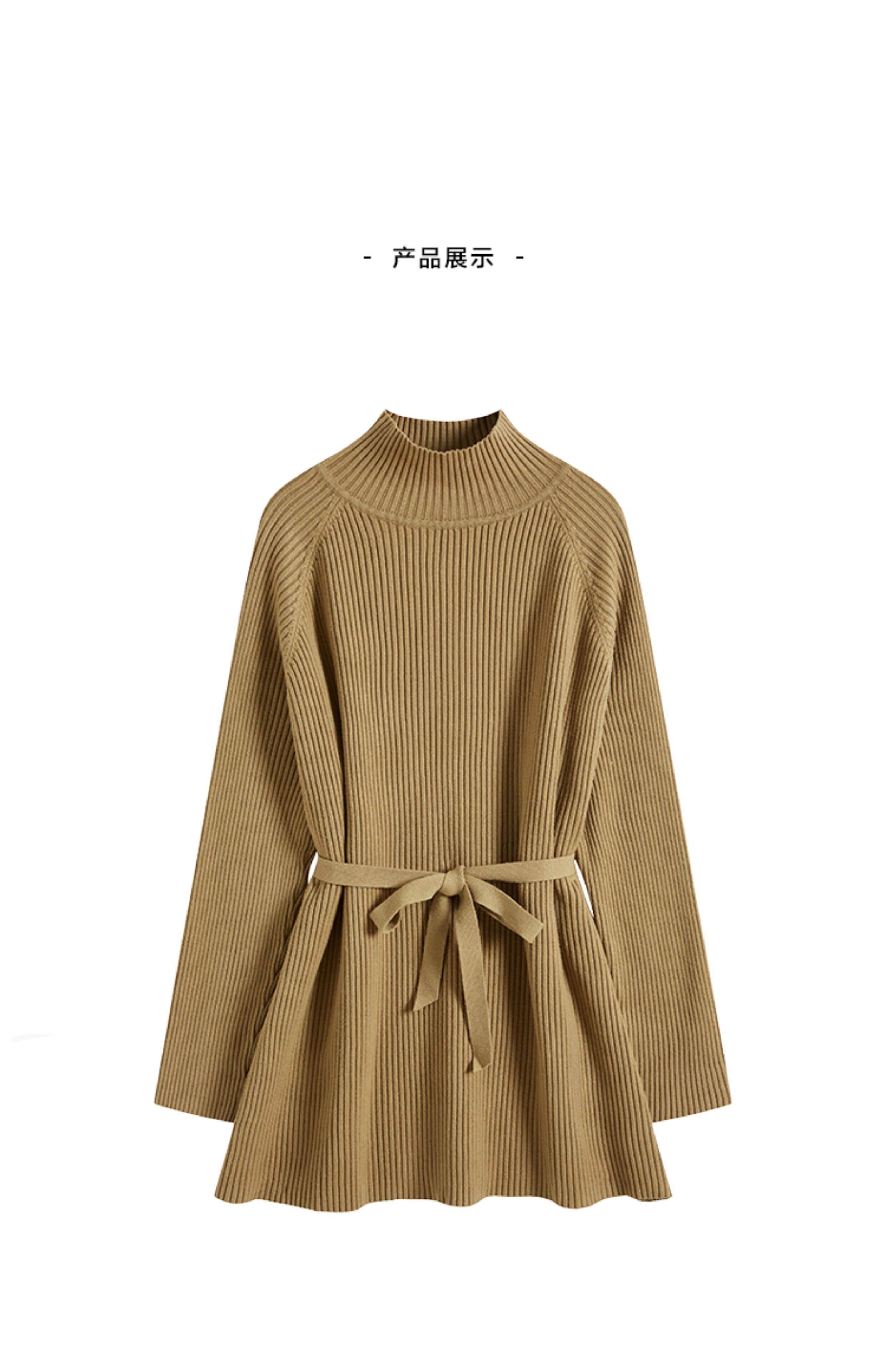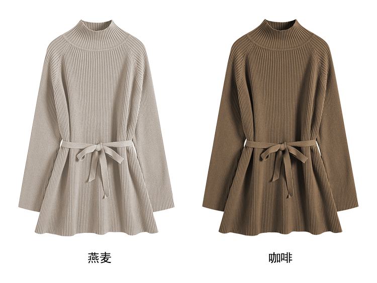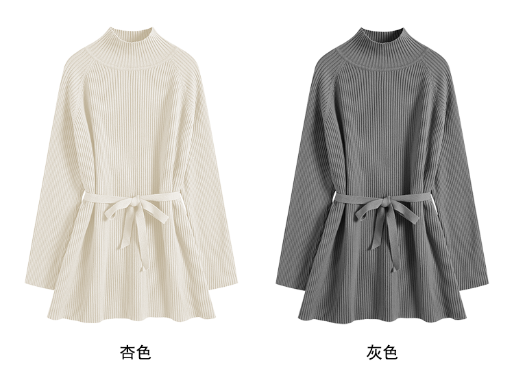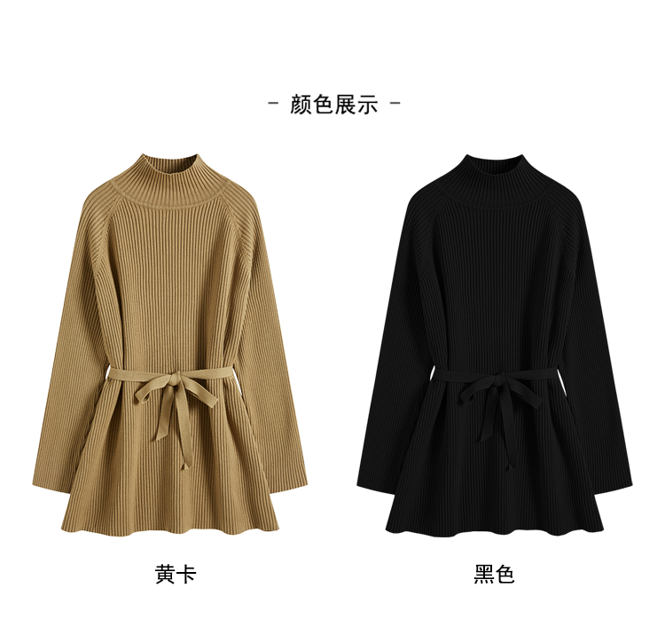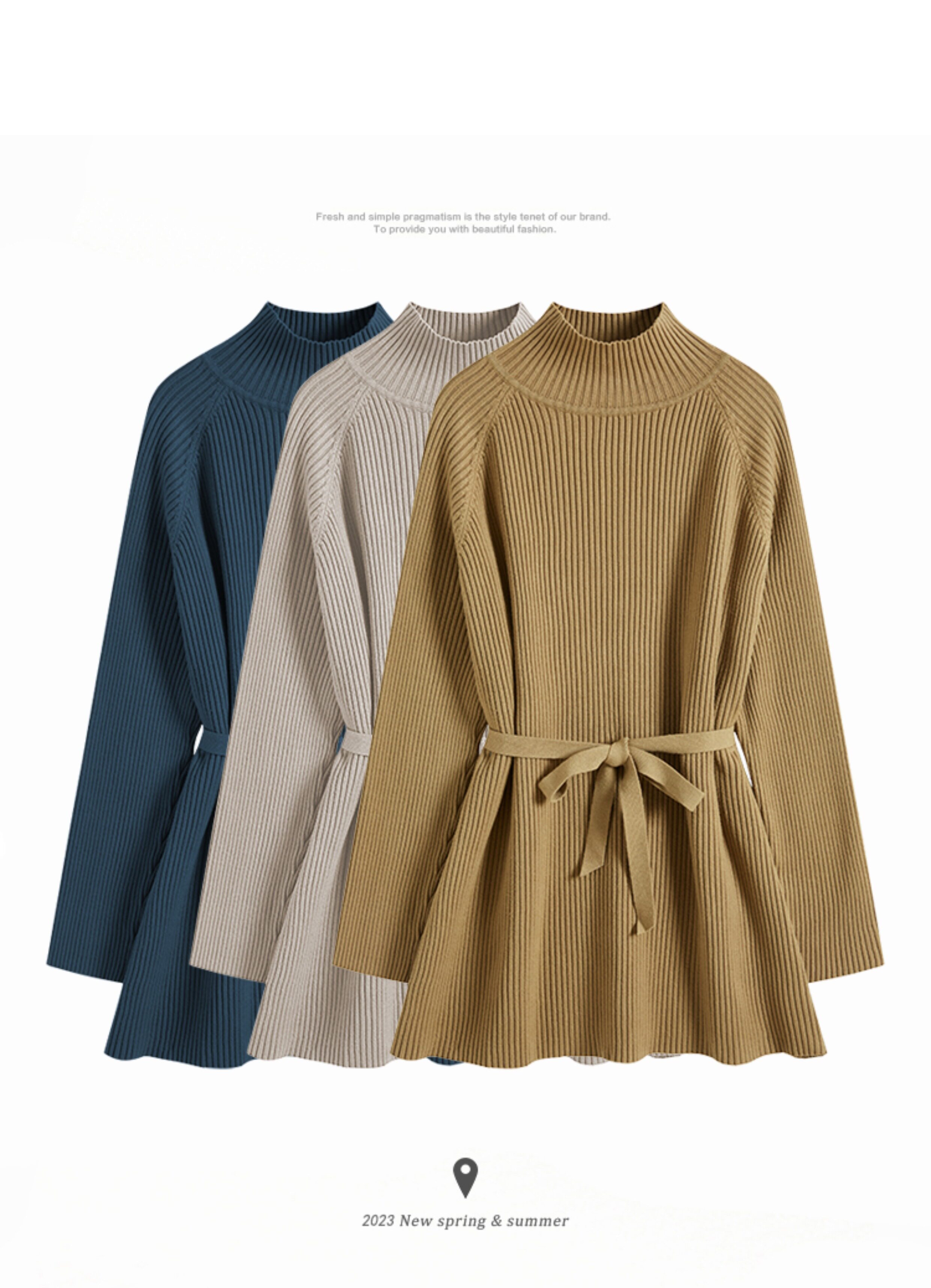 秋冬韓系氣質半高領系帶寬松遮屁股顯瘦中長款針織打底衫毛衣裙子